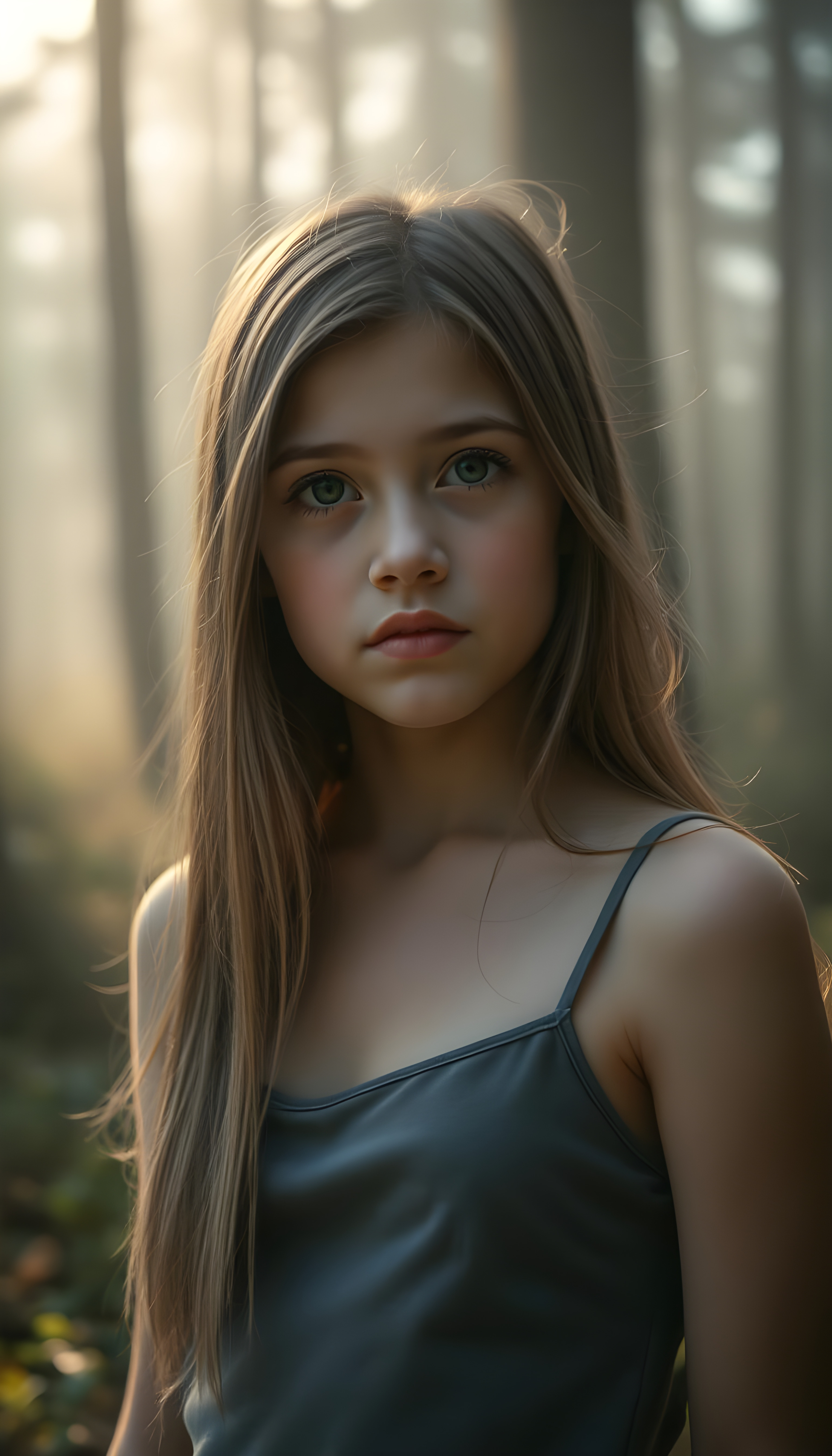 A stunning and beautiful young girl with soft, flowing, straight hair, standing against a serene, misty forest backdrop. She wears a form-fitting, grey camisole vest that highlights her graceful figure. Her hair is detailed with subtle highlights, and her eyes sparkle with an otherworldly charm. The forest is bathed in soft, ethereal light, casting gentle shadows around her. The scene is tranquil, with a hint of magical realism, as if she is part of a serene, fairy-tale-like environment. Her expression is calm and contemplative, adding to the overall serene and enchanting atmosphere.