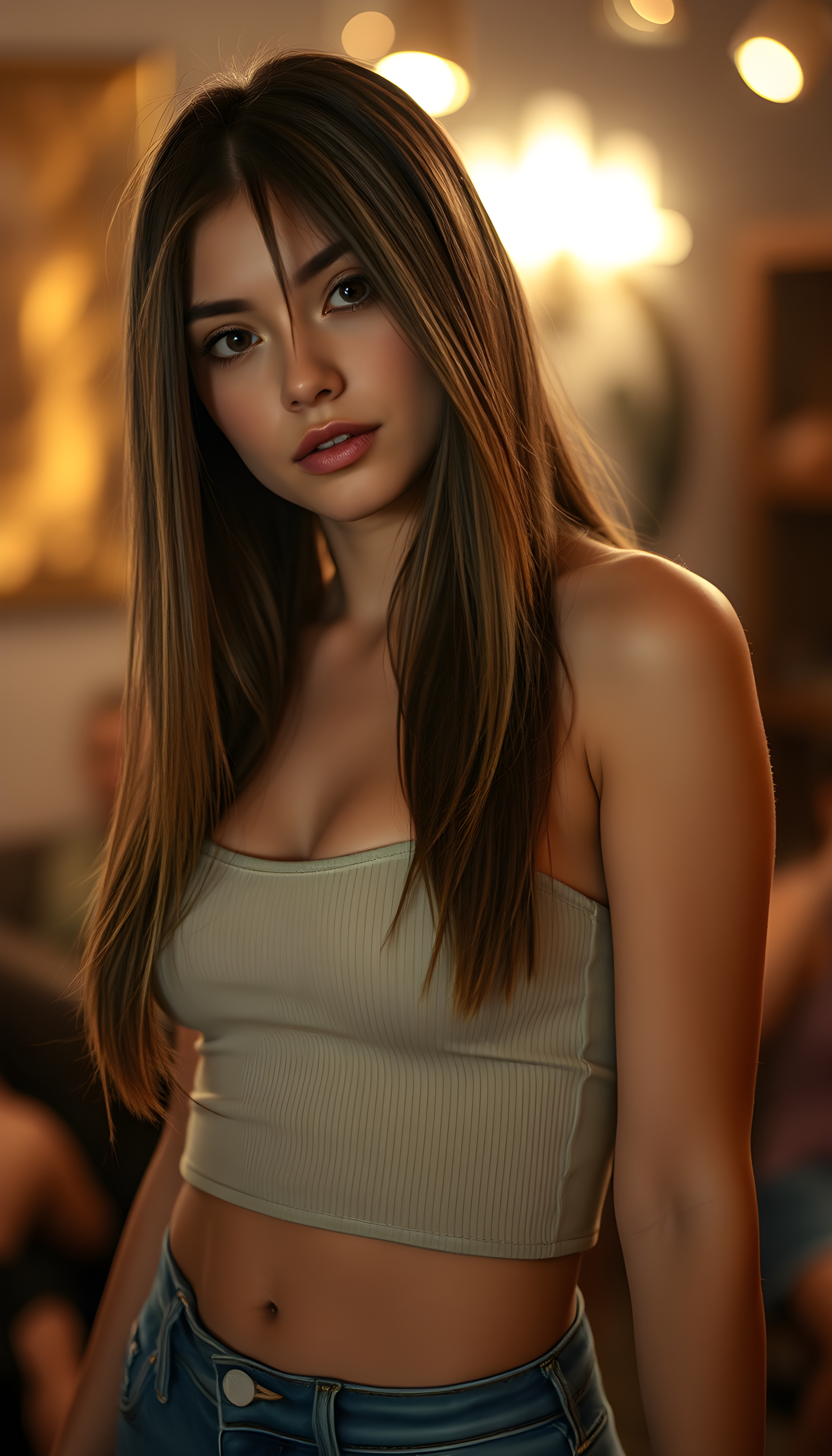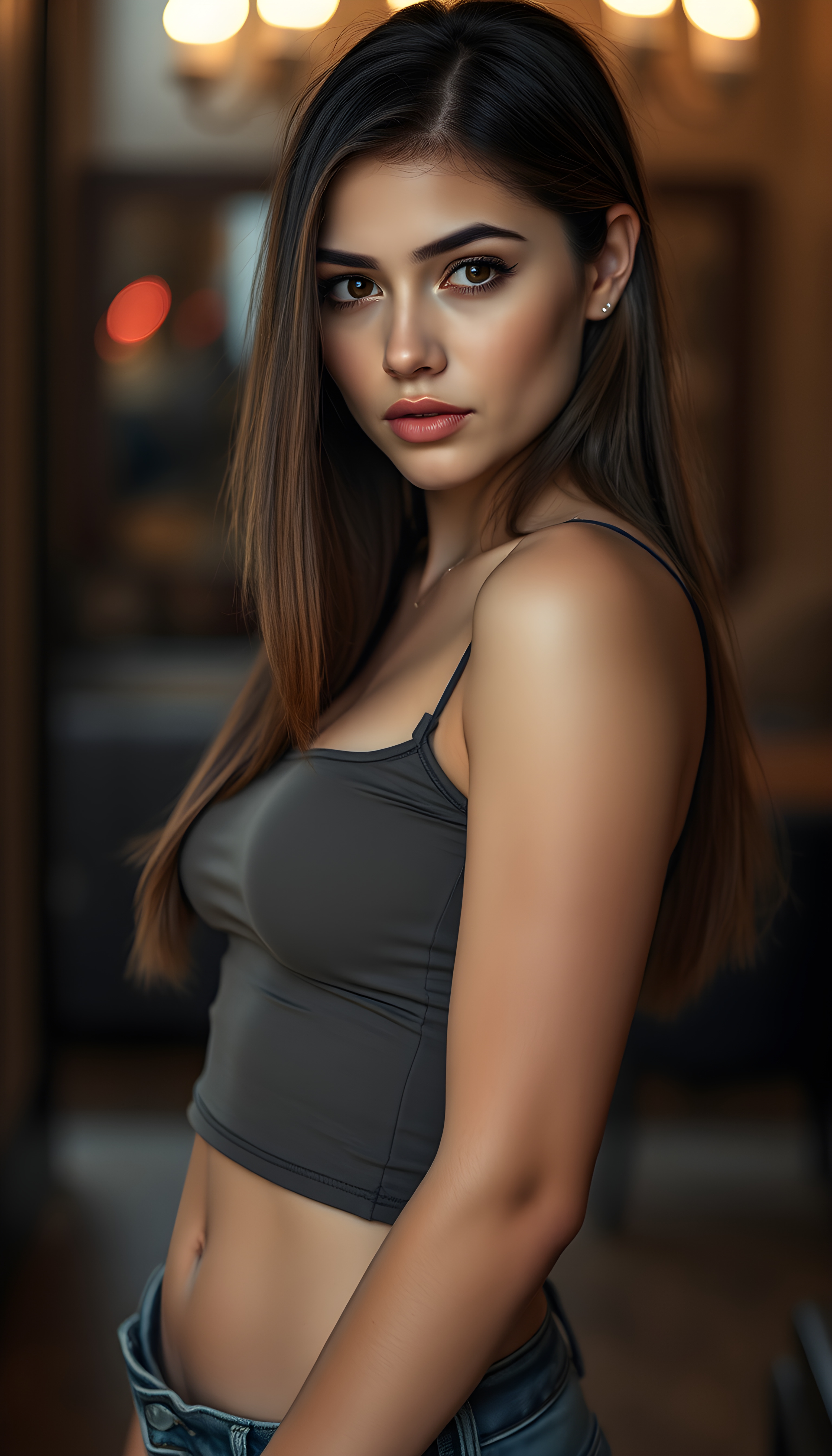 A nice, pretty well busty girlie posed seductive, with straight shoulder length, silky hair left and right the same length, full, plump lips, a round face, large, round, sparkling amber eyes, and round cheeks. She looks very innocent and she has a wonderful feminine body and wears a short, tight minimal tank top that perfectly accentuates her figure. She wears short, tight jeans and has tanned legs.