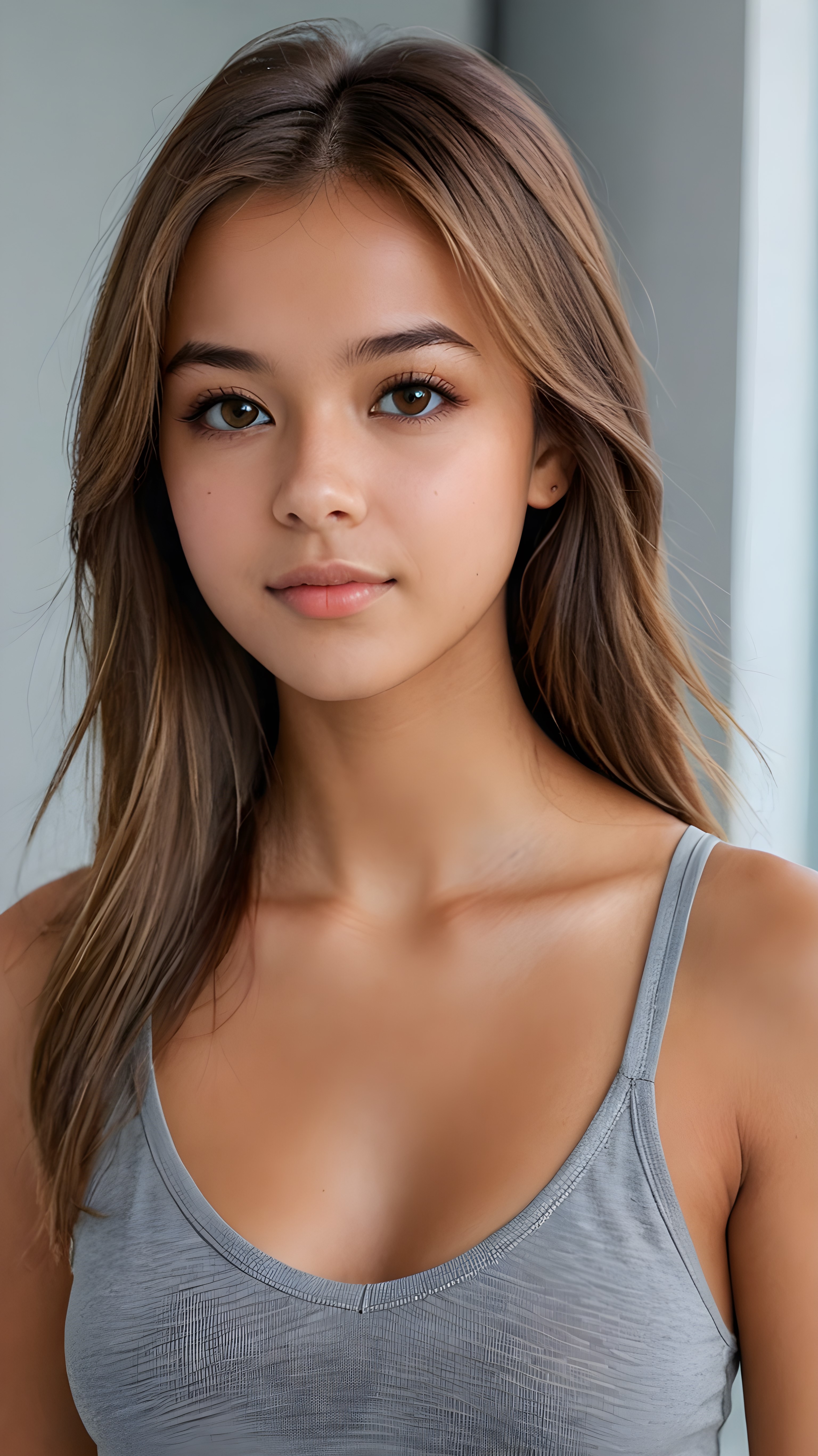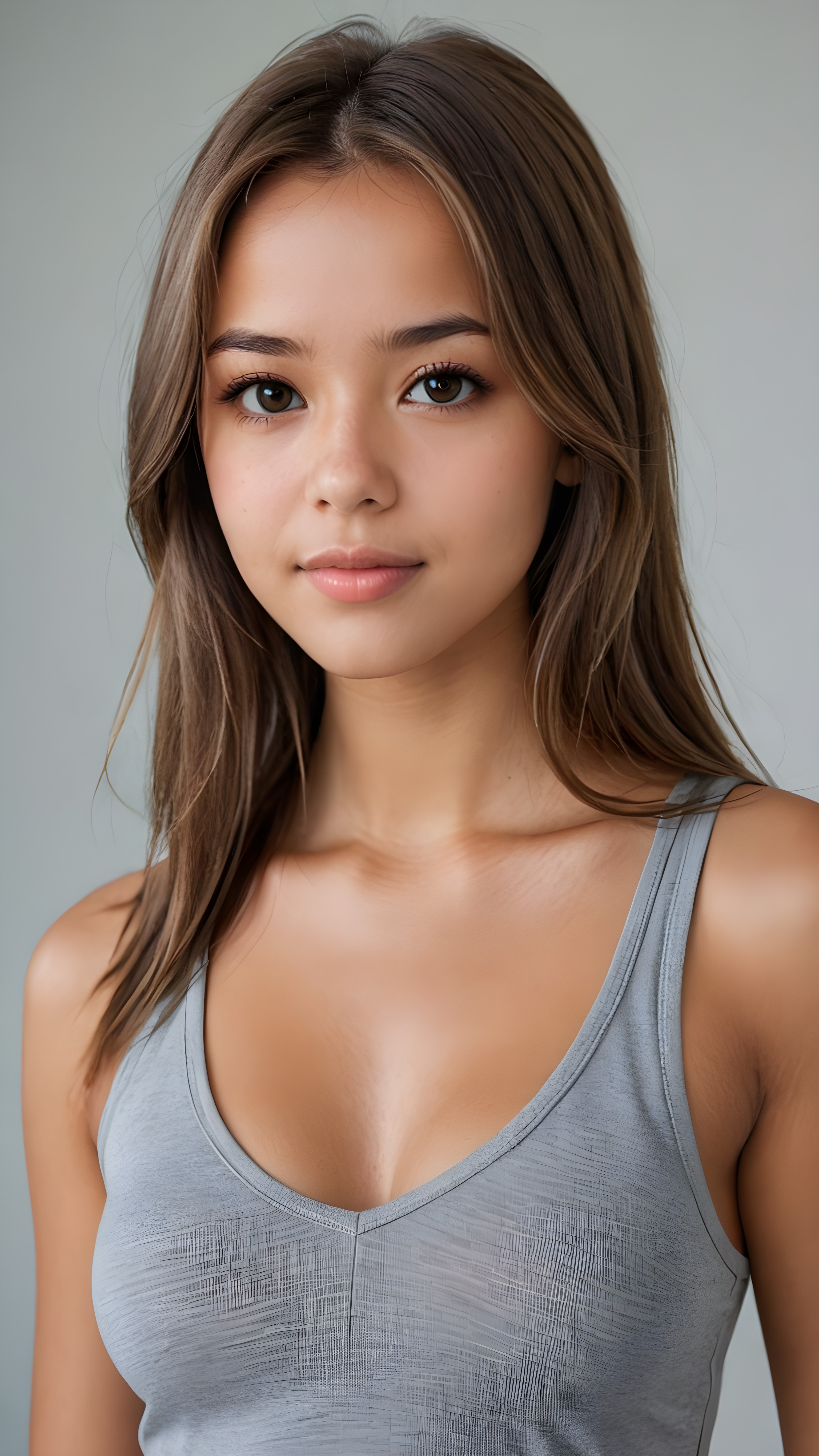 a ((detailed and realistic portrait)) of (((cute and gorgeous))) ((long, straight light brown jet hair)) ((stunning)) a beautifully ((tanned teen girl)), bangs cut frame her face, angelic round face, full kissable lips, ((brown eye)) looks at the camera, perfect curved body, (wears a super short tight (grey tank top, deep v-neck, open front) made of plain latex), white background, side view, ((no background)), cinematic dimmed light