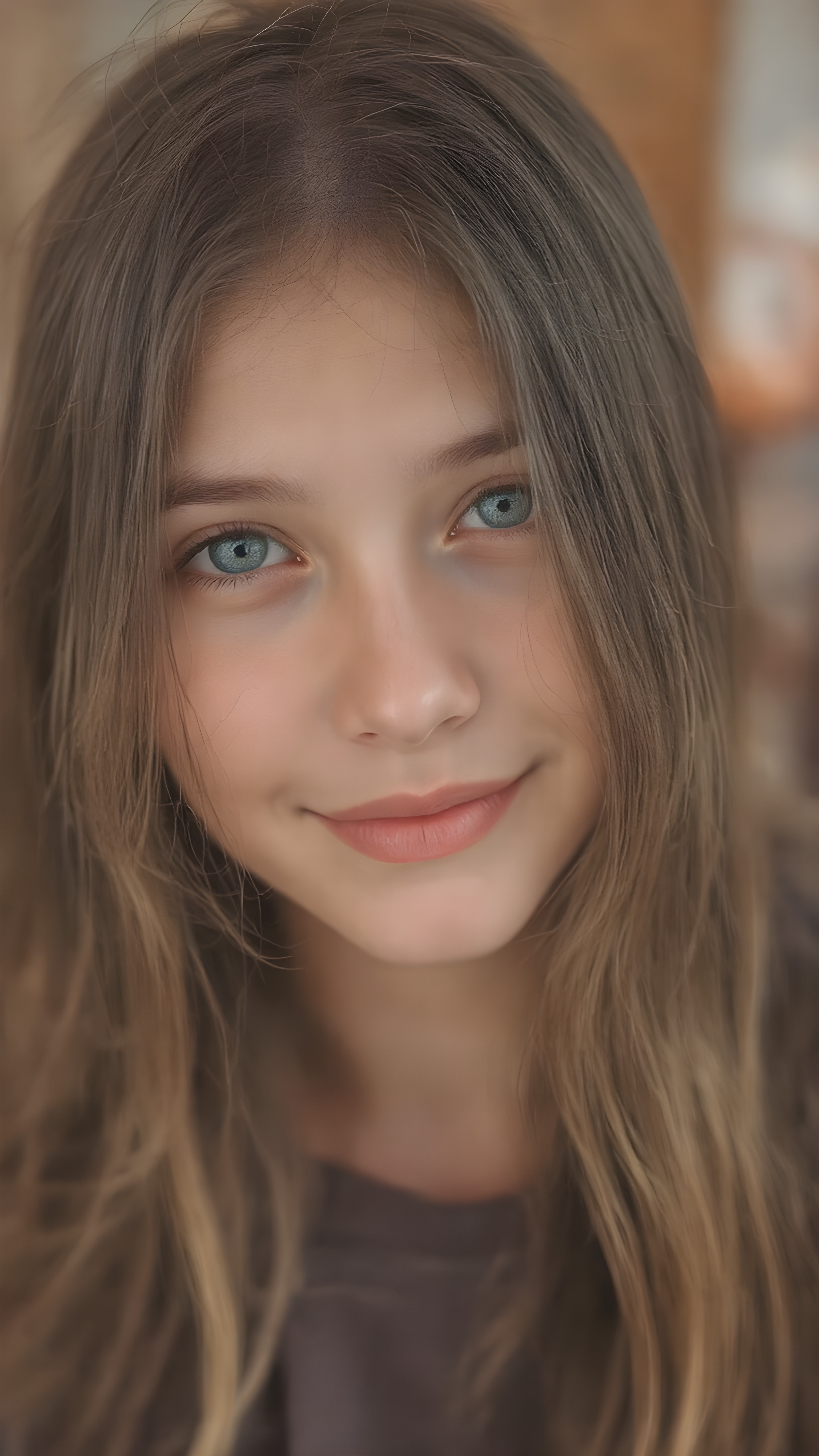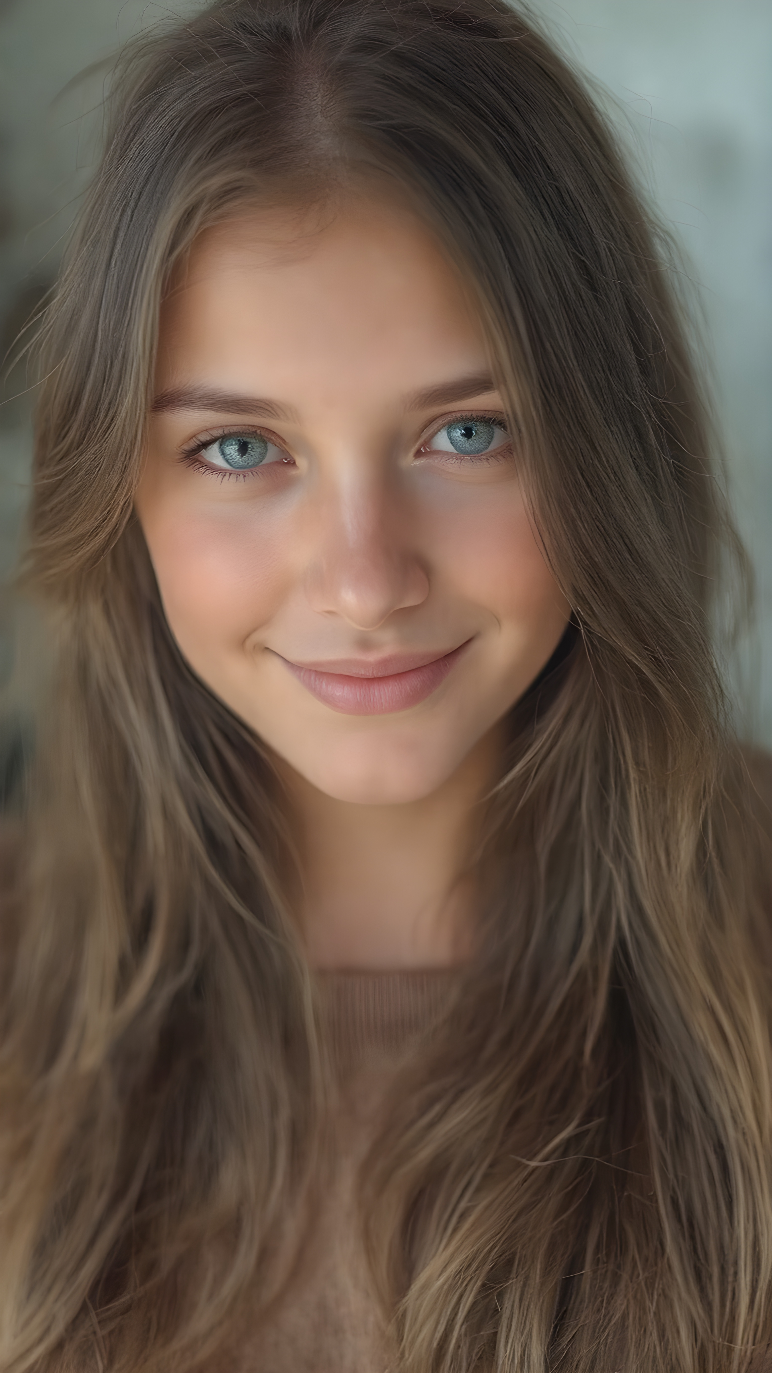the most beautiful girl with delicate facial features, charming smile, and brightly colored eyes that sparkle like jewels. Her long, flowing hair cascades gracefully down her back, framing her face in a softly framed portrait. She’s dressed in a stylish, contemporary outfit that showcases her full body elegantly. The scene is simple yet enchanting, with a focus on achieving a high level of detail and clarity. She is smiling beautifully for you.
