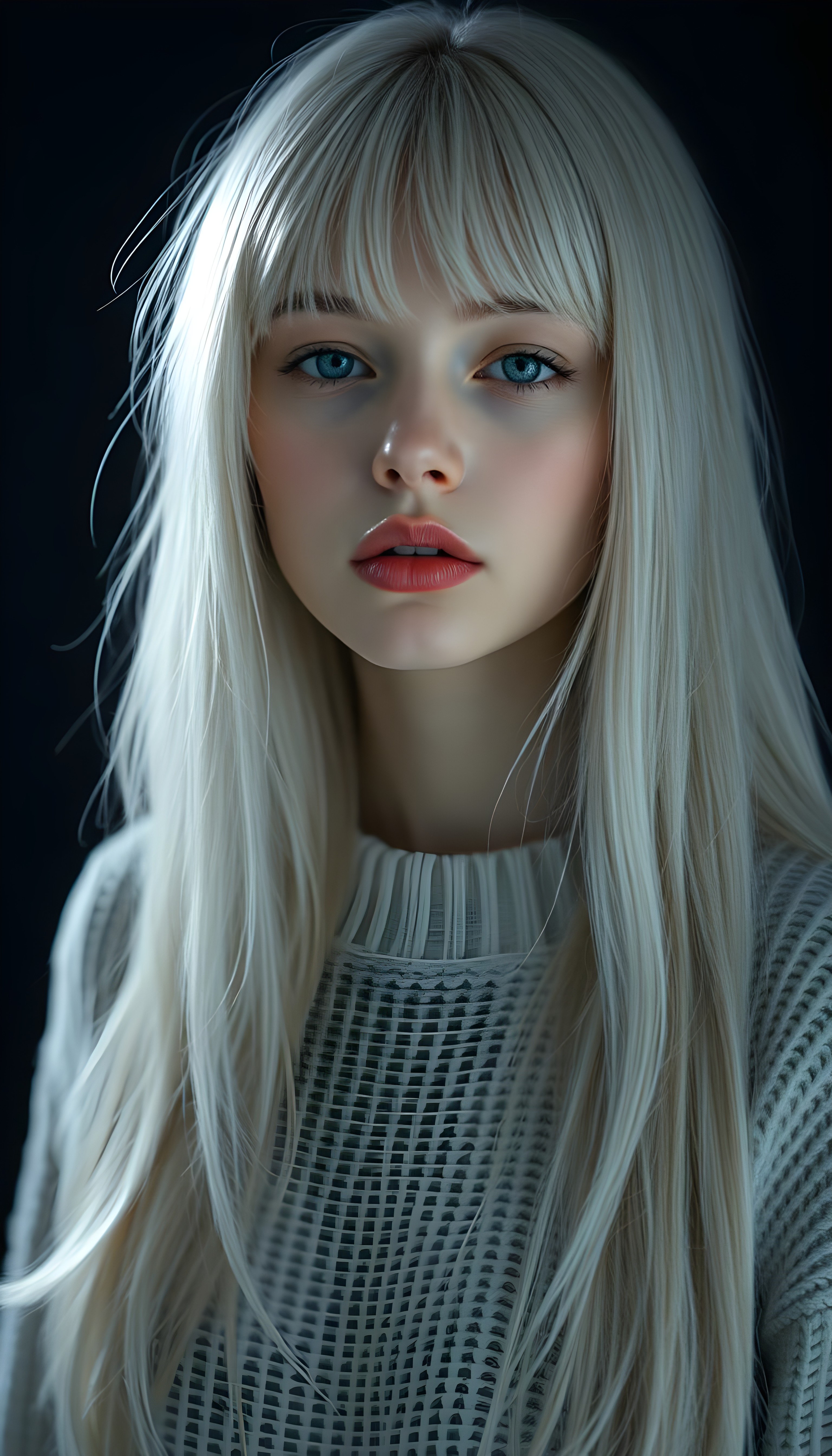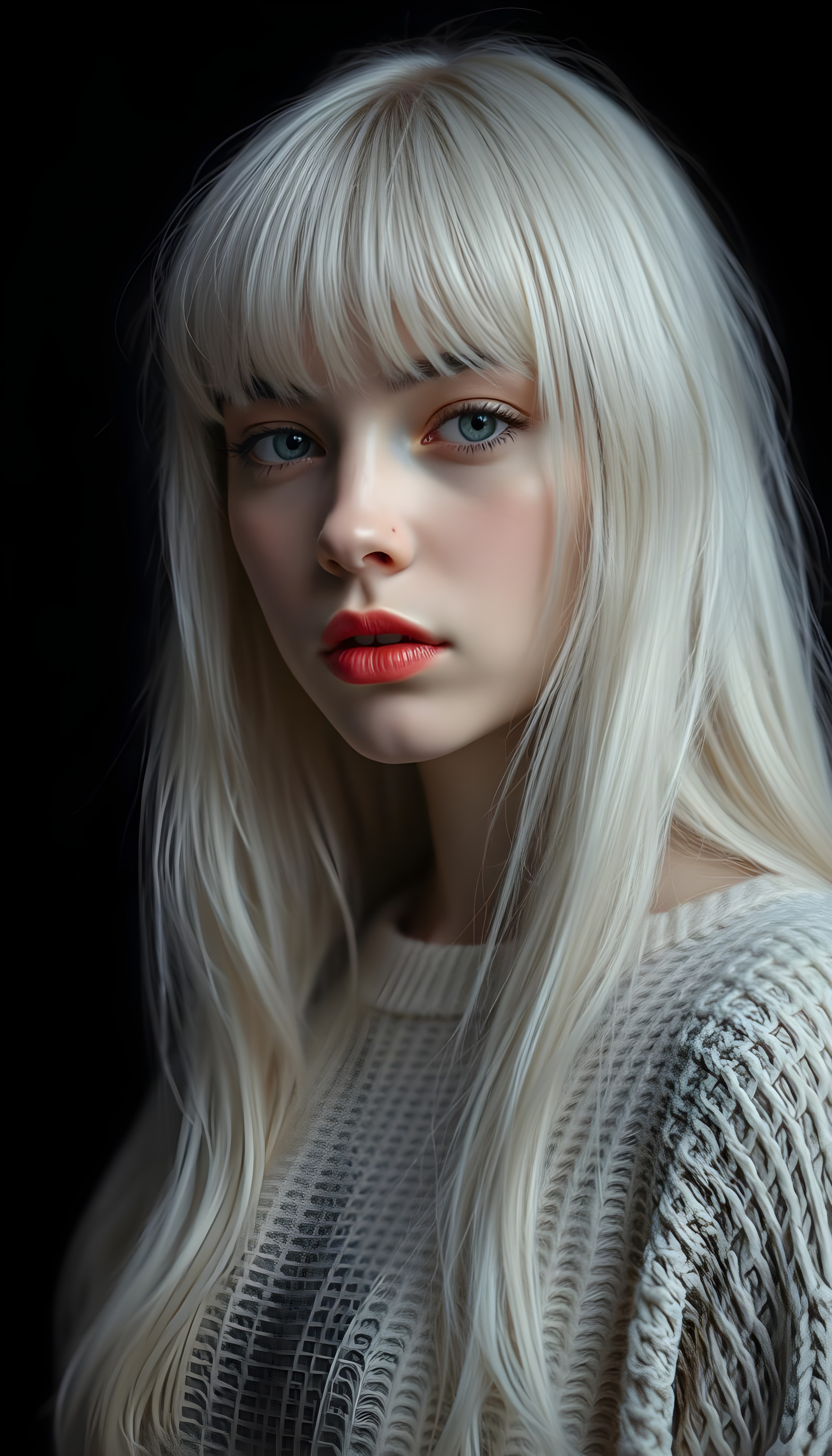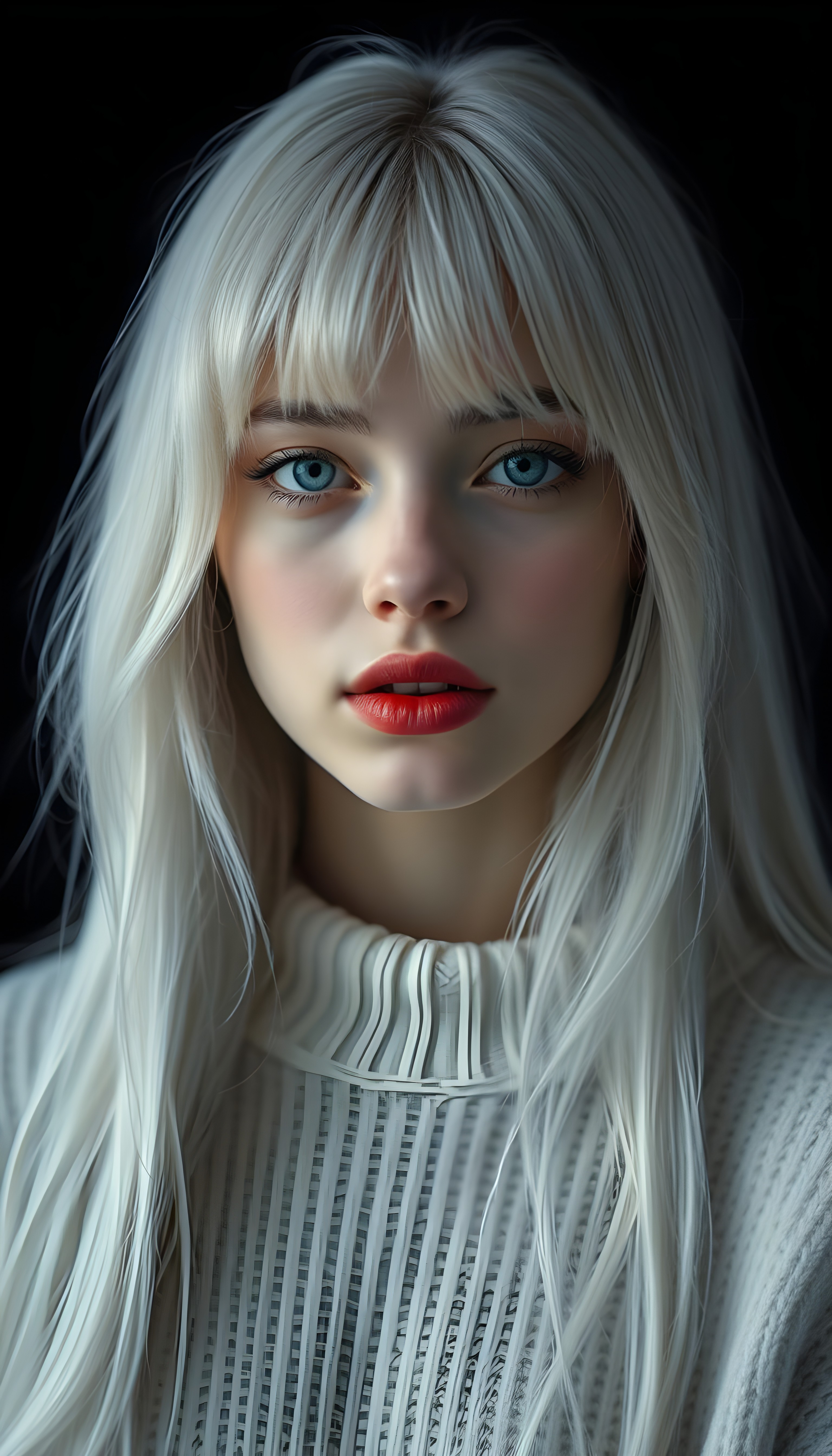 A stunning, high-resolution digital painting of a beautiful young girl with flawless, soft silver skin and long, perfect jet white hair that cascades down her back. Her eyes are large and sparkling, framed by delicate lashes, and her lips are full and pink. She gazes directly into the camera with a warm, inviting smile. The background is a soft gradient of white and pastel colors, creating a dreamy, ethereal atmosphere. The lighting is soft and diffused, highlighting her features and giving her skin a luminous glow. She is dressed in a simple, elegant white dress that complements her ethereal beauty. The composition is balanced, with her face centered and her hair artfully arranged to add depth and texture to the image. The overall style is a blend of realism and fantasy, making her appear both realistic and otherworldly.