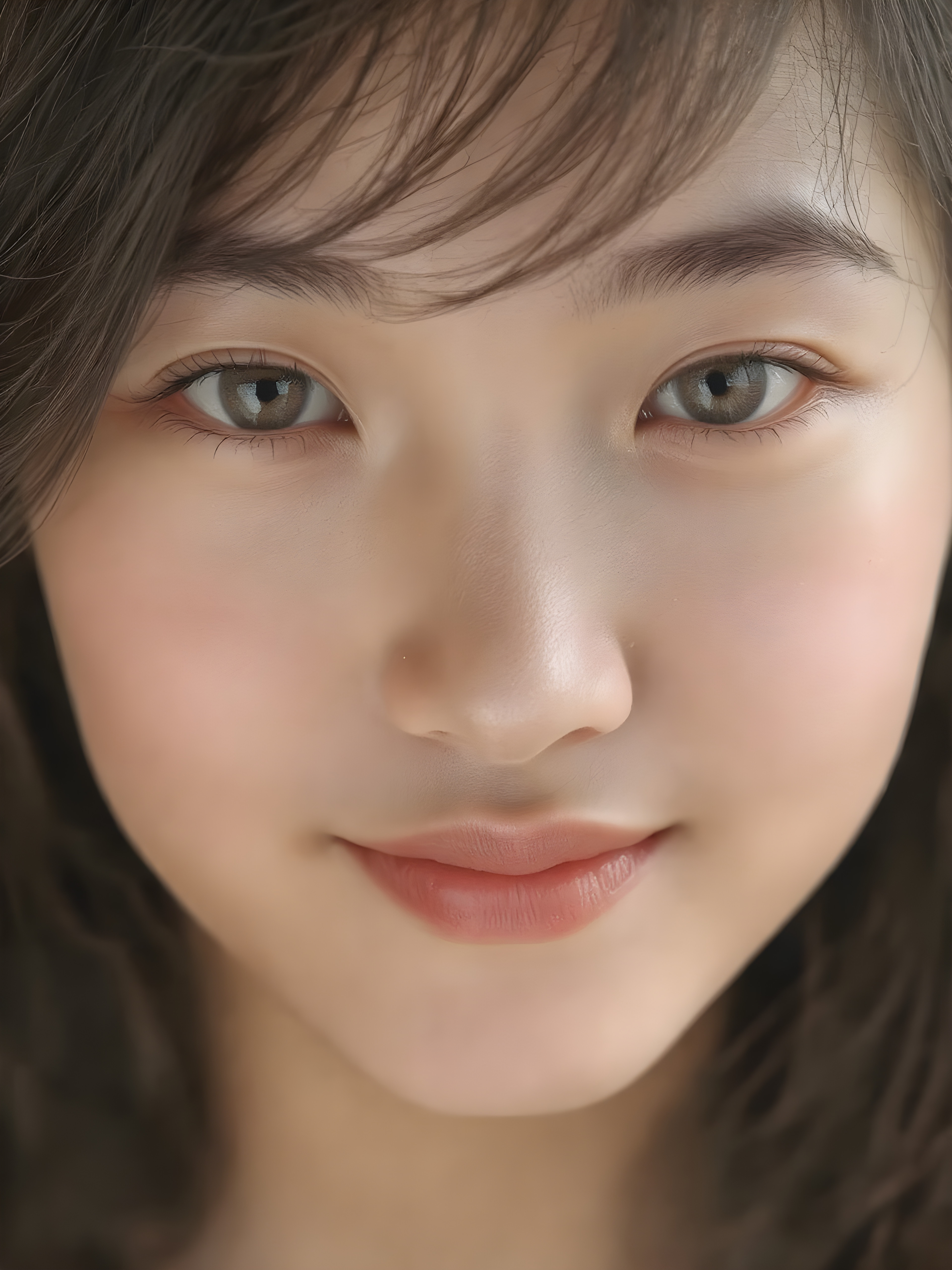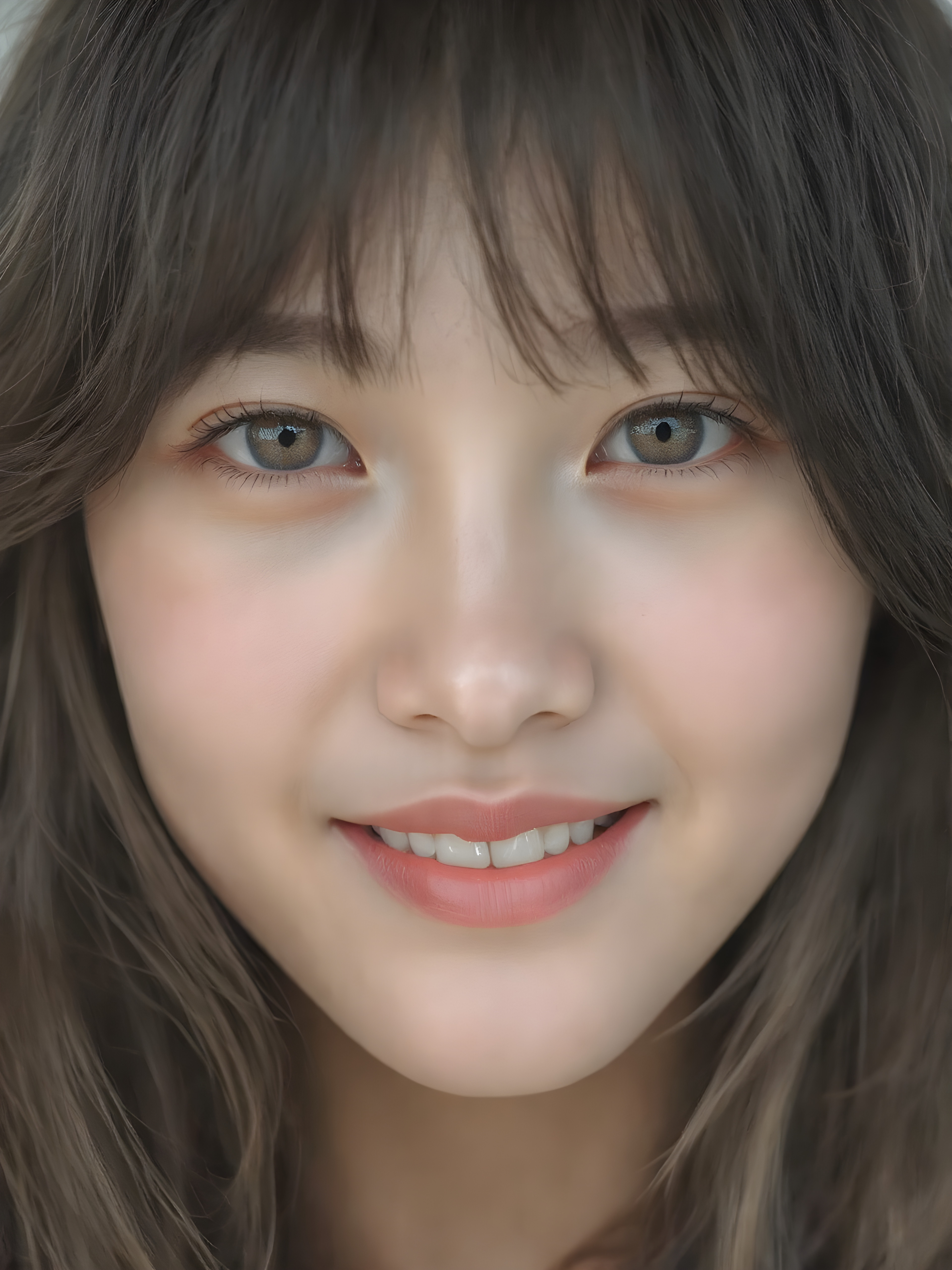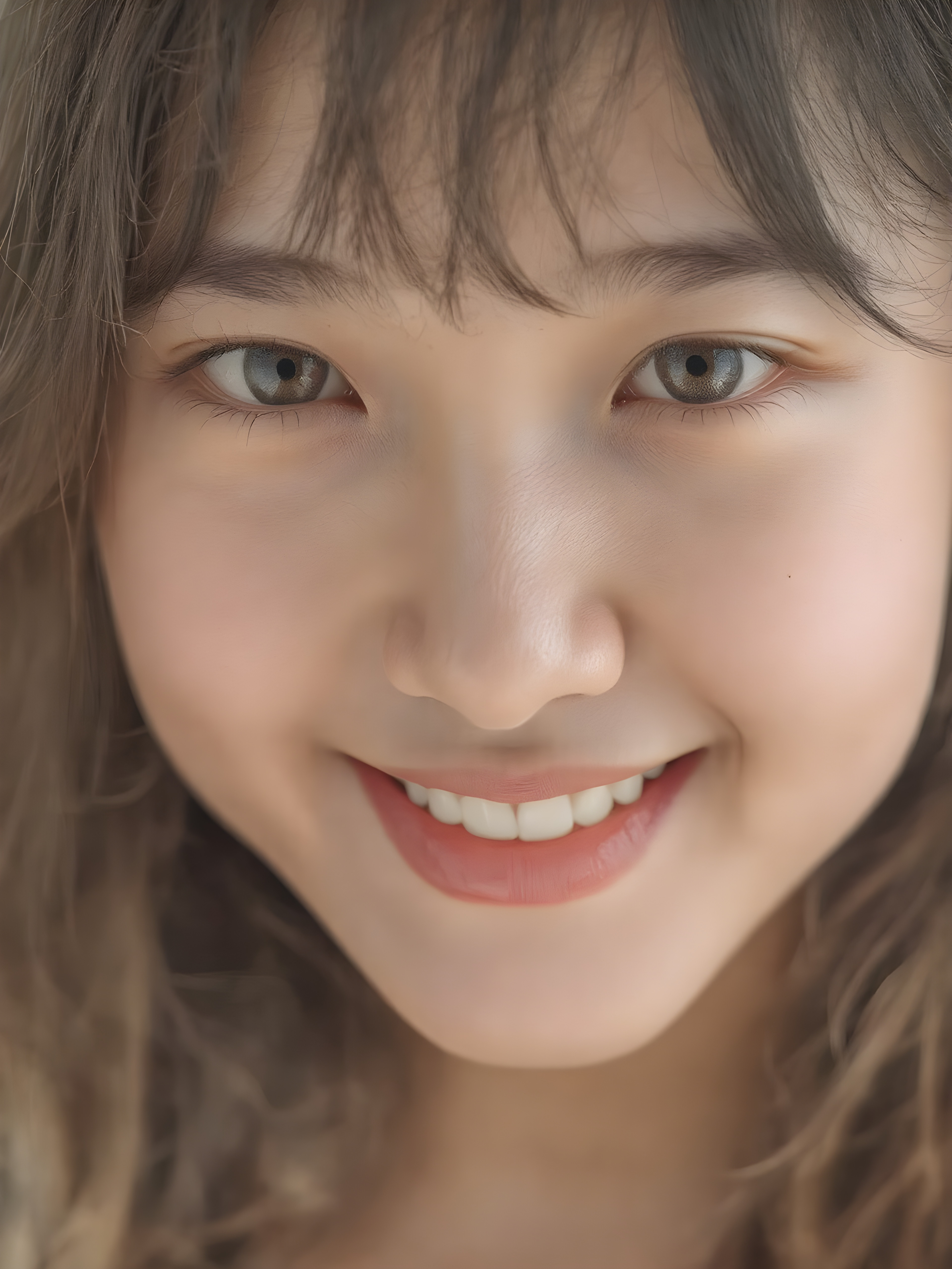 a (((professional photograph))) featuring a beautifully detailed (((face of a Asian teen girl))), with intricate details and colors, (natural, ultra realistic detailed hair) and (realistic detailed eyes) that exude an unmistakable allure, (highly detailed, symmetrical eyes) that match her perfectly coordinated, evenly sized pupils. She’s also got (perfectly matching, coordinated teeth) that add to her overall aesthetic. Looking directly into the camera, she’s got a warm smile and perfect eye coordination, which draws the viewer in. Her ultra realistic, volumetric lighting gives off a (natural, happy glow) that complements her overall look. She’s also got (natural makeup) that enhances her features.