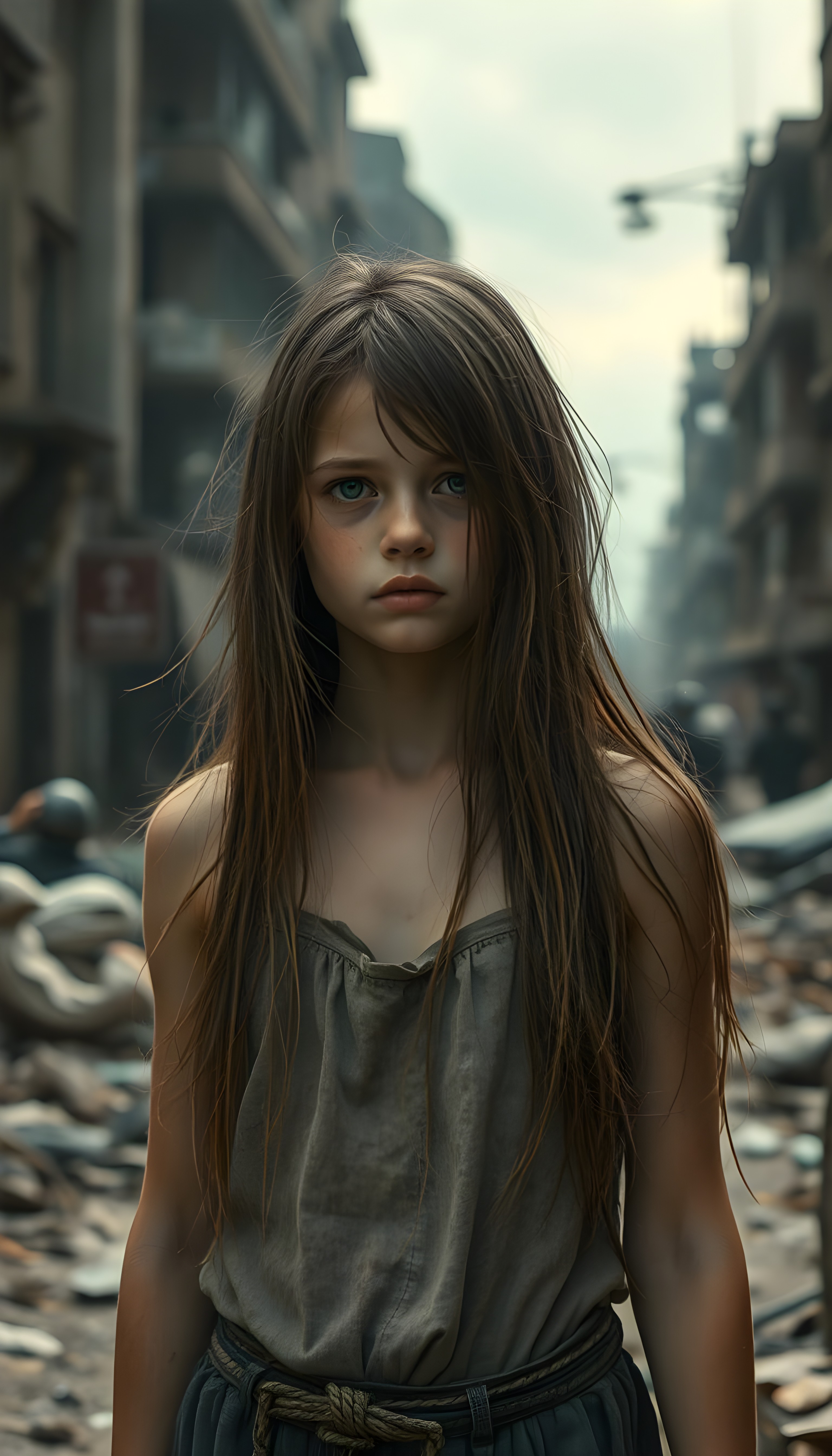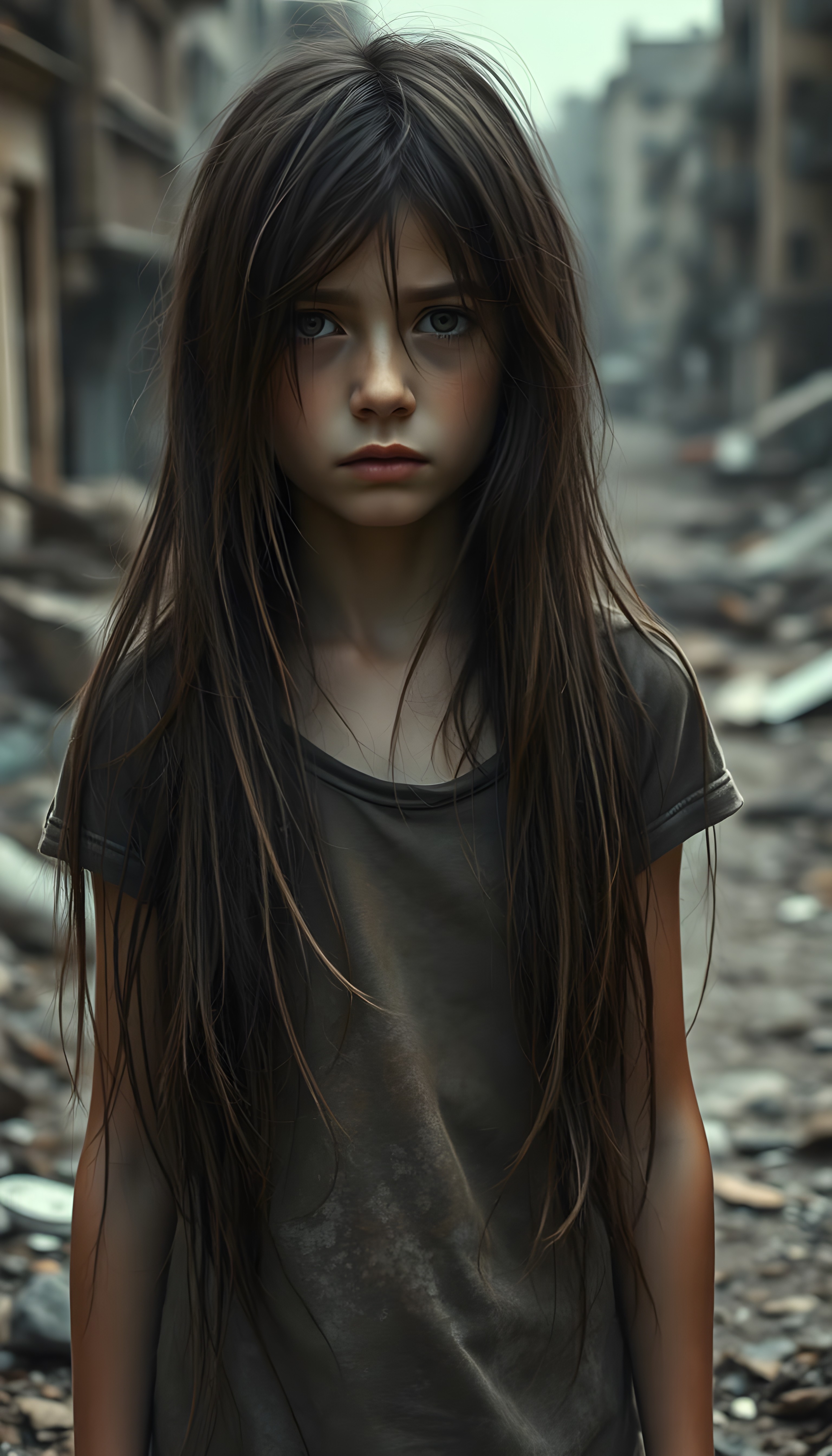 Ein junges Mädchen steht einsam und verlassen in einer von Krieg zerstörten Stadt. Werden solche Bilder noch mit Bildbearbeitungstools aufgewertet, sind sie von echten Fotos nicht mehr zu unterscheiden: