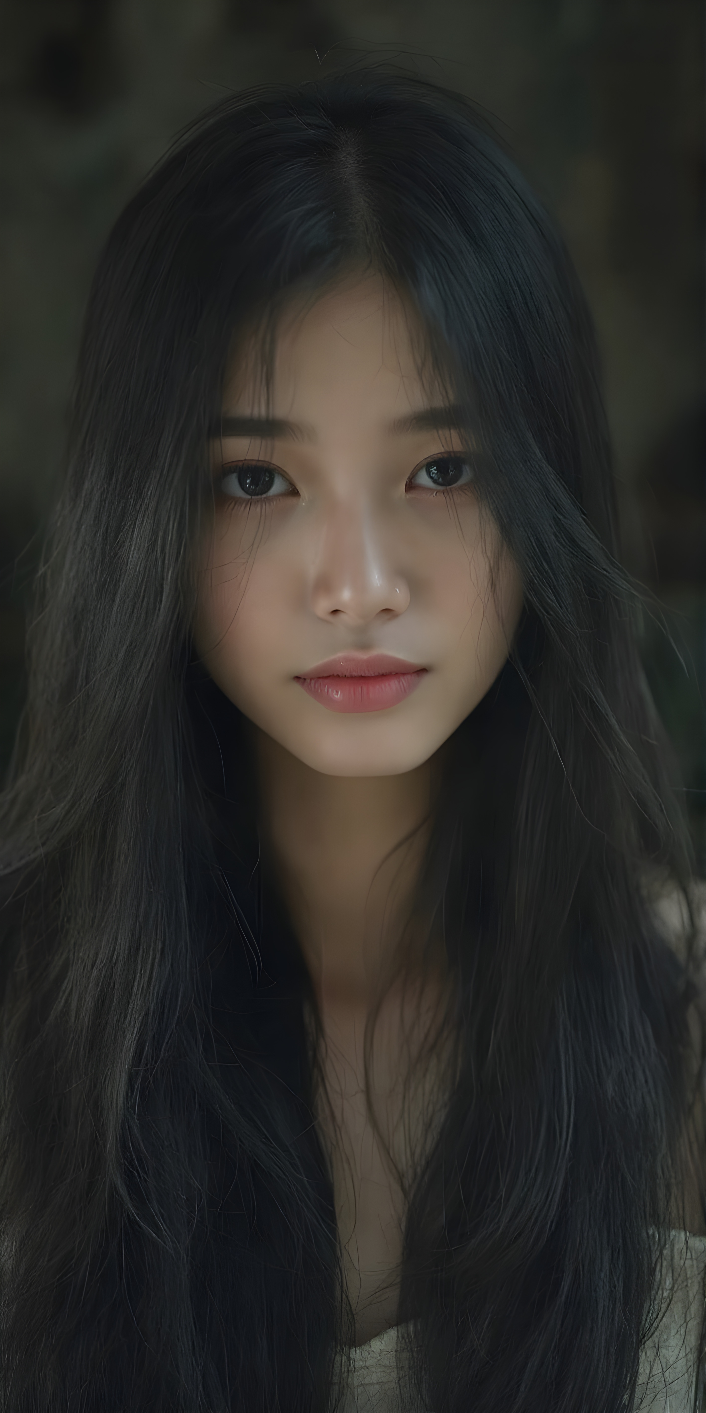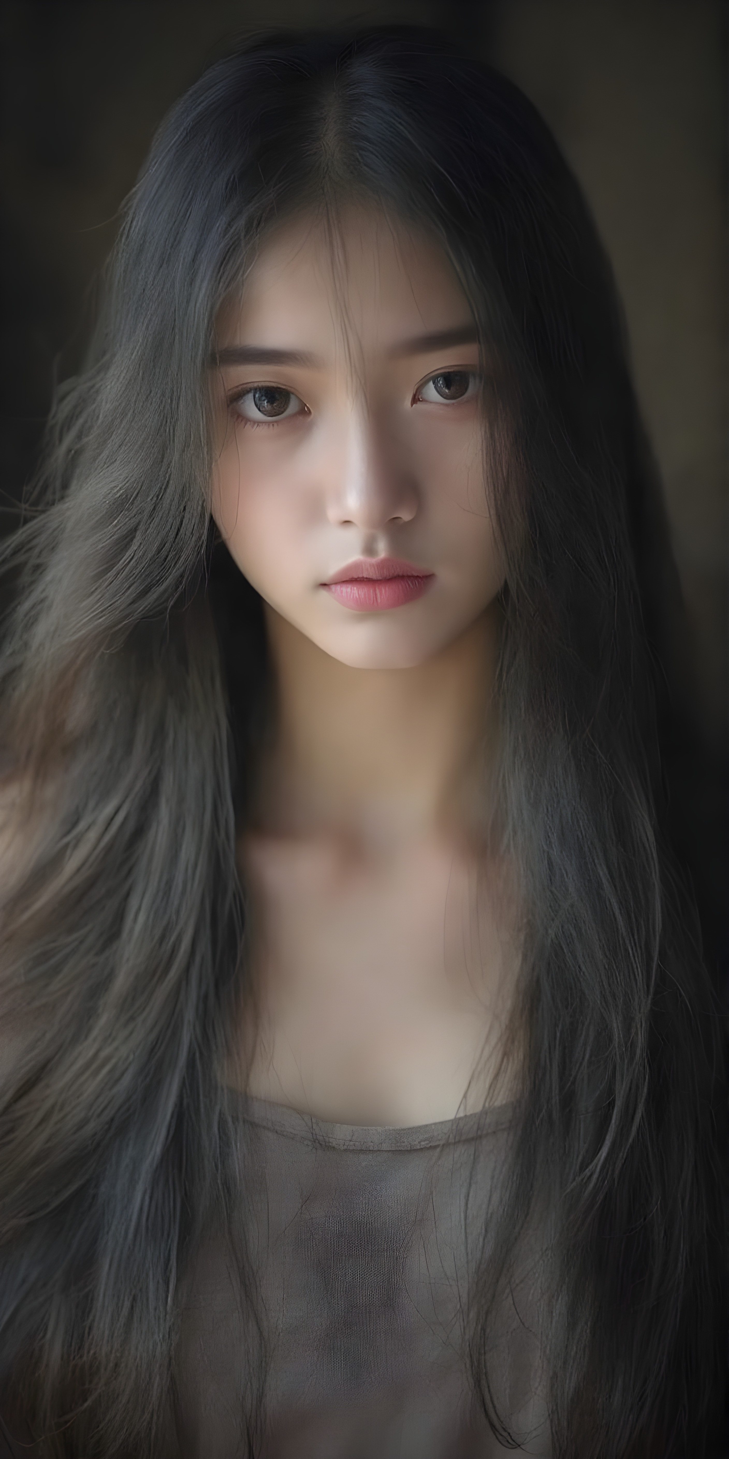 A (((beautiful Asian teen girl))), with (((extremely long, flowing black hair))) that flows down to her shoulders and cascades down her back in a (((dainty, layered waterfall manner))), paired with (((black irises))), (((pale skin))), and (((a full, cherry mouth))), all posed together in a (((mystical setting))) where the light takes on a magical quality, as if emanating from her features, creating a breathtakingly beautiful image that exudes a sense of otherworldliness (((upper body portrait)))