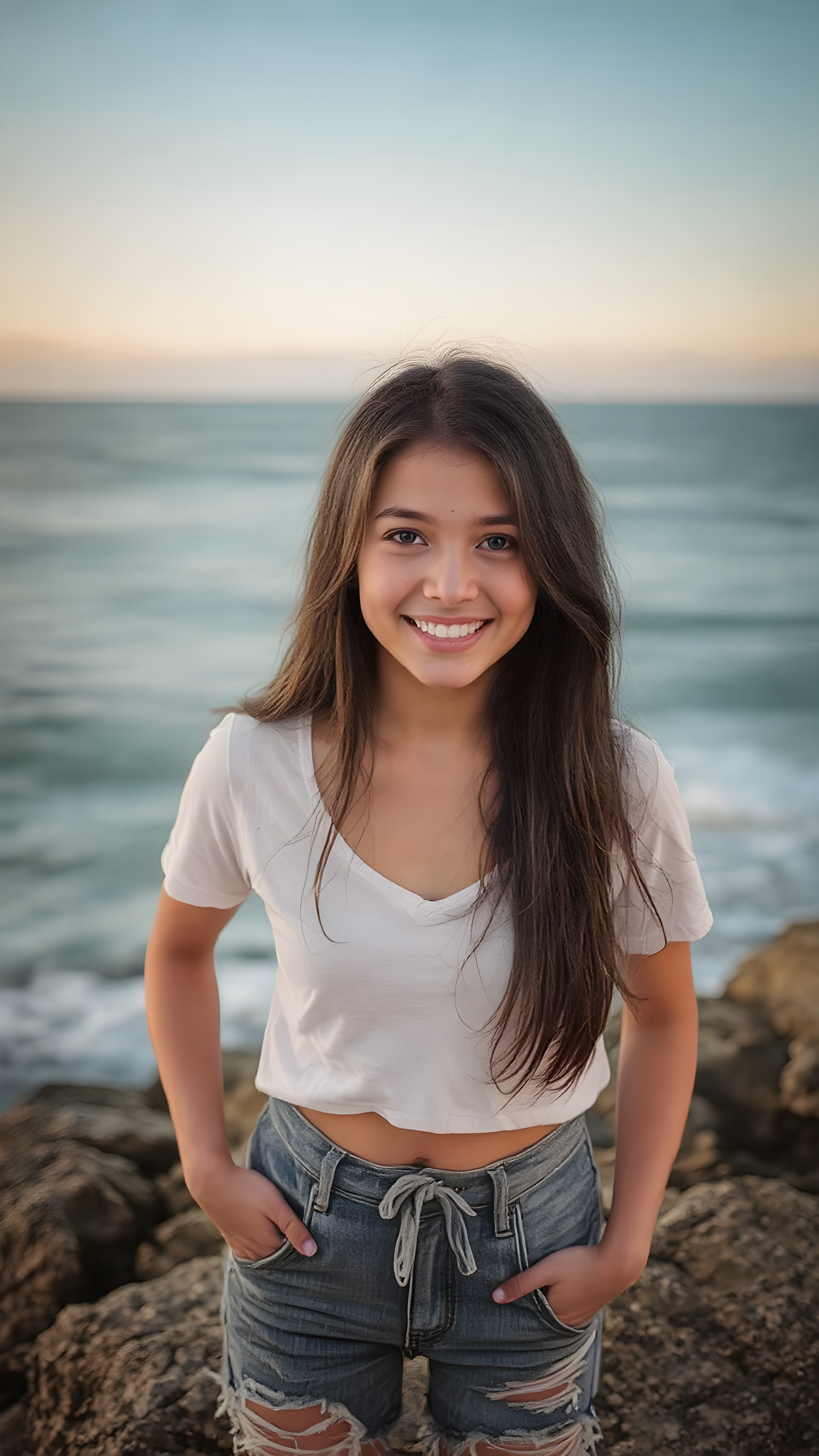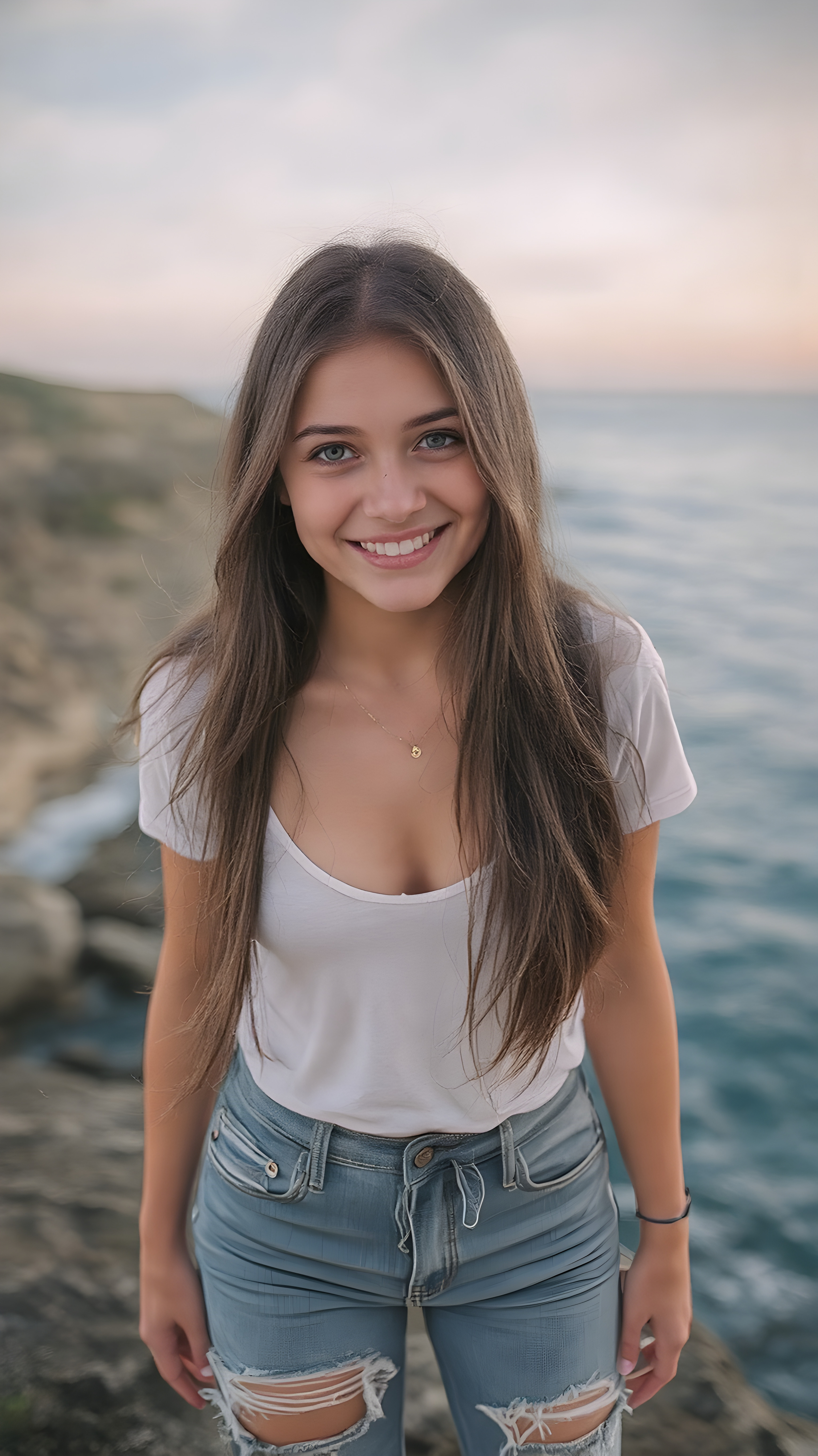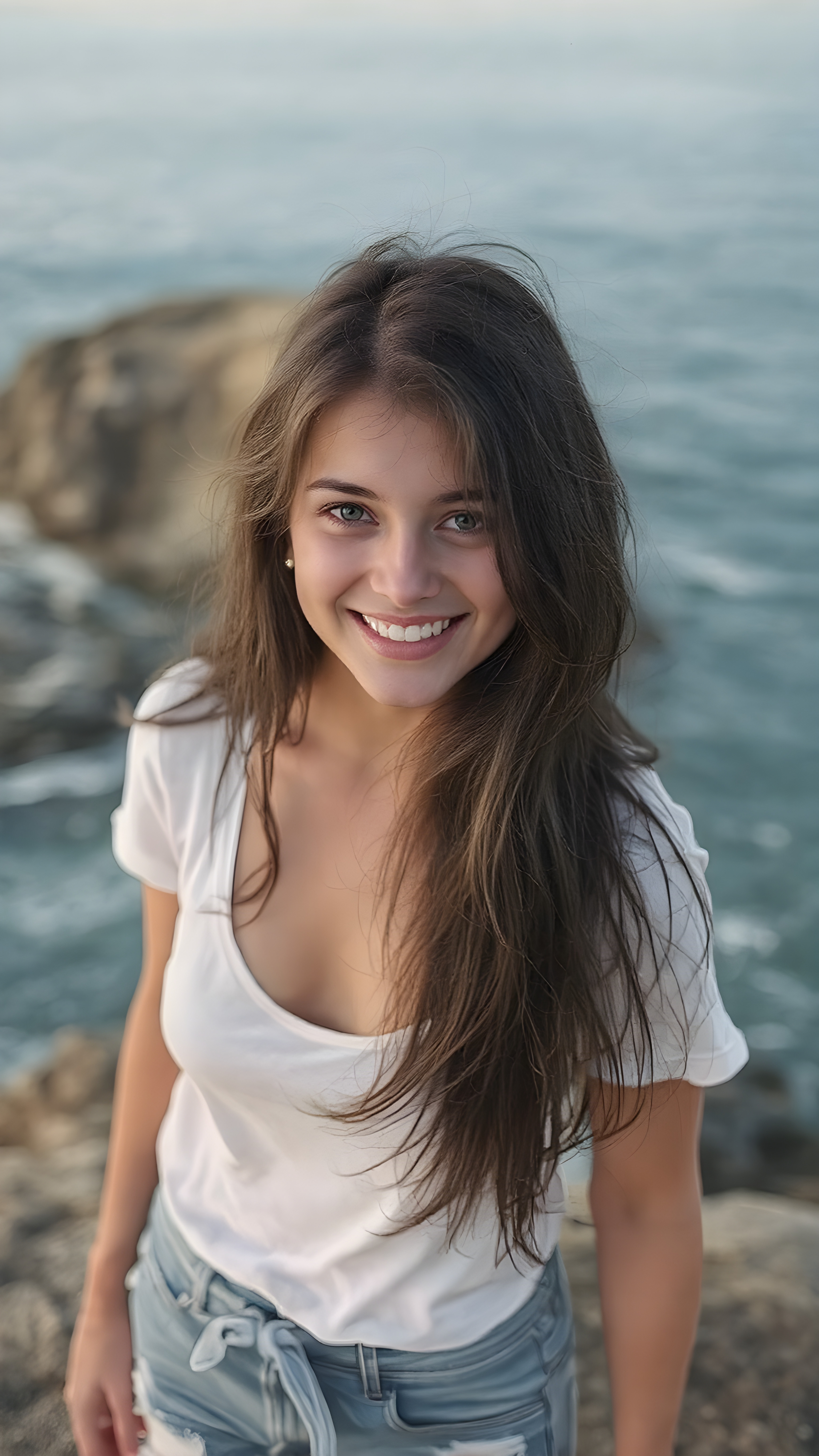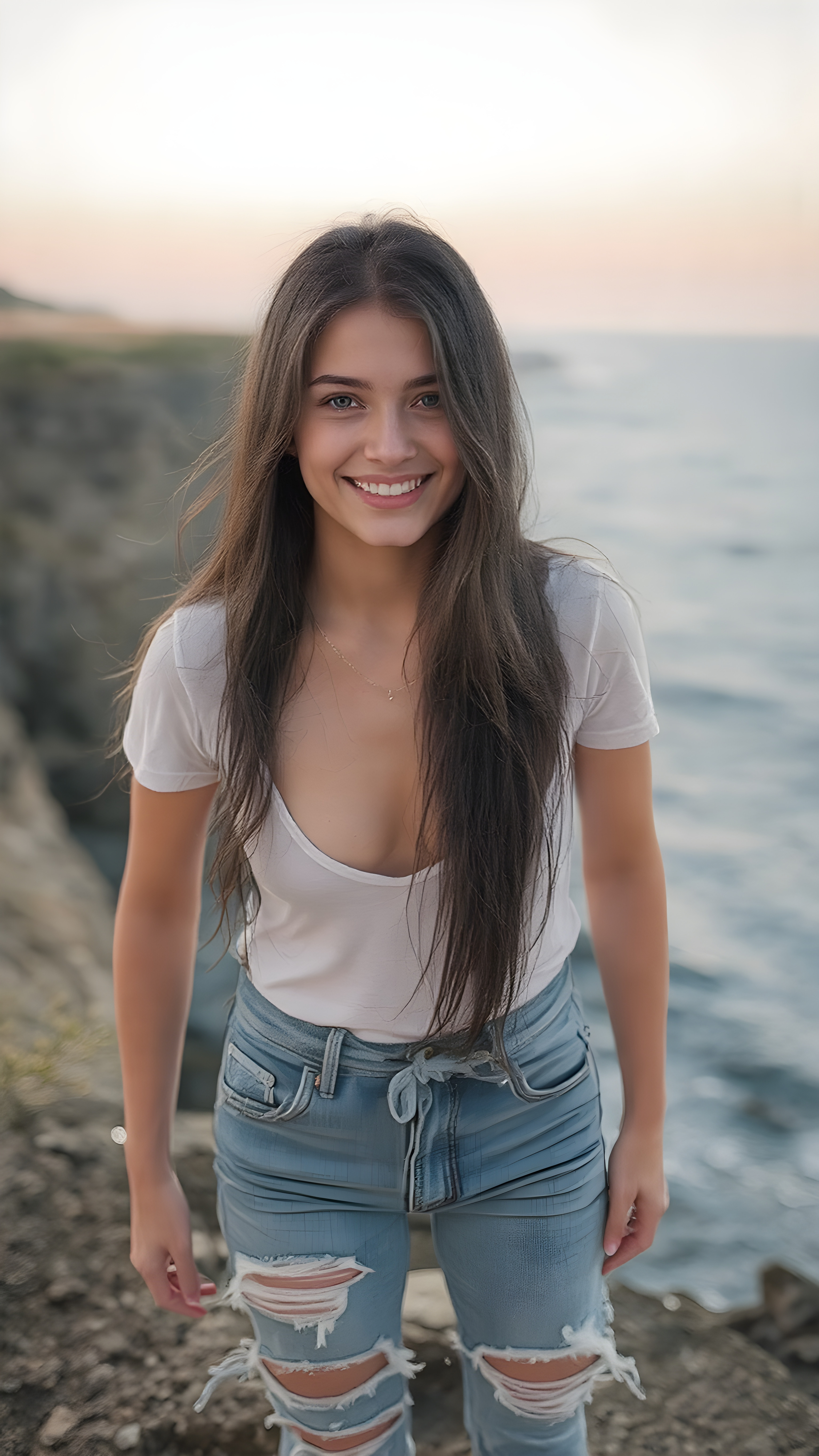A (hyper-realistic, highly-detailed, vivid ((full-body photo)), with ((warm, soft glowing highlights)), ((rich colors)) that convey a (happy, inviting atmosphere) she is a cute adult girl with a (beautiful eyes) and (long, straight (black hair) that flows gently into the breeze) She wears a (low cut, ((white T-shirt)), with ((tattered, shredded jeans)) that give off a (soft glow), and a (white belt) tied at the front. The girl stands on a (rock cliff), facing the camera, and looking out over the ocean. Her body leans slightly forward, as if she is reaching out to the camera, with her (short, soft (brown hair) and (curly (tan hair) that gives off a (warm glow) blend seamlessly into the scene) She is happy, and has a (bright smile) that complements her (extremely long, flowy locks) perfectly, and her ((perfect, natural teeth)) are visible in full scope with the smile giving a playful touch to her expression.