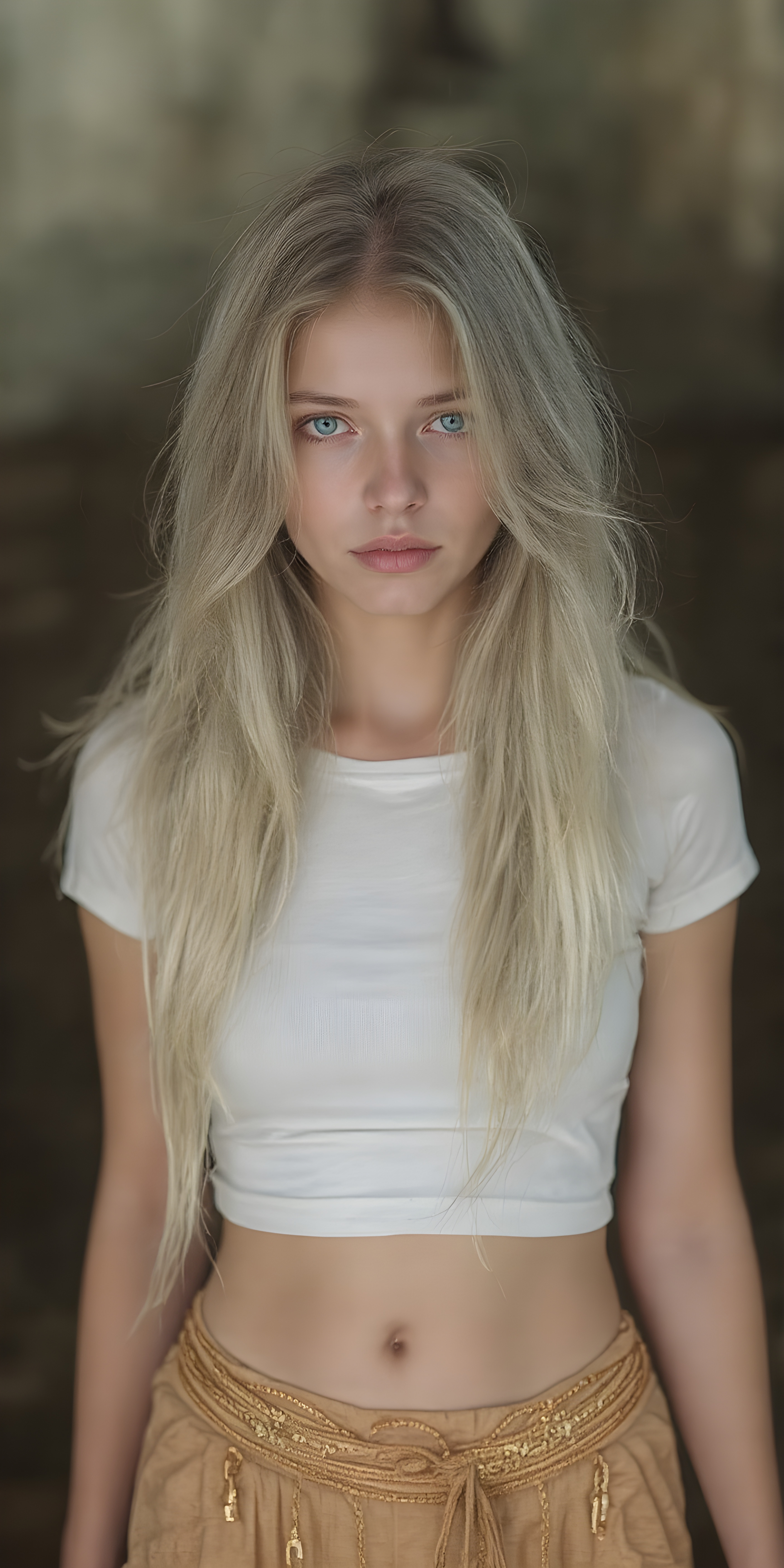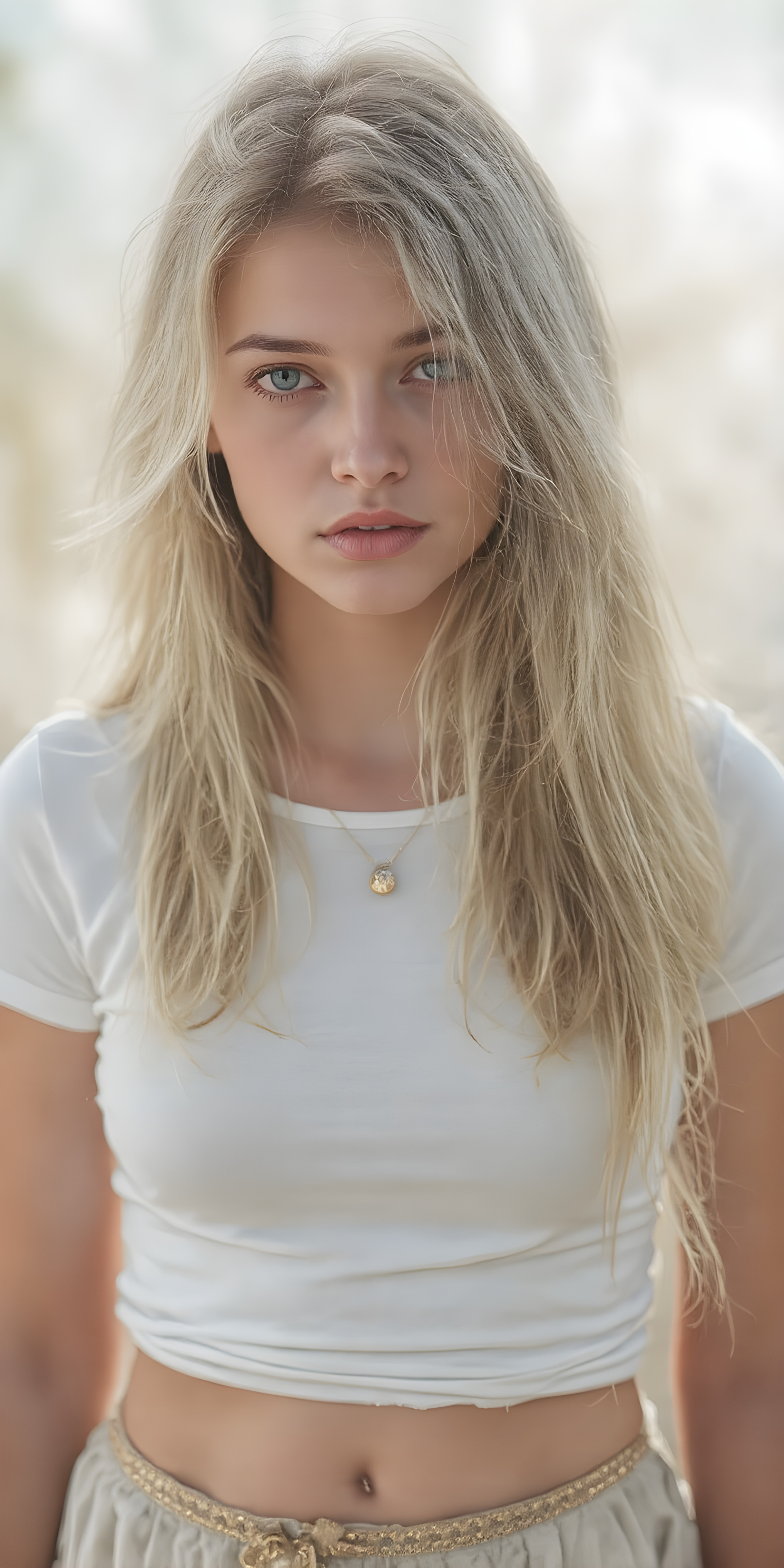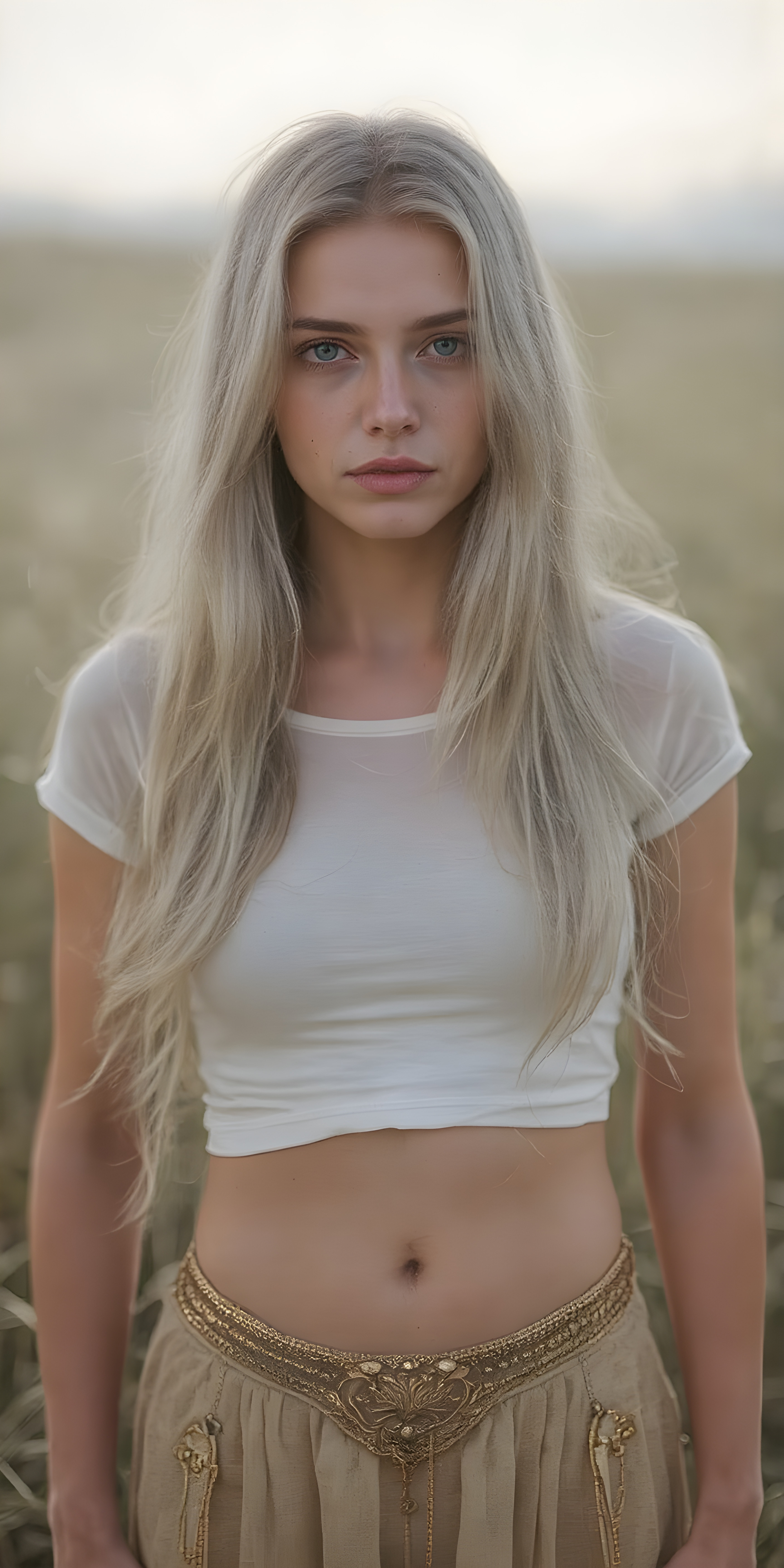 A (((very beautiful adult noob with pale skin and a delicate, almost translucent, silhouette of her figure, with very long, soft, white-gold hair that flows away in the wind and covers her entire back like a cloak, extending down to her thighs. Its soft, delicate strands intertwine with her skin in a very beautiful pattern, highlighting her natural beauty))), with (((brightly colored, natural eyes))), that exude a sense of innocence and curiosity. She’s dressed in a ((super short tight white T-shirt that covers her front, paired with a (skirt) that extends just above her knees, and is decorated with (gold details) that match her skin tone. The shirt can’t contain her curious expression, though, as it slightly peeks out from the top of her head, blending seamlessly with the natural texture of her skin and the skirt’s golden ornamentation)), which is a tight, golden loincloth that covers her front and thighs.