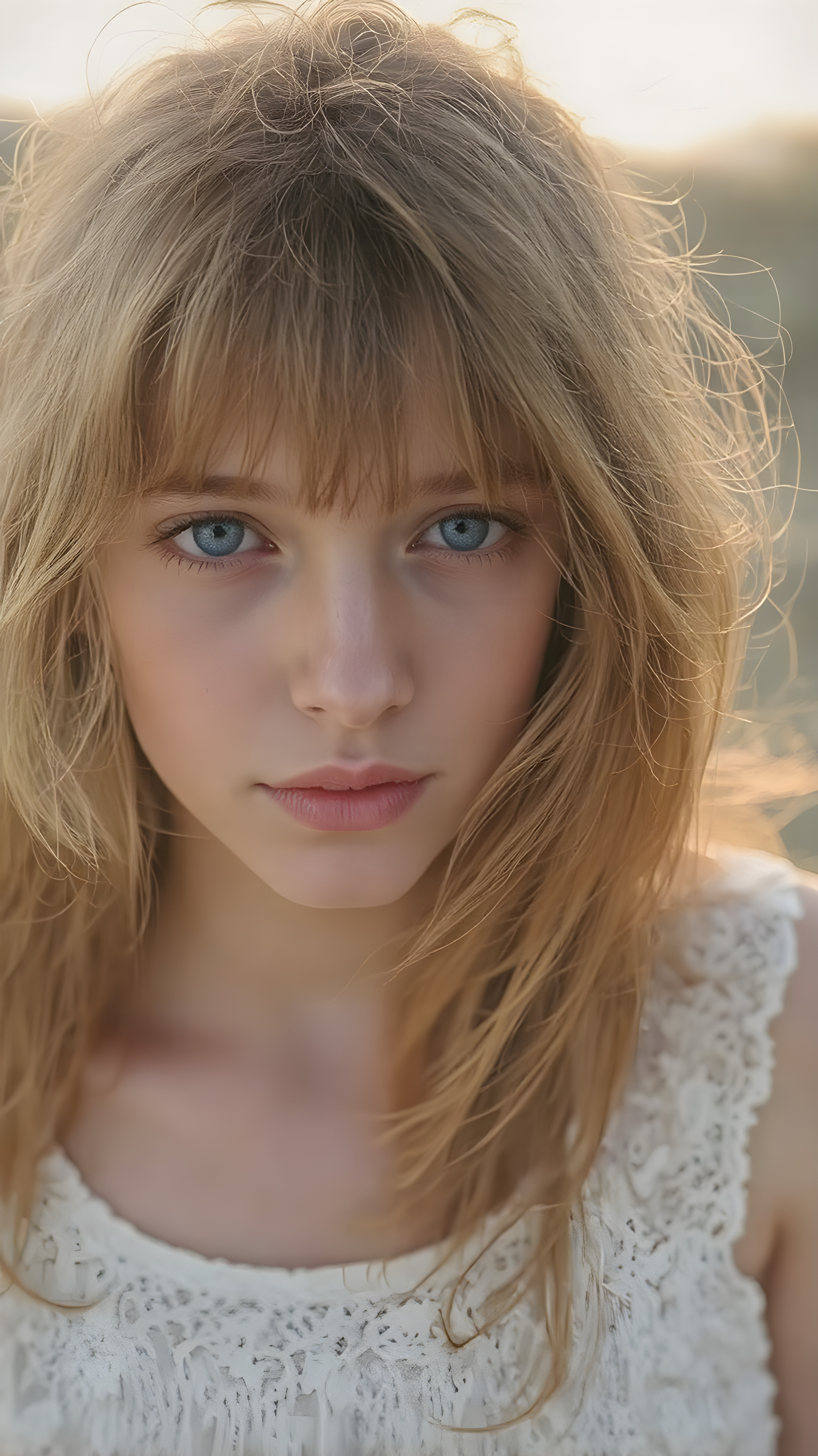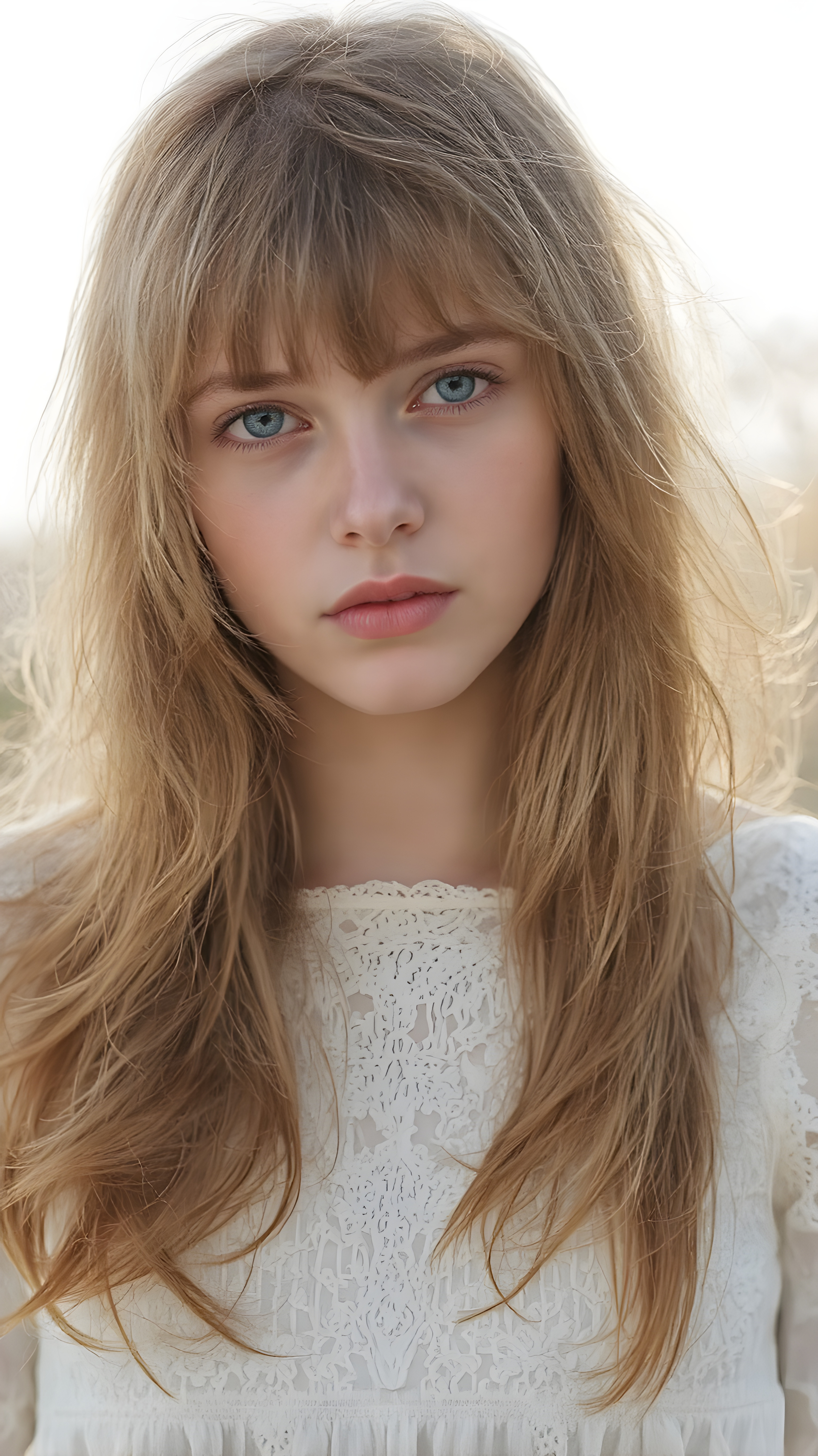 A (((vividly detailed upper body portrait))), capturing a (((beautifully innocent looking teen girl))) with a ((softly rounded face)), (extremely long, tousled, auburn hair which flows down to her hips), and (deep-set, very blue eyes framed by (full, defined lips) that give her a soft, (almost seductive expression). Her lips are painted in (soft, natural tones) that match her (natural skin tone) perfectly. She has (extremely long, soft, white-embroidered bangs) that move gently in the wind. She wears (extremely soft, ((white-embroidered)) dress) that matches her (skin tone) perfectly. The dress is (long, flowing and semi-transparant) and the ((copper hair)) is visible through the dress. The image is taken outdoors, with a ((softly blowing wind)) that (blows her hair outwards) and a (brightly glowing sky) that gives the scene an ethereal quality.