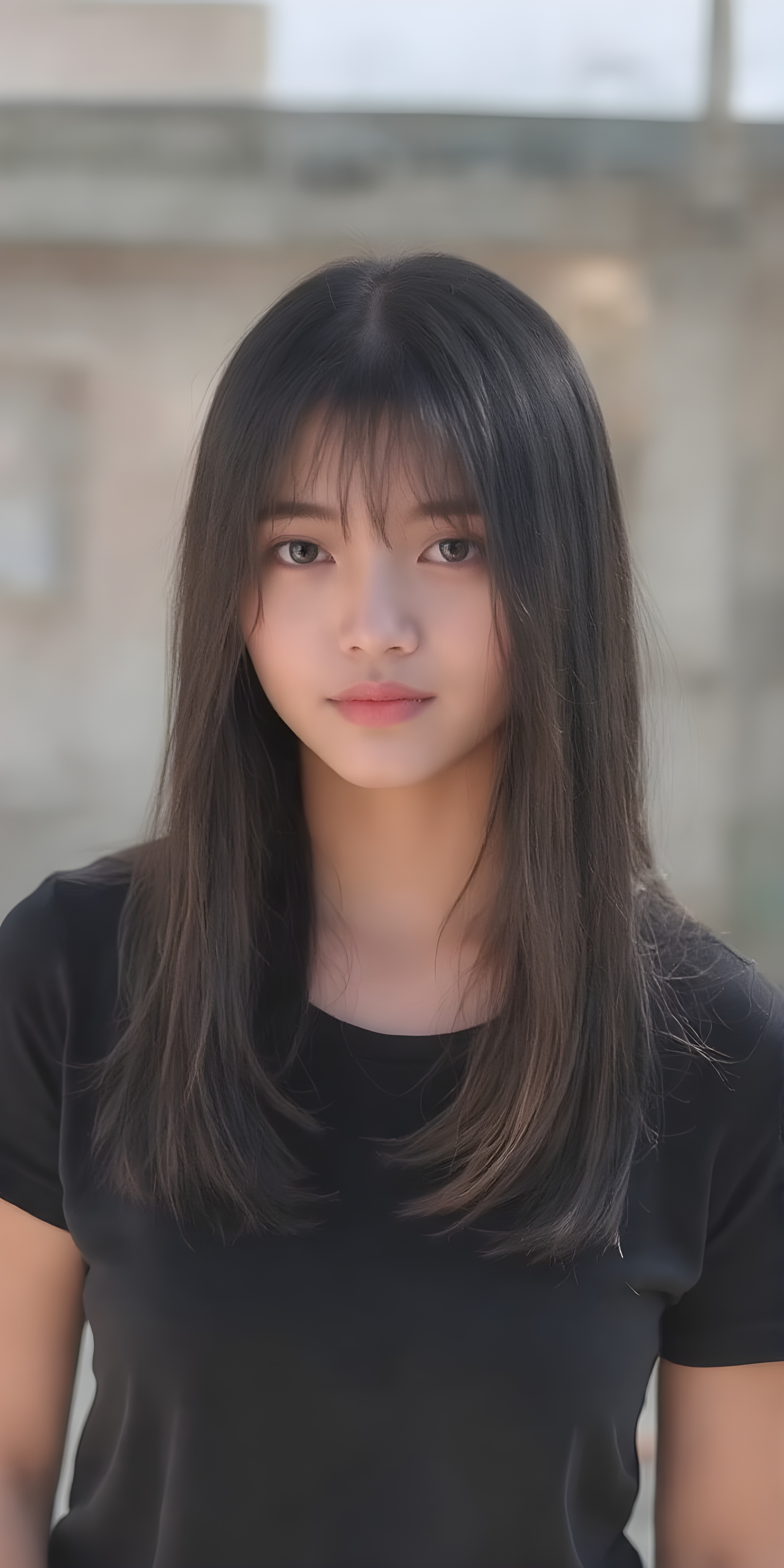 (((a beautifully realistic photo))) (((full body photo))), capturing a young ((Asian teen girl)) with an realistic looking (((black thick, straight soft hair))), (realistic looking eyes) that convey a sense of warmth and vitality, dressed in a soft, ((black t-shirt)), that complements her natural-toned figure, embodying a youthful, innocent yet (mature) beauty that exudes confidence and allure. ((sunny background))
