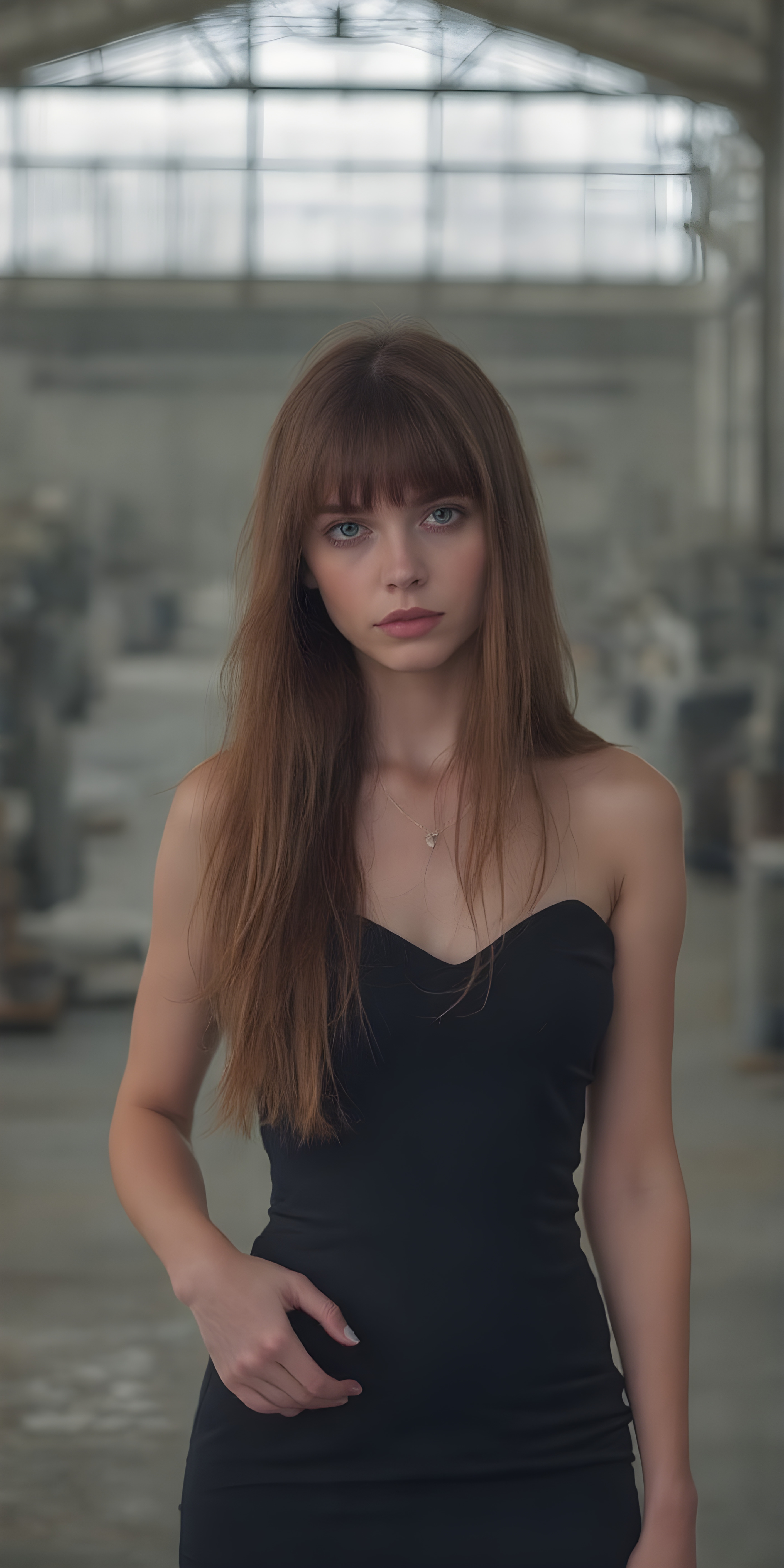 an adult girl with long red silky hair wears a black short cocktail dress. She is standing in a large, empty factory hall and looks seductive to the viewer.