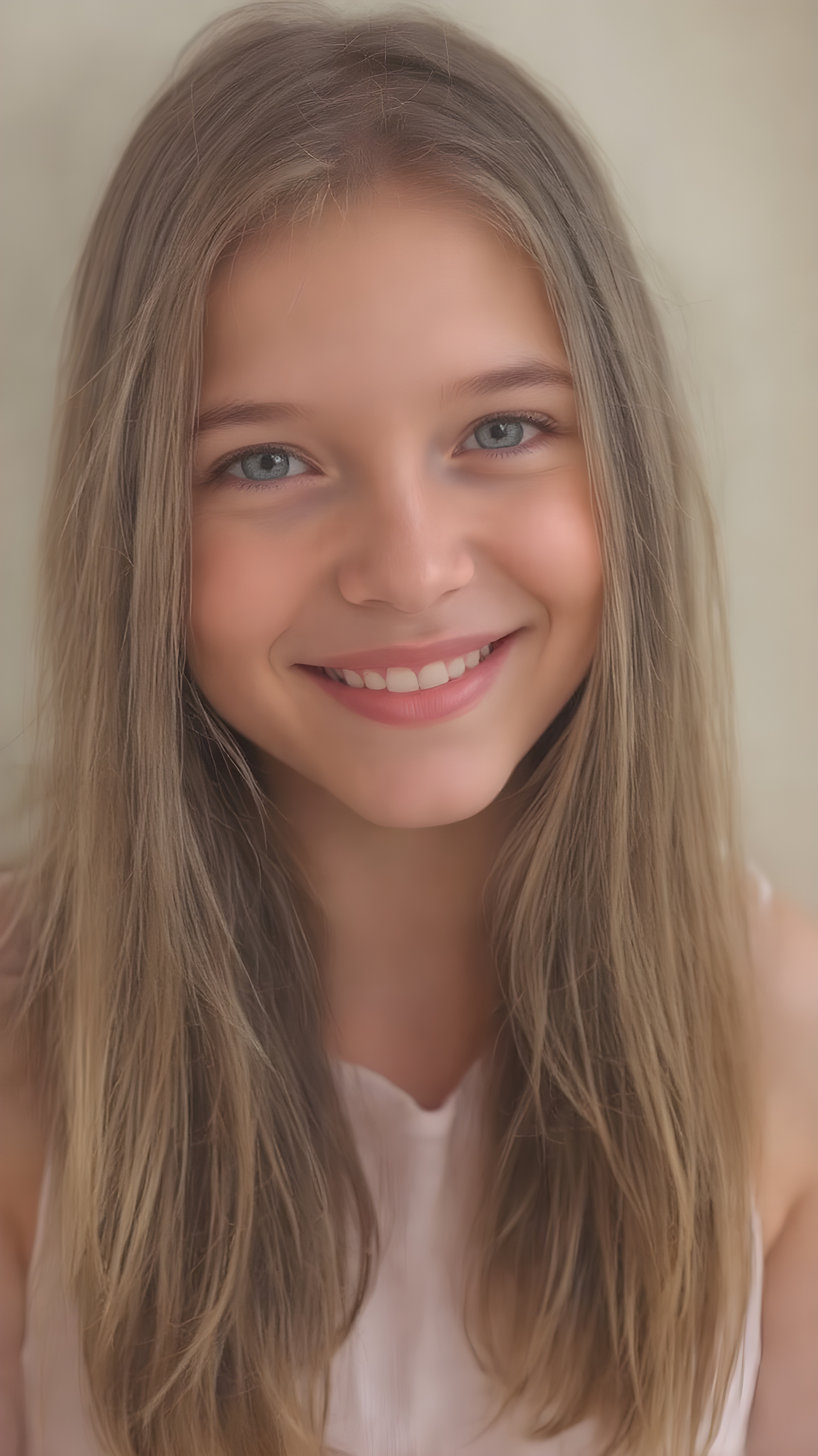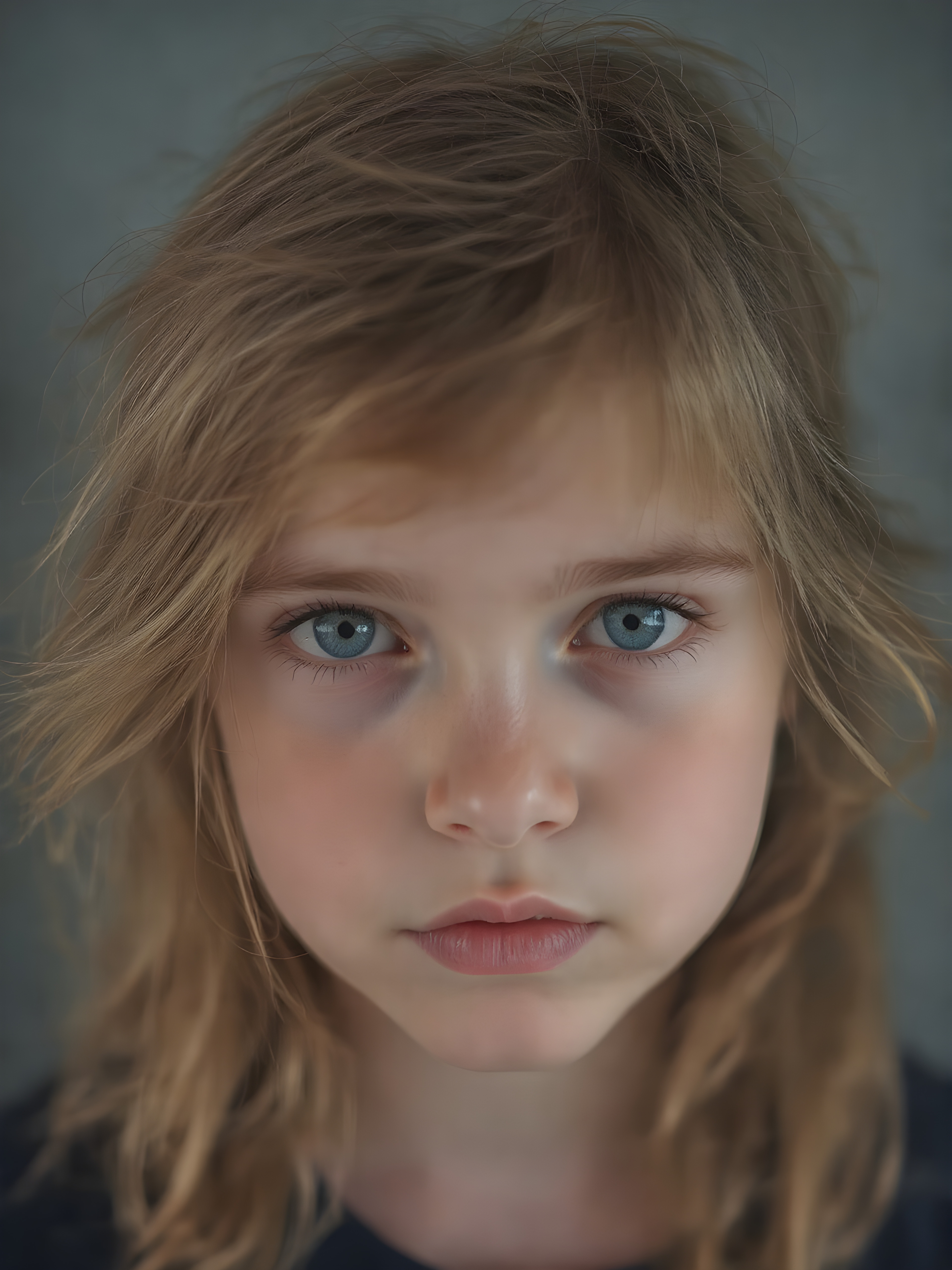 portrait shot, a innocent teen girl with a round face, tousled, frizzy long copper hair, full lips and deep blue eyes, super realistic face, grey backdrop