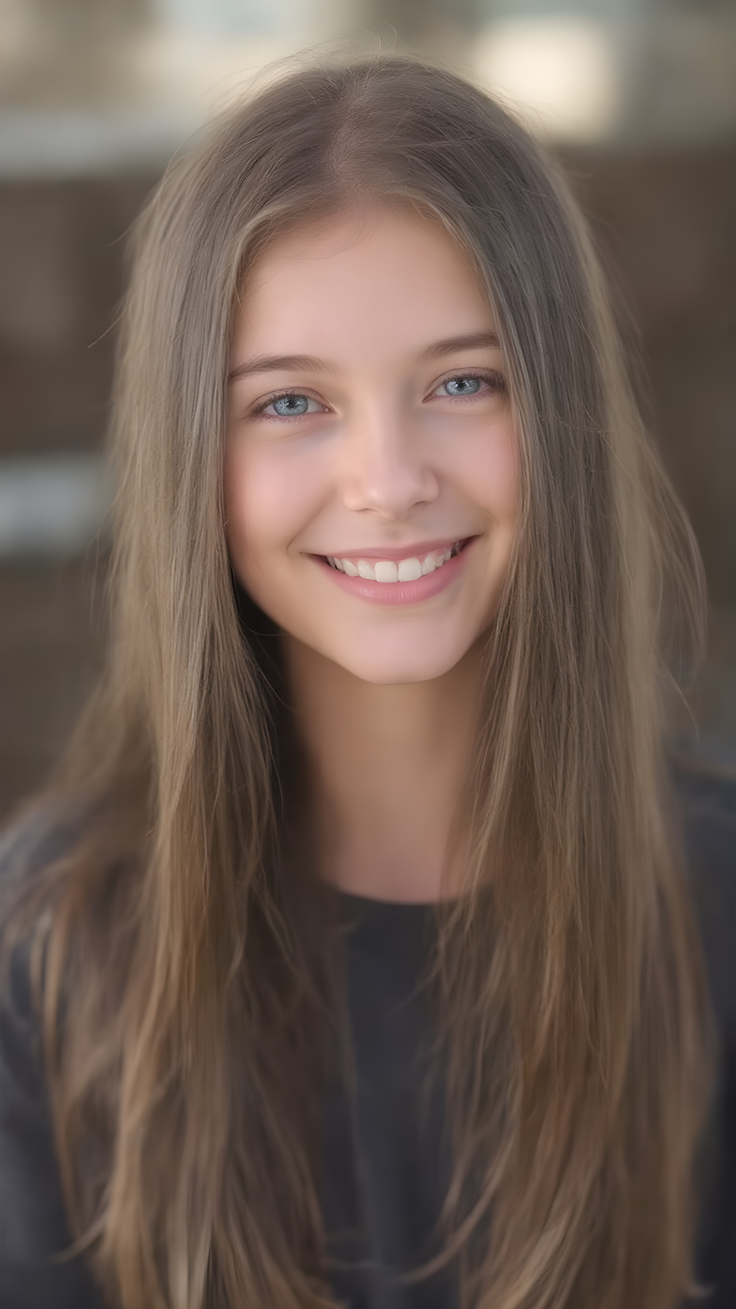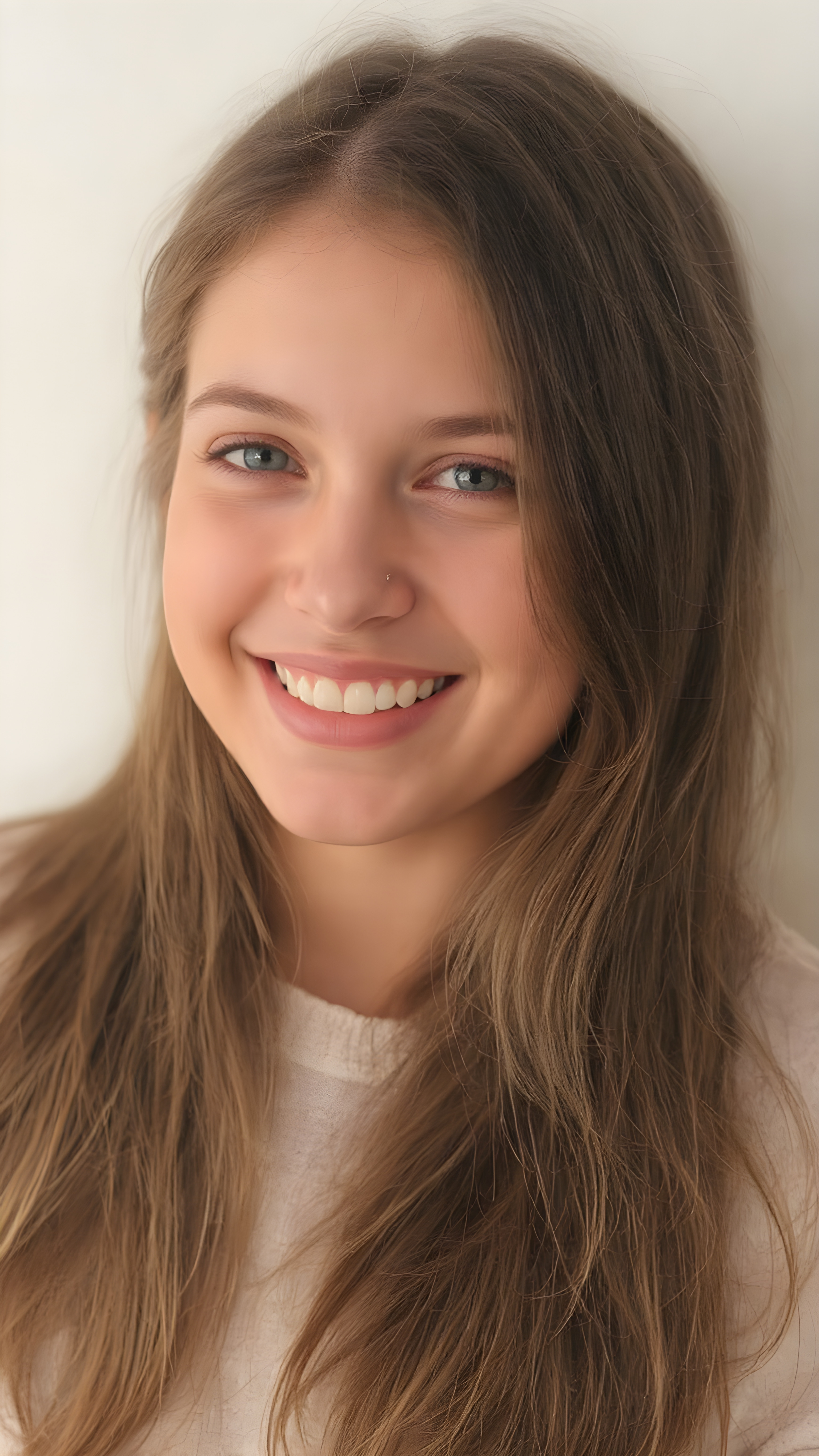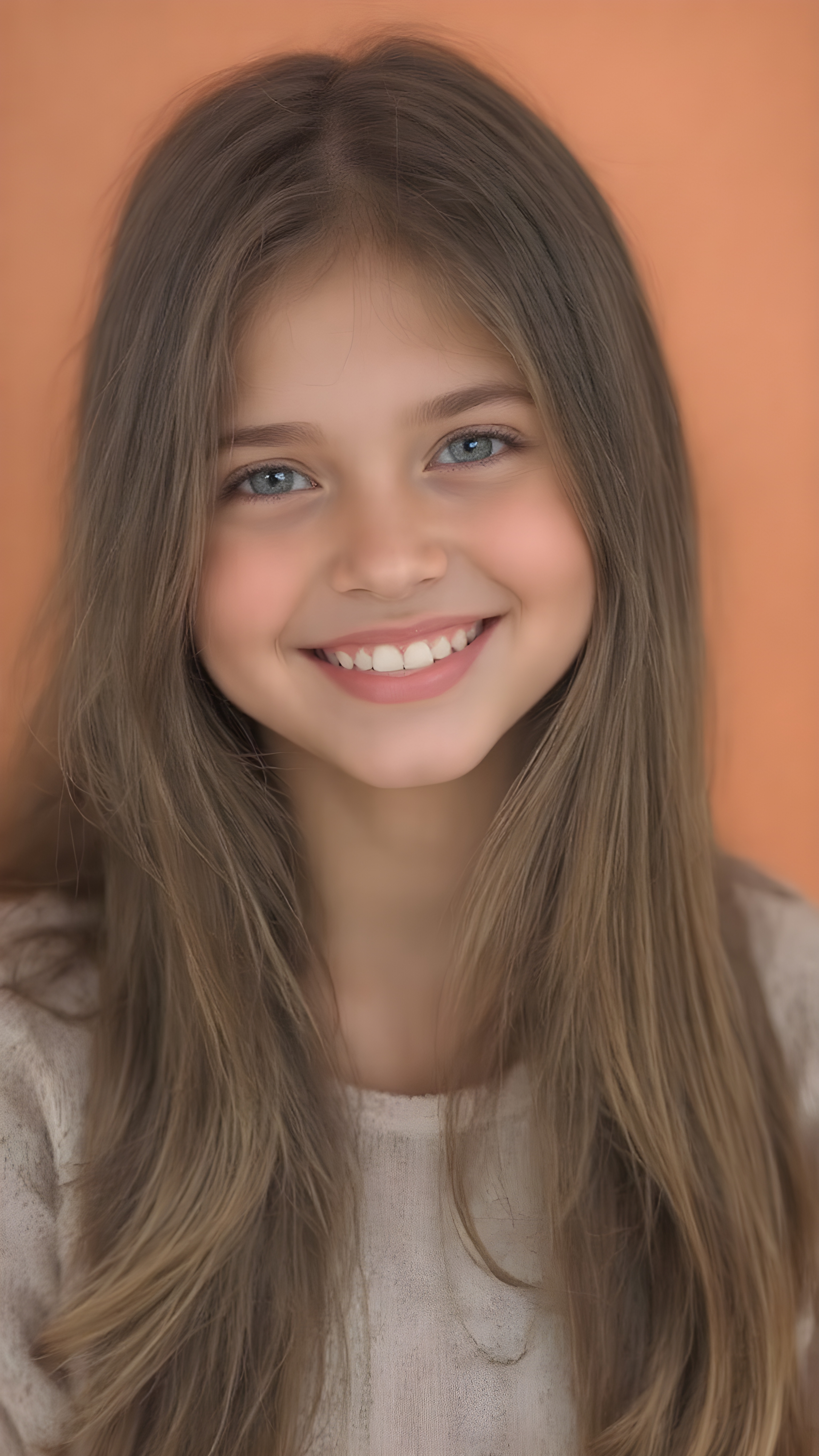 portrait, full body, warm tones, cute girl, stunning, gorgeous, she smile very happy and has long, straight brown soft hair