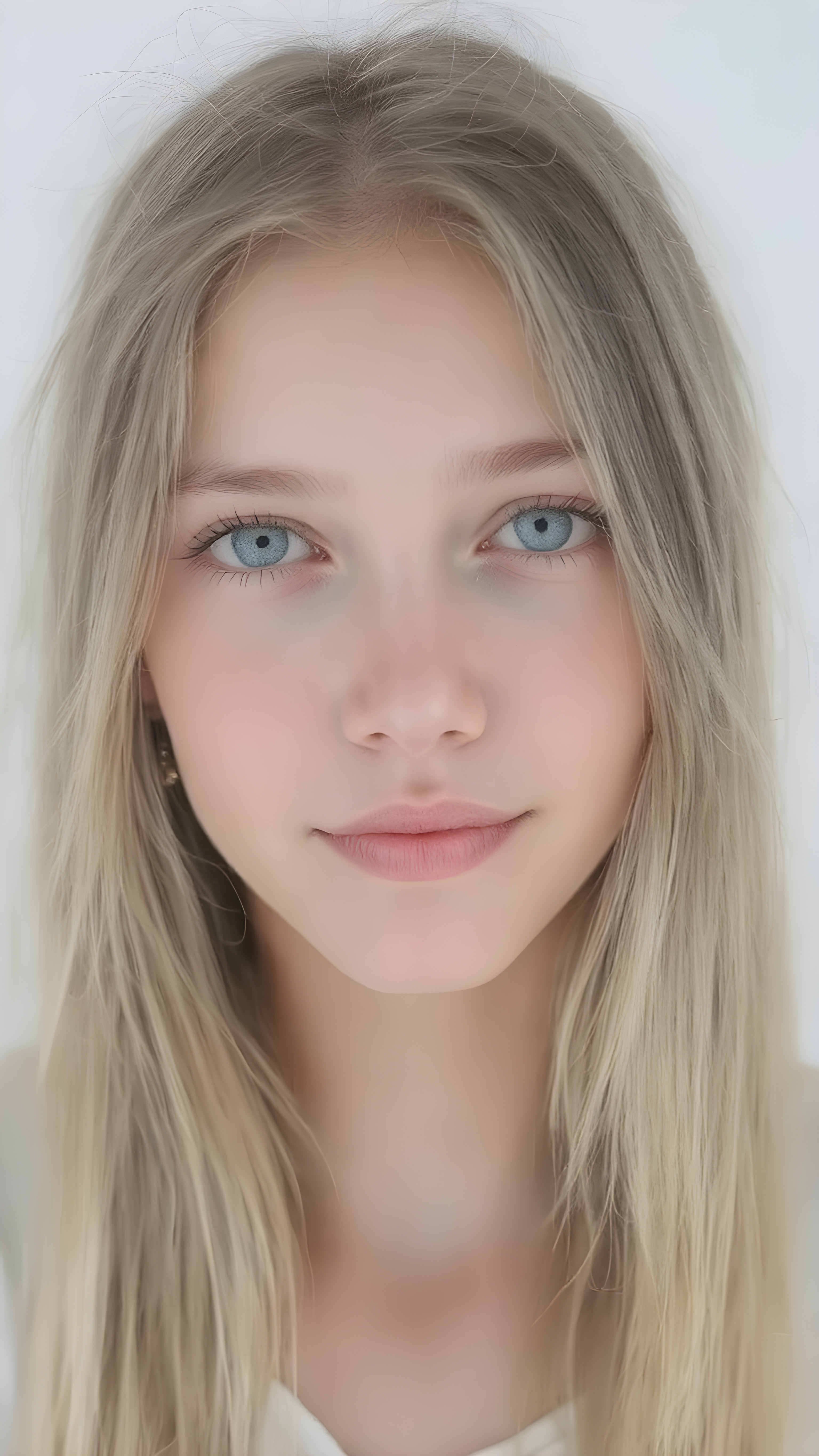 A (((extremely detailed and high-quality (((full body portrait))), ((zoomed in on the face))) of a (((cute, innocent, and Incredibly beautiful teen girl))) with ((straight soft long flowing hair)), ((natural detailed skin)), ((perfectly curved body)), and (((brightly detailed eyes))), that give off an ((extremely realistic, matching, and perfectly detailed appearance)), as if captured in a moment of pure ((cinematic beauty)). Her look exudes an air of ((utter sophistication)), with ((white clothes)), ((matching earrings)), and a ((coy smile)) that sends hearts fluttering. (((Empty background.))) ((Perfect anatomy.))