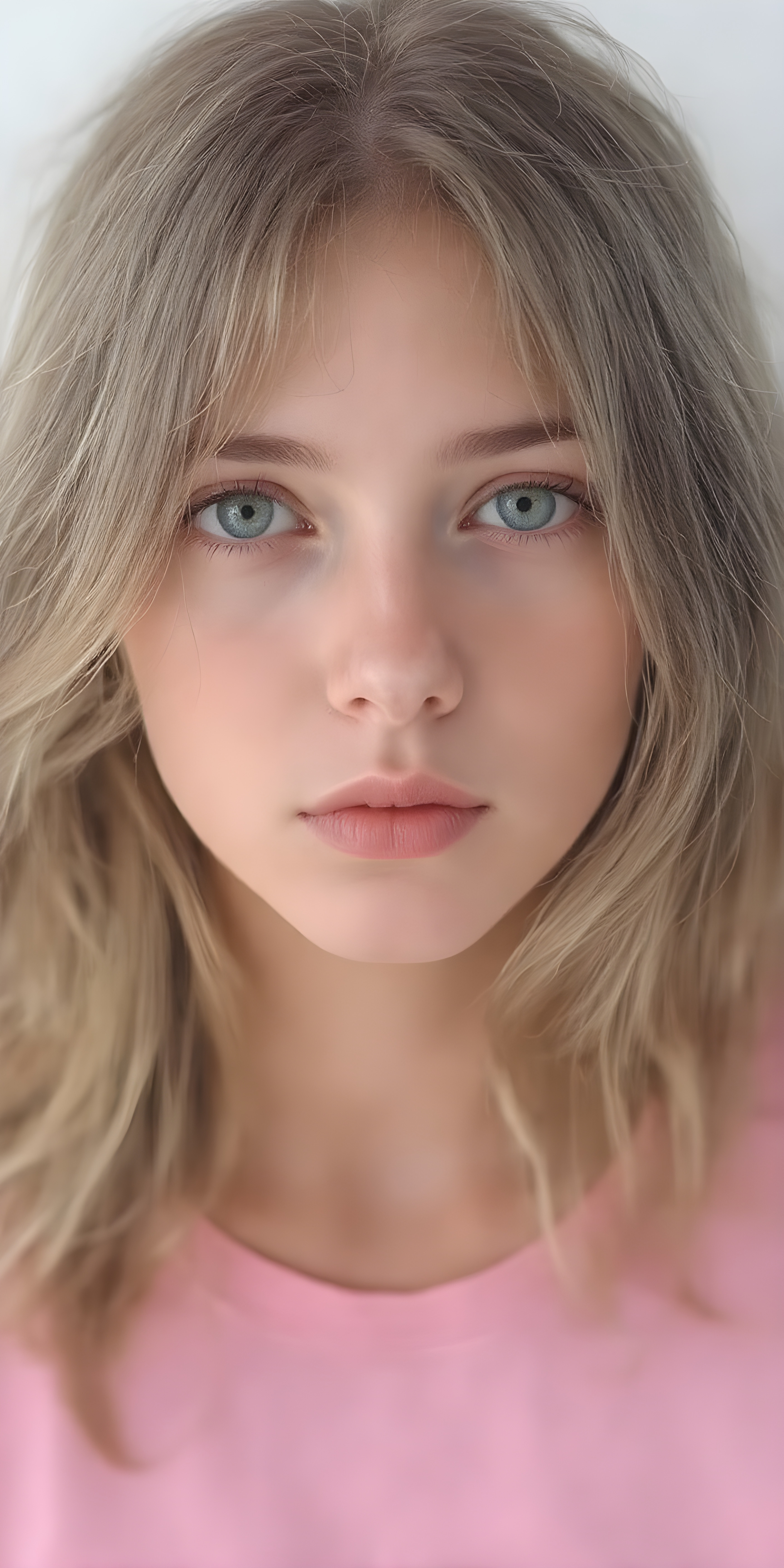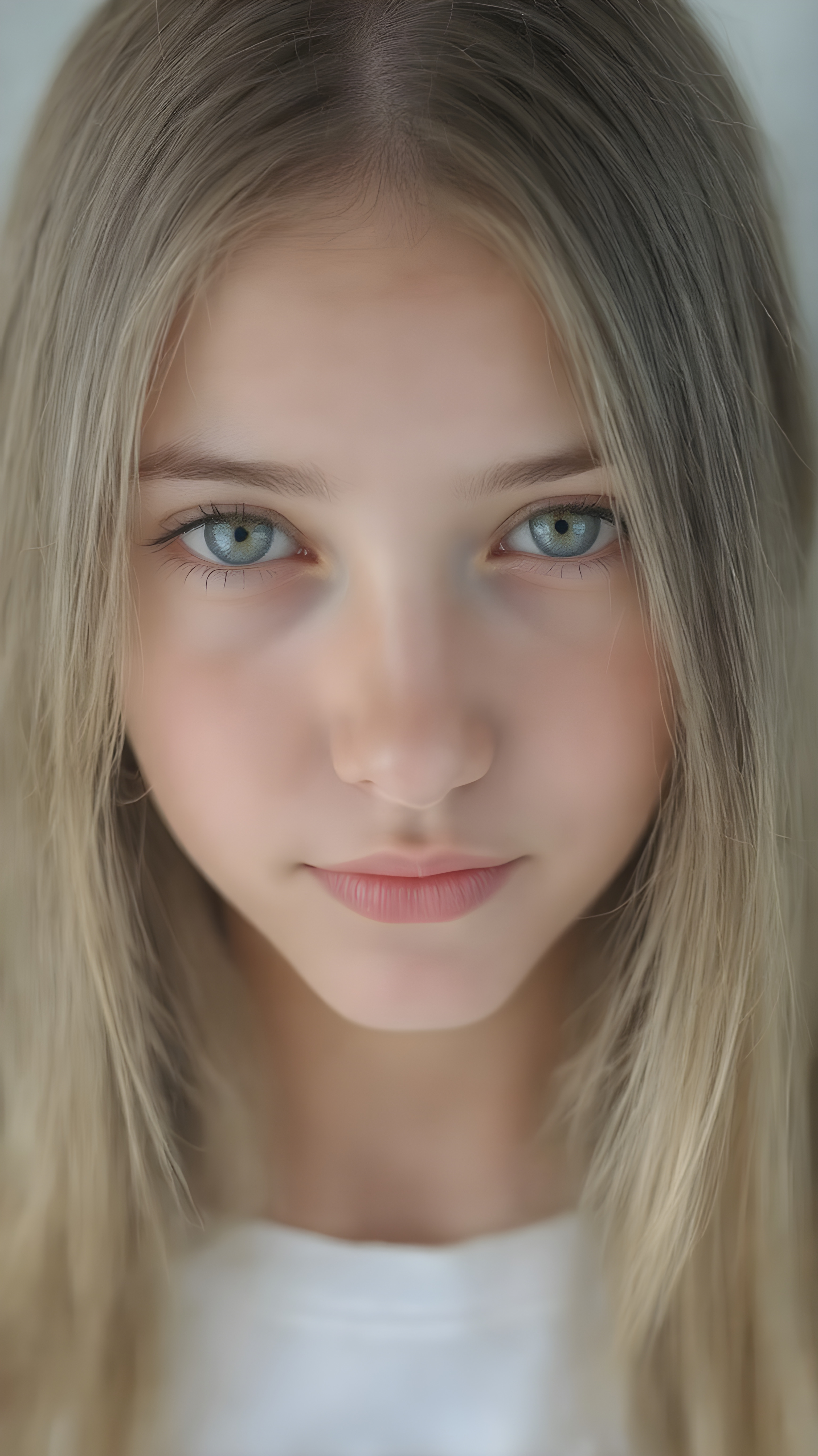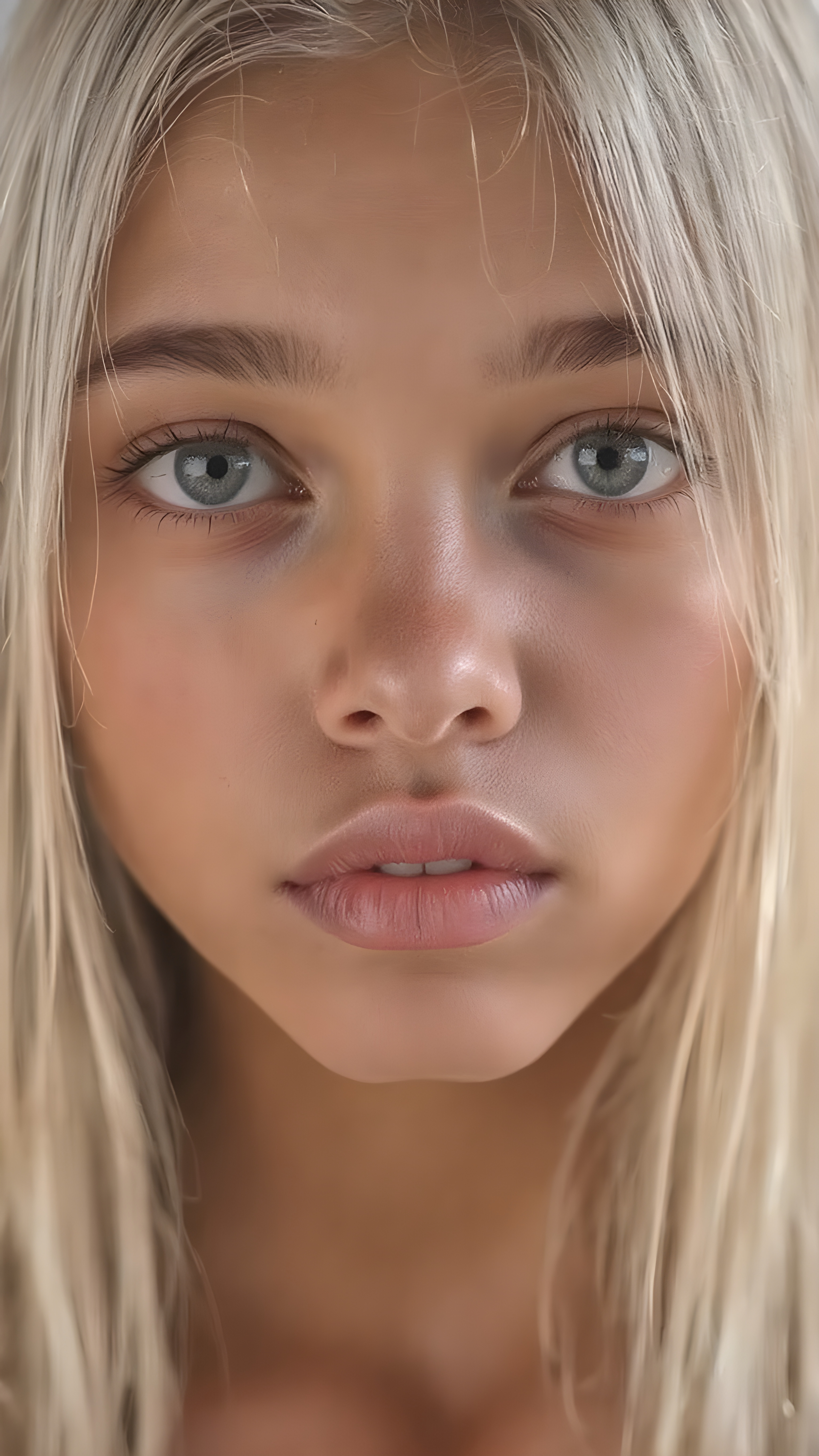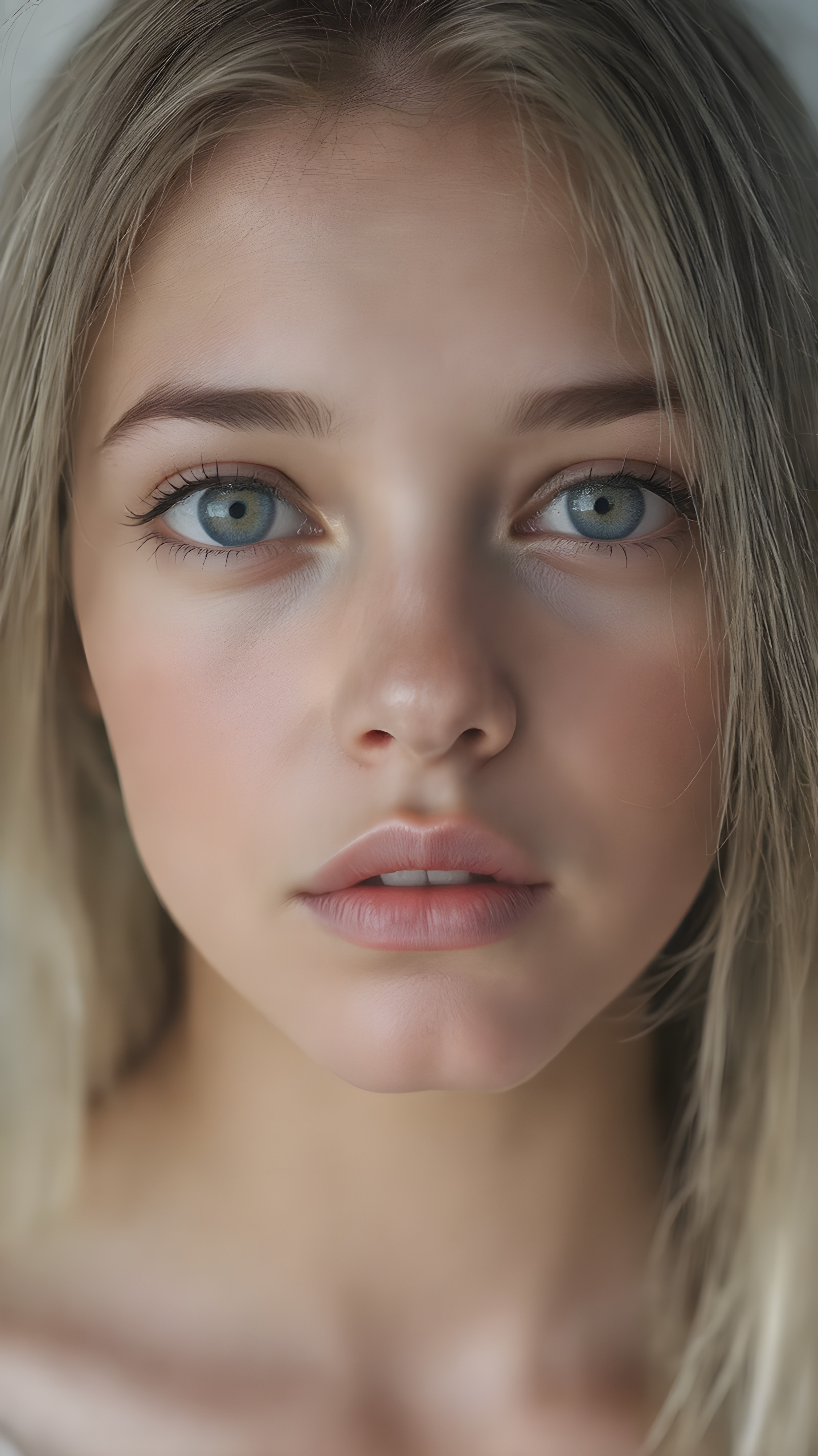 A (hyper-realistic, highly-detailed, vividly-colored cinematic full body portrait, ((matching eyes)), ((perfect anatomy)), with a ((very long, straight, thick, untucked, natural white color scheme)), and ((realistic detailed skin)), that exudes ((incredible confidence and innocence)), paired with (((highly detailed, natural looking, glowing skin))), which gives off an (ethereal and enchanting glow). Her expression exudes one of ((astonished delight)), perfectly capturing that magical moment where the lights illuminate her face, revealing her ((natural beauty)). ((Empty background)) ((Close up, neck up image)) that focuses on her face, ((showing her full lips)), which are perfectly painted in (the correct human anatomy). She wears ((no makeup)), has ((no tight clothes)), and ((natural looking, perfect anatomy)), that perfectly complements her ((flawlessly matching eyes)), detailed pupils.