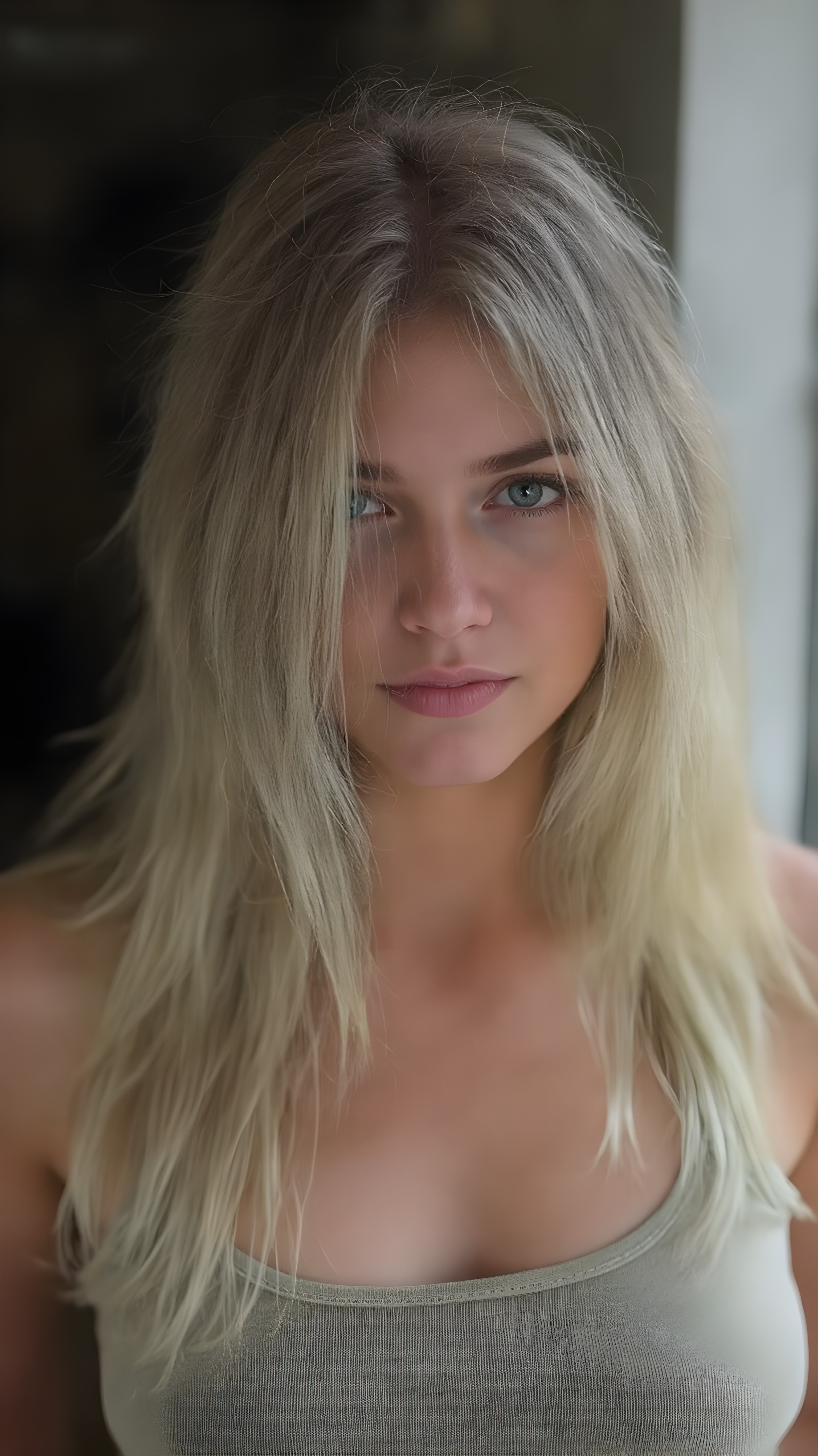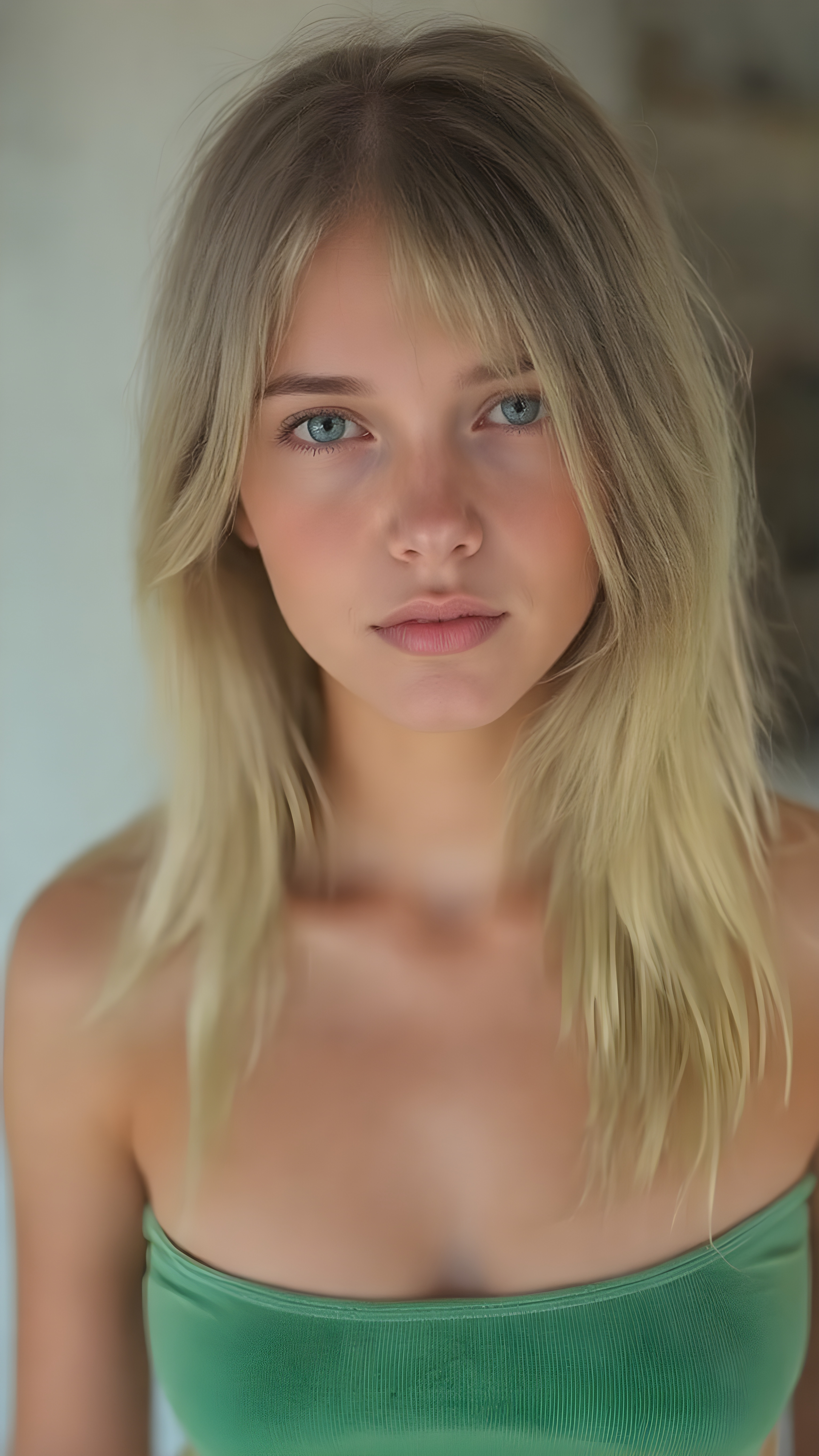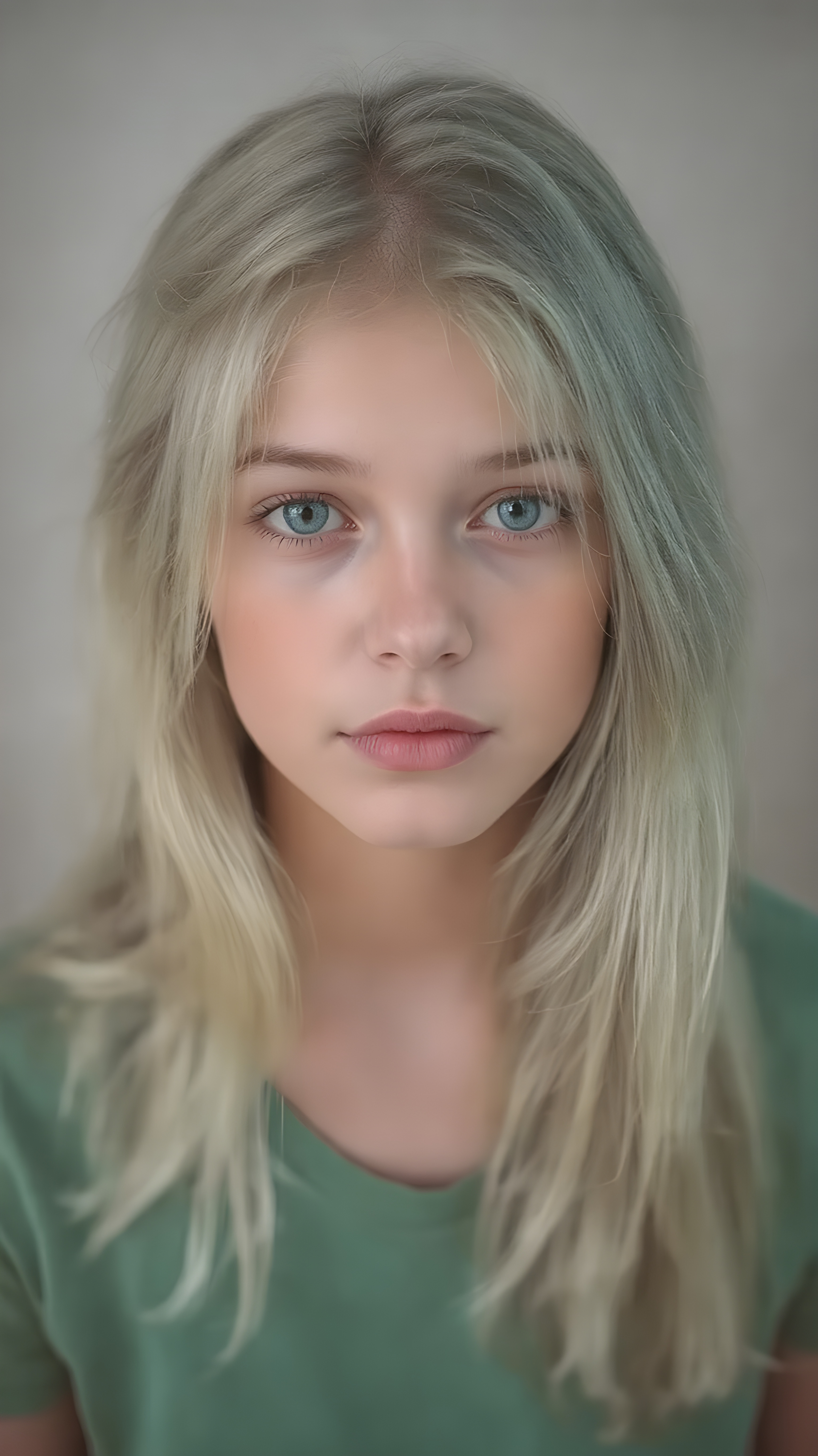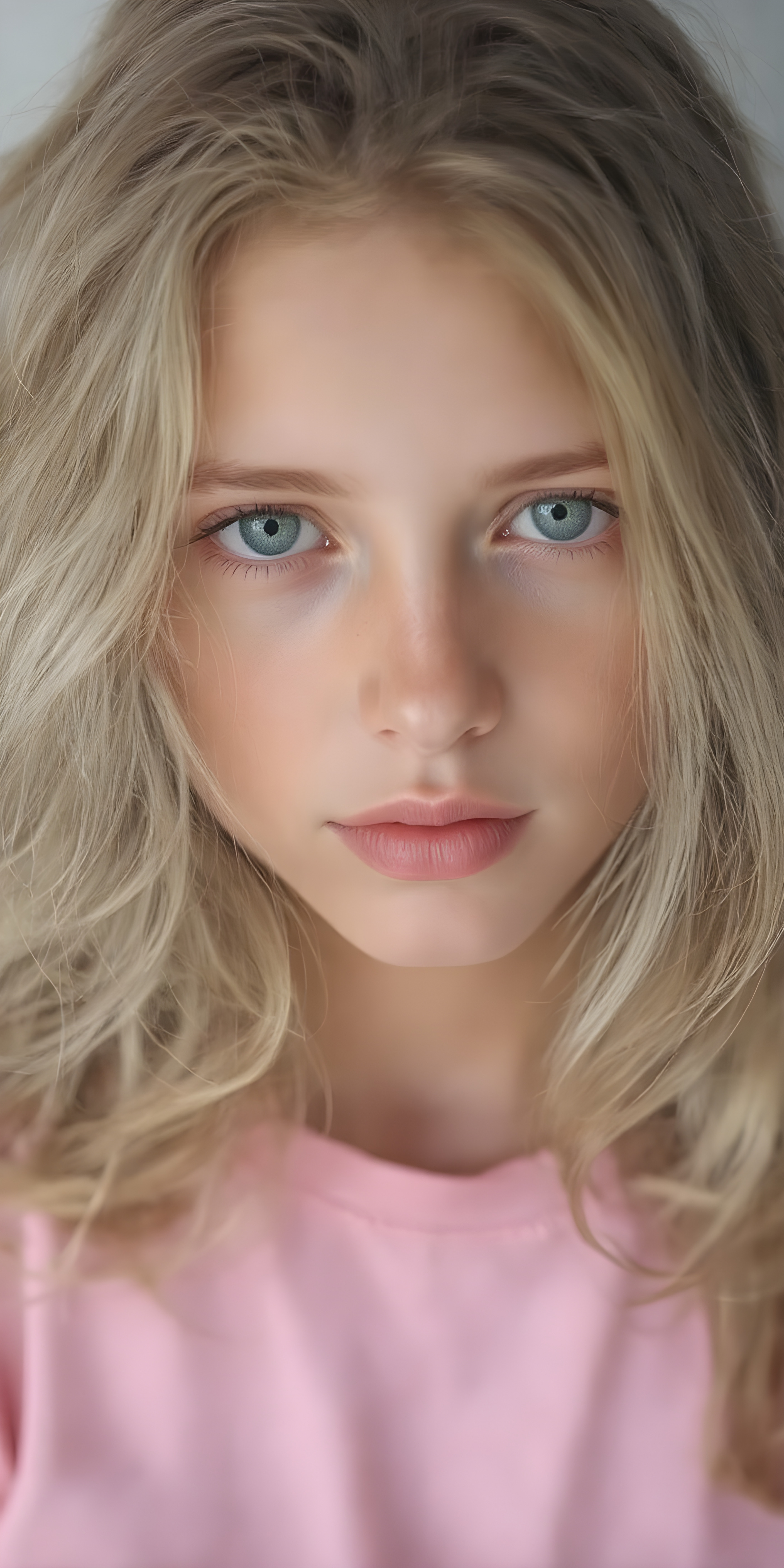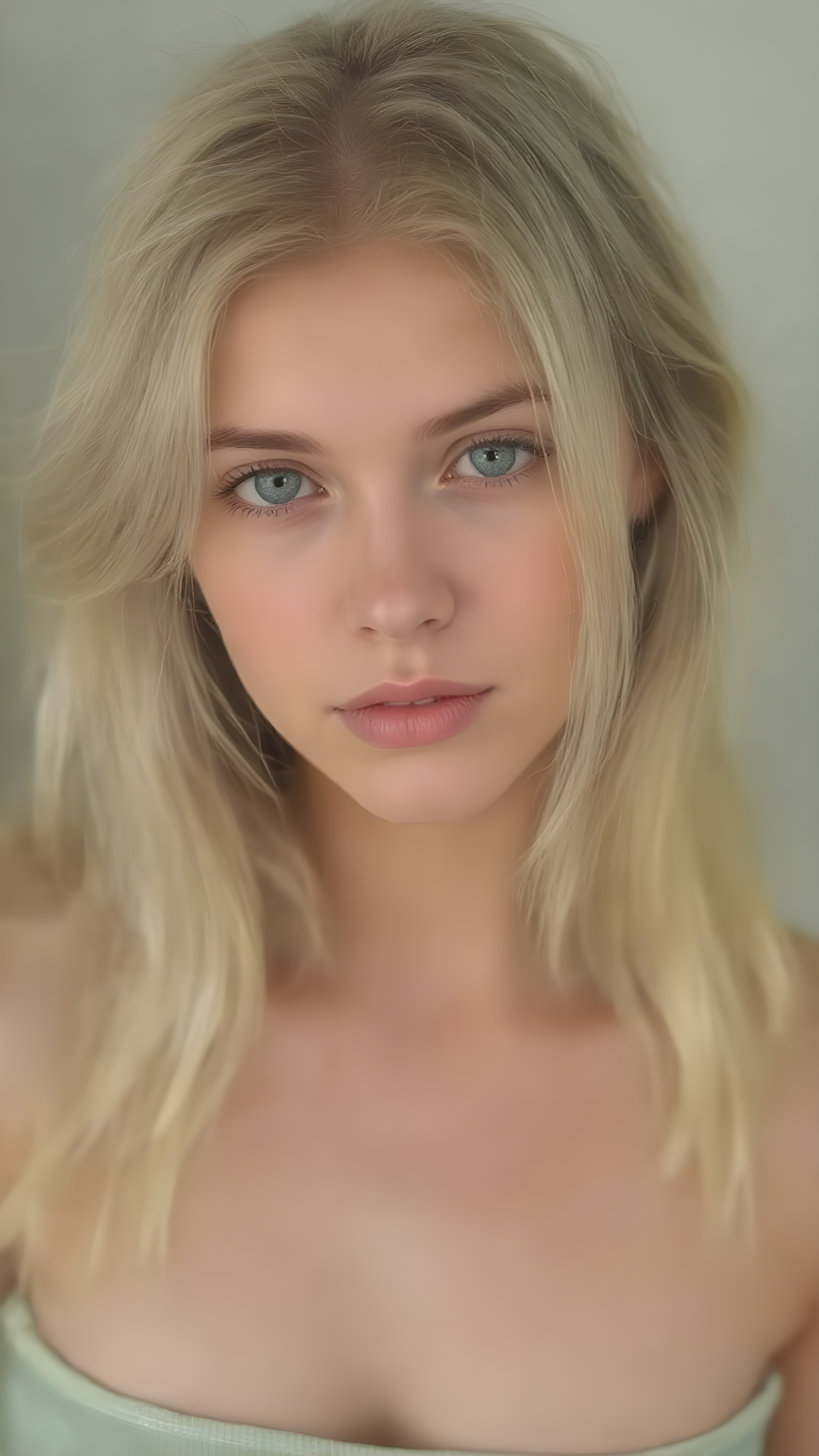 A (hyper-realistic, highly-detailed, vividly-colored cinematic full body portrait, ((matching eyes)), ((perfect anatomy)), with a ((very long, straight, thick, untucked, natural white color scheme)), and ((realistic detailed skin)), that exudes ((incredible confidence and innocence)), paired with (((highly detailed, natural looking, glowing skin))), which gives off an (ethereal and enchanting glow). Her expression exudes one of ((astonished delight)), perfectly capturing that magical moment where the lights illuminate her face, revealing her ((natural beauty)). ((Empty background)) ((Close up, neck up image)) that focuses on her face, ((showing her full lips)), which are perfectly painted in (the correct human anatomy). She wears ((no makeup)), has ((no tight clothes)), and ((natural looking, perfect anatomy)), that perfectly complements her ((flawlessly matching eyes)), detailed pupils.