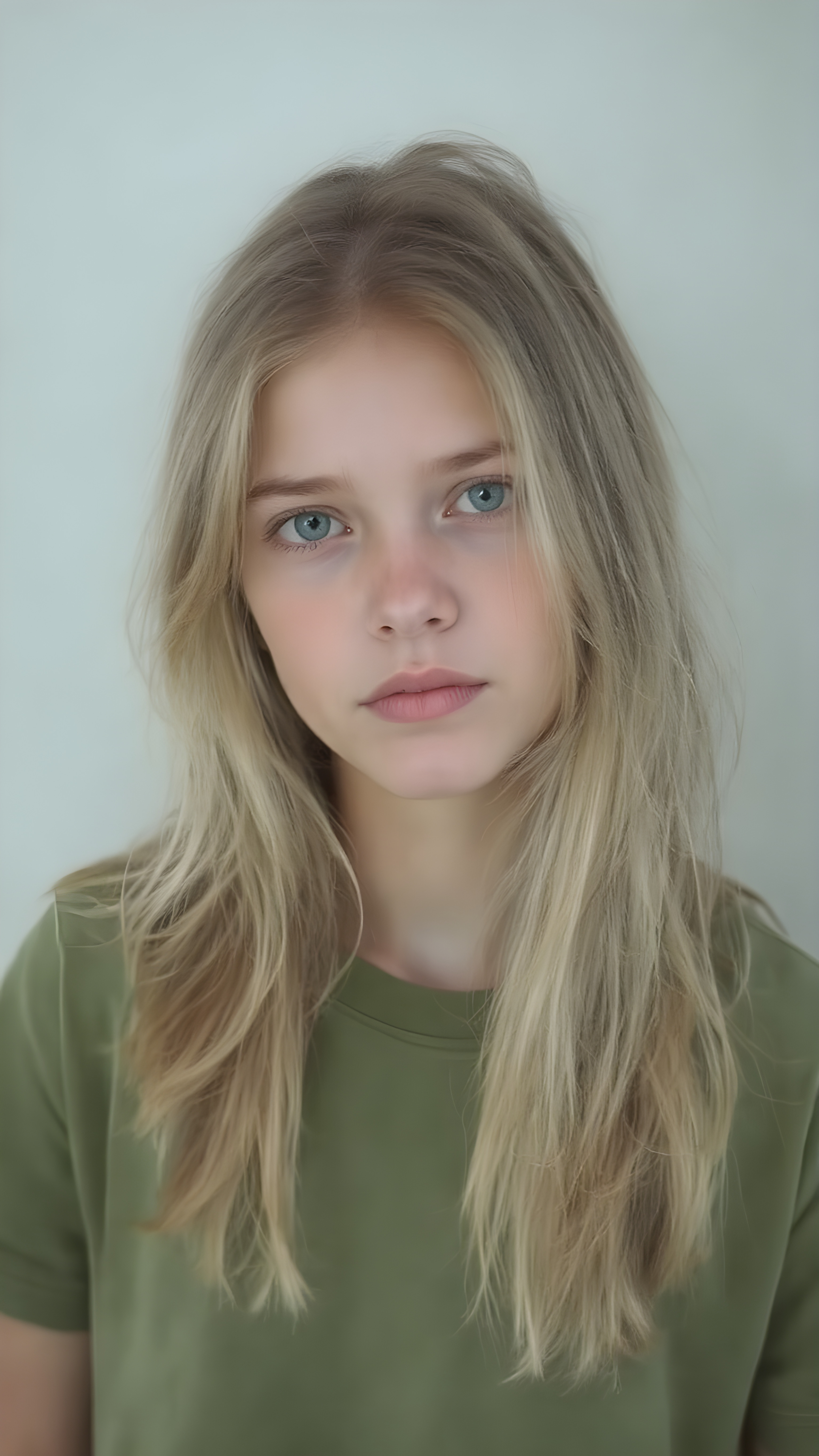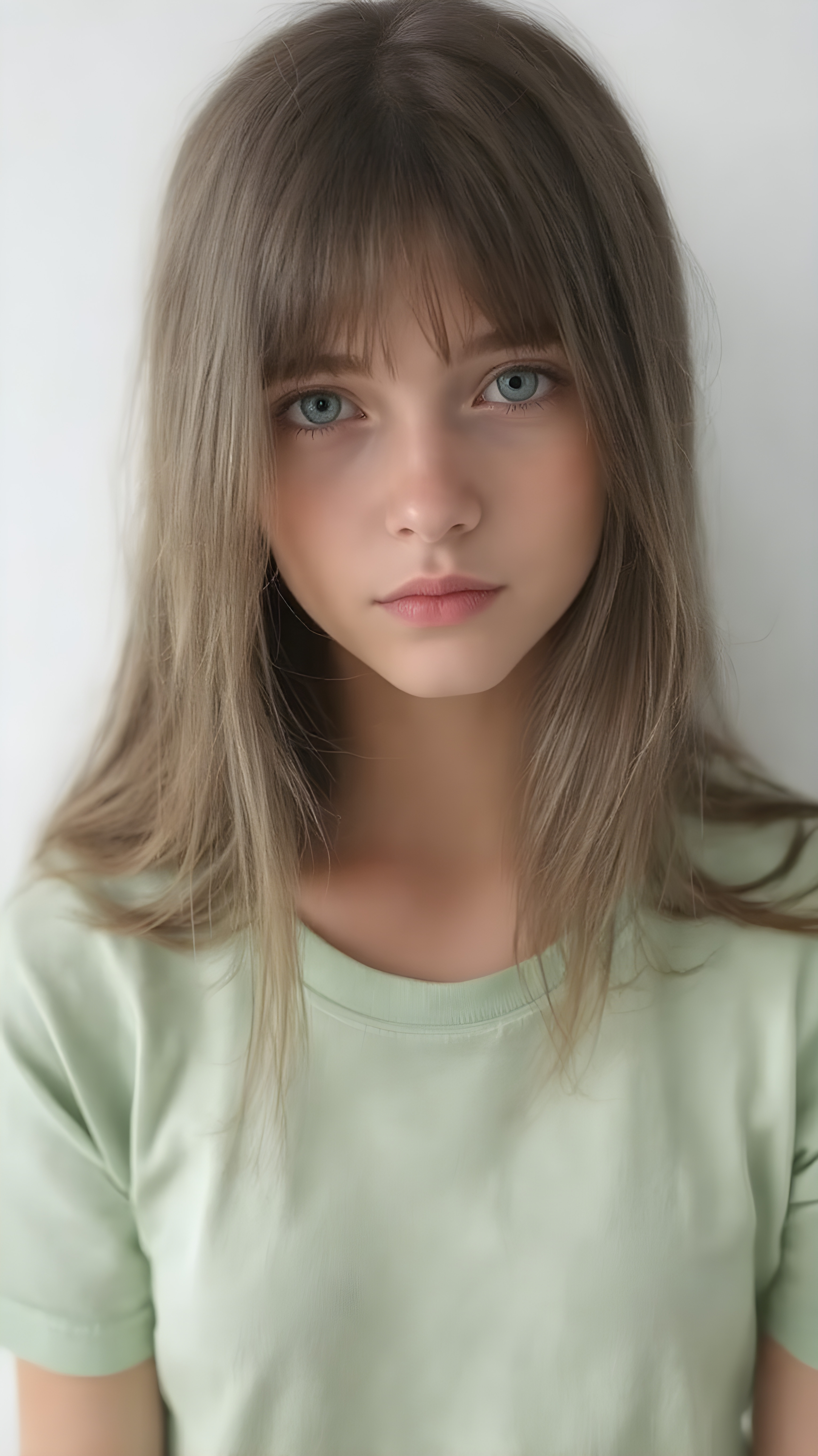 a young adult girl, dressed in green light t-shirt, with ((long soft straight brown hair)), green eyes, gentle face, detailed portrait, realistic, stunning, gorgeous