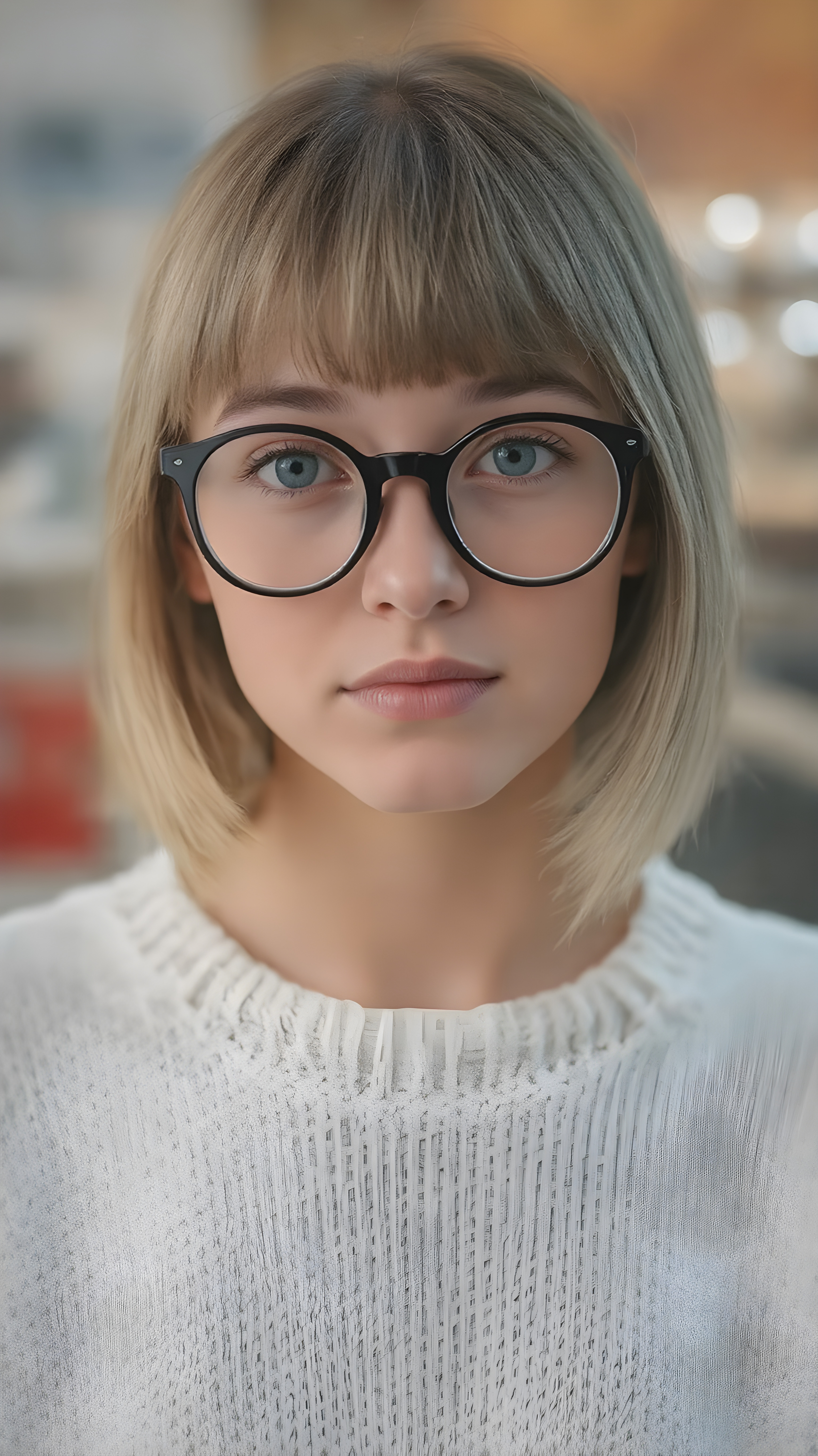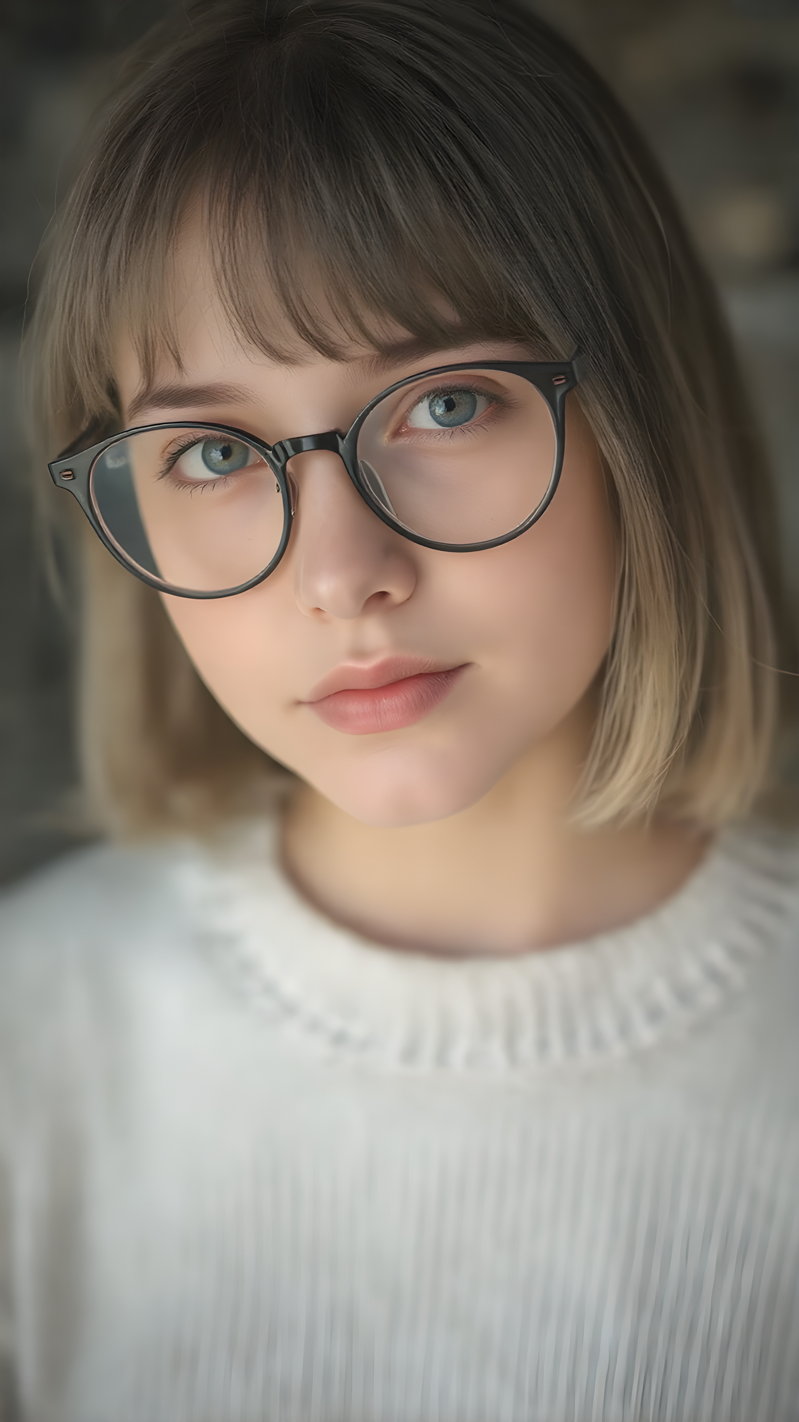 upper body portrait, a cute innocent nerd teen girl, she wears round black glasses, detailed straight soft hair, bangs and bob cut frame her face, perfect curved body, ((stunning)) ((gorgeous)) ((realistic, detailed)) ((cinemaic lights)), she wears a fine sweater made of white wool
