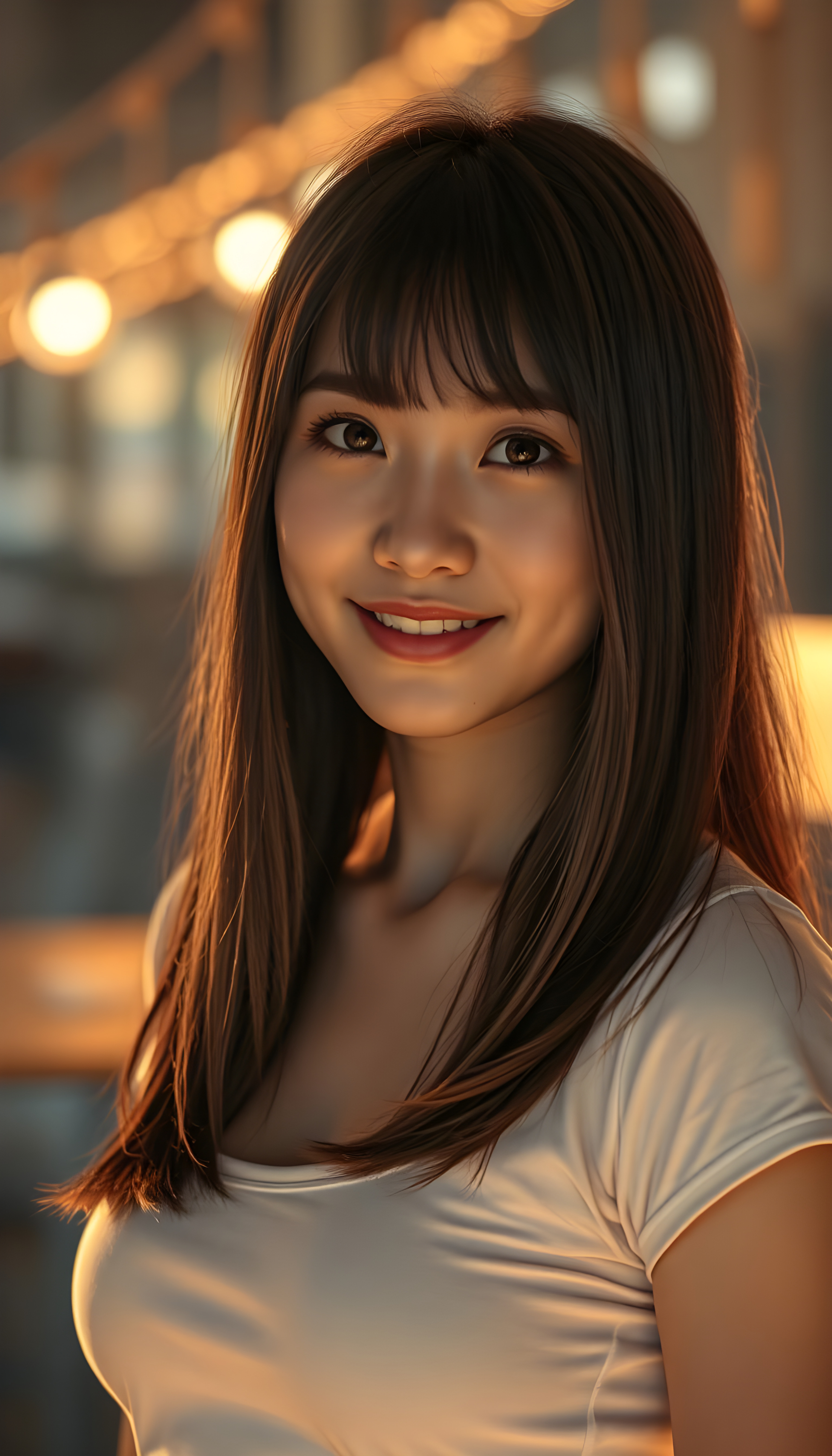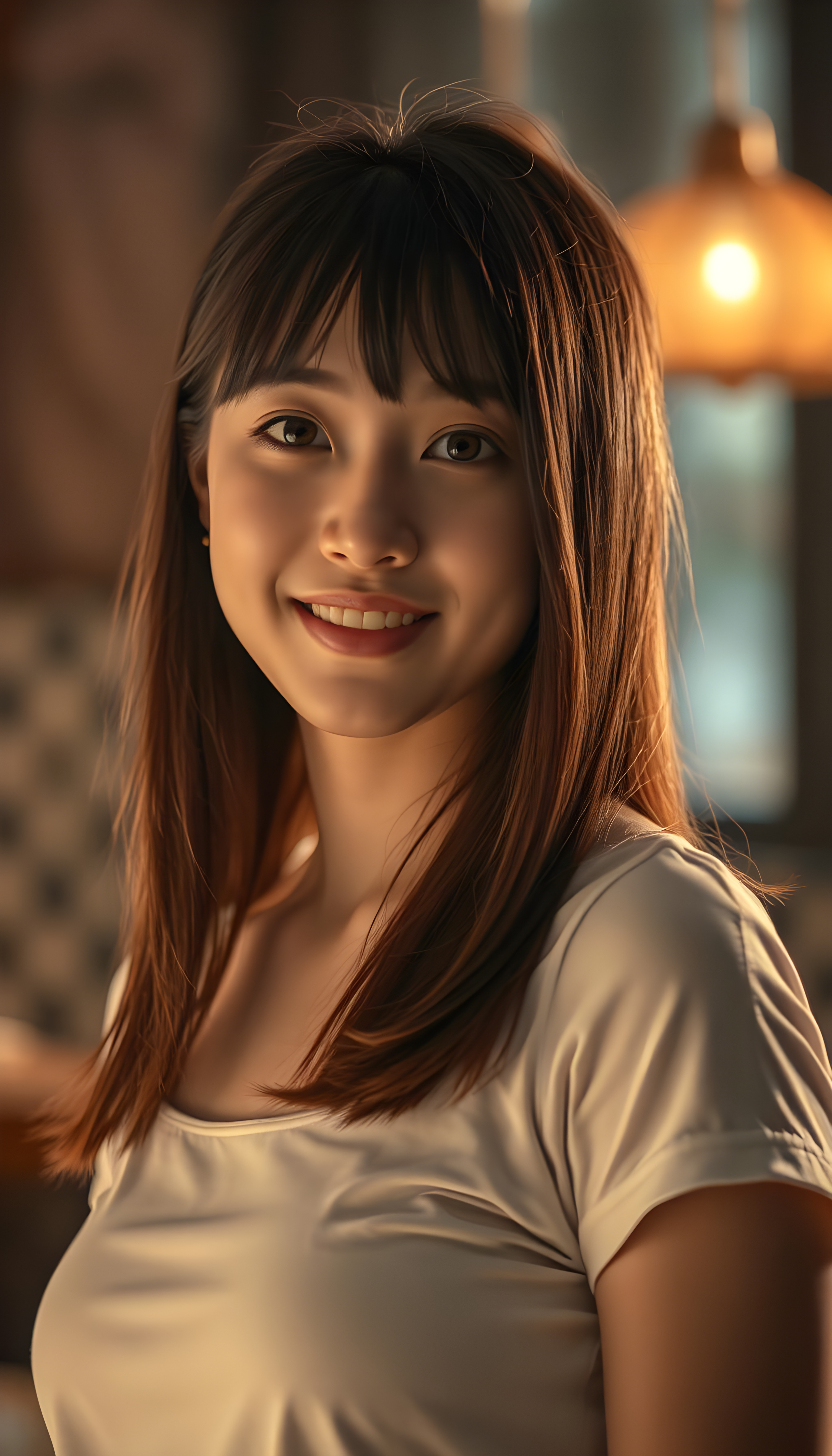 A stunning, highly detailed 8K portrait of a cute teenage girl with a perfect, curvy body and a warm smile. She has Korea-inspired bangs and straight, detailed maroon hair that cascades down her shoulders. Her face is ultra-realistic, with mesmerizing amber eyes that look directly at the viewer. She wears a crisp white short shirt that accentuates her figure. The lighting is warm and golden, casting deep, dramatic shadows that enhance her features. The image is saturated and vibrant, with a film grain texture that adds a nostalgic touch. The focus is sharp on her face and upper body, while the background is softly blurred, creating a beautiful depth of field effect.