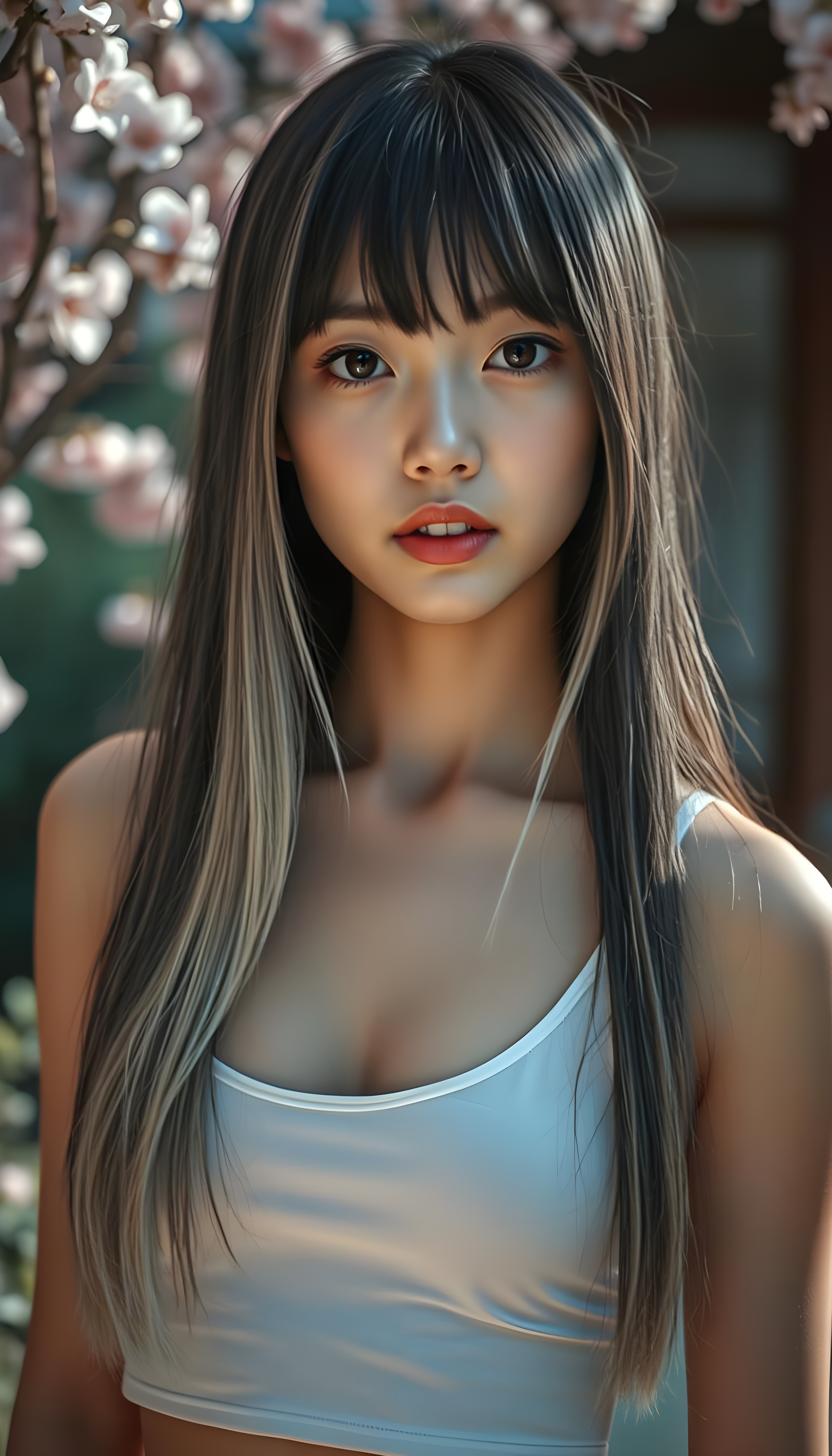 A stunningly detailed, super-realistic image of a cute Asian girl with long, straight black hair and blond highlights cascading down her shoulders, bangs frame her round face. Full red kissable lips, white teeth. Amber shiny eyes. She wears a crisp white short tank top, low neckline, her body curving perfectly in a flattering silhouette. Her large, expressive eyes reflect a hint of melancholy as she gazes directly at the camera, her skin glowing with a soft, warm light that enhances her youthful radiance. The background is a vibrant, softly blurred garden scene with blooming cherry blossoms, creating a serene and enchanting atmosphere. The composition balances her delicate features with the lush, colorful environment, making the image both captivating and emotionally resonant.