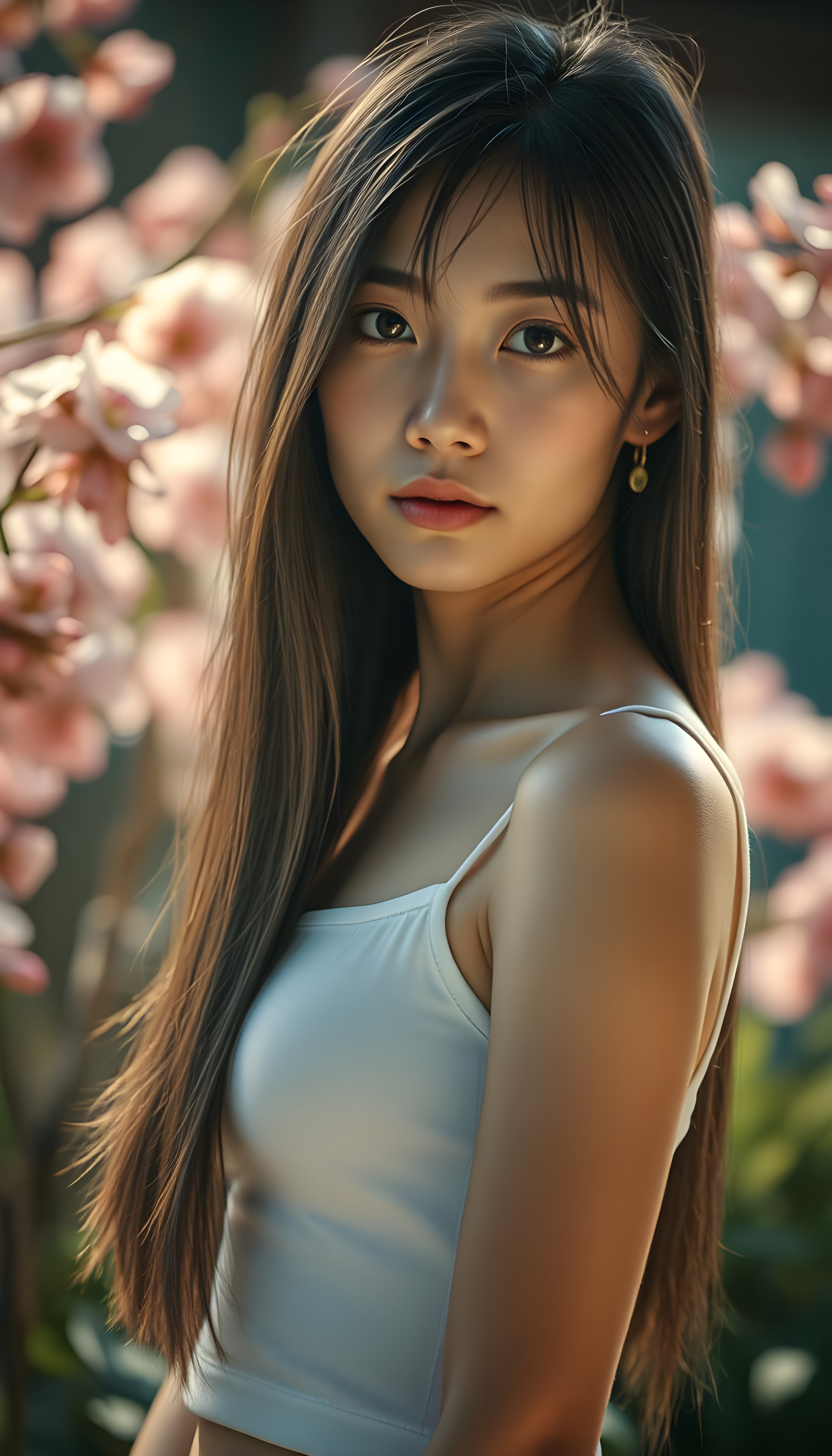A stunningly detailed, super-realistic image of a cute Asian girl with long, straight hair cascading down her shoulders. She wears a crisp white short tank top, her body curving perfectly in a flattering silhouette. Her large, expressive eyes reflect a hint of melancholy as she gazes directly at the camera, her skin glowing with a soft, warm light that enhances her youthful radiance. The background is a vibrant, softly blurred garden scene with blooming cherry blossoms, creating a serene and enchanting atmosphere. The composition balances her delicate features with the lush, colorful environment, making the image both captivating and emotionally resonant.