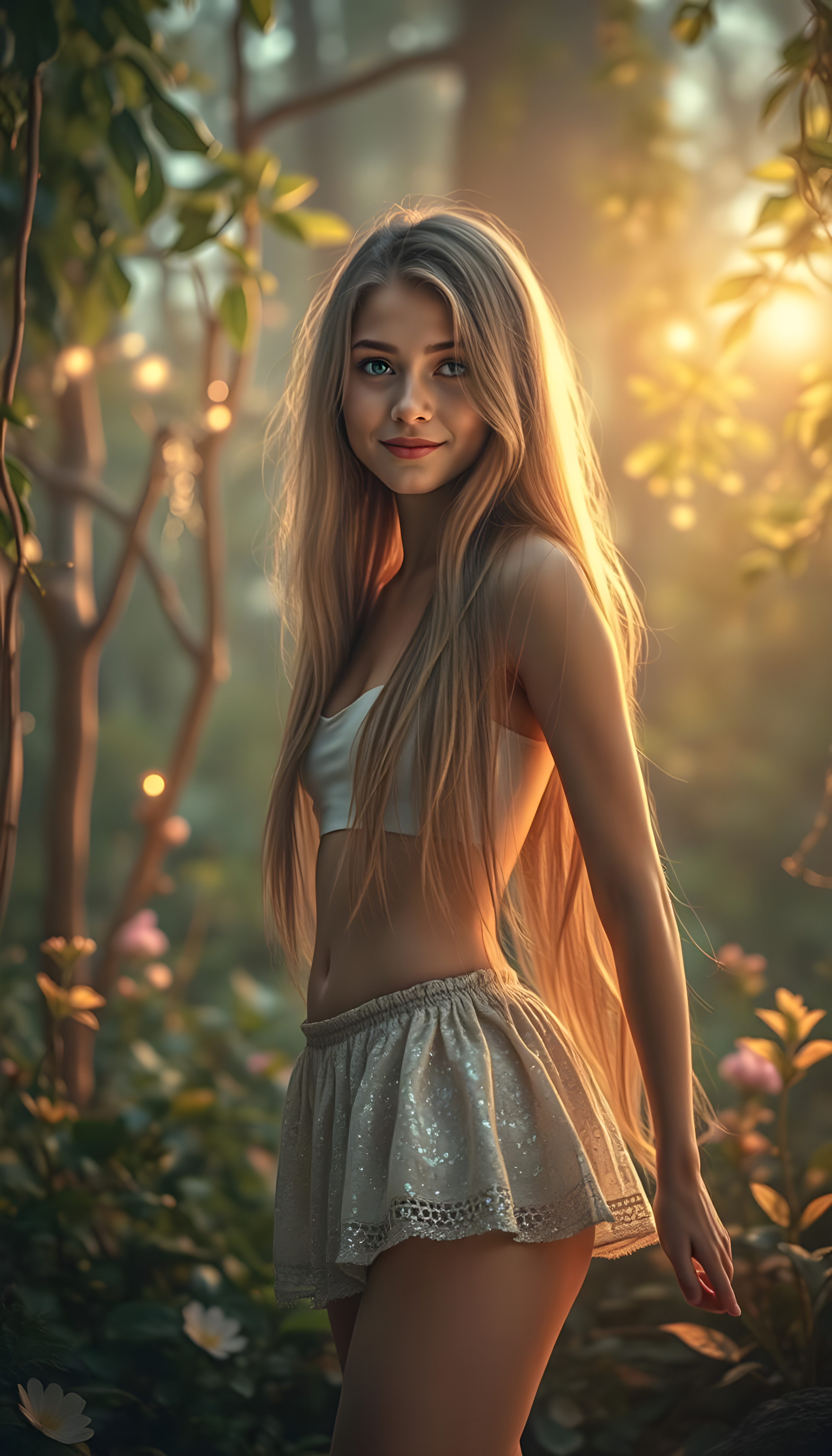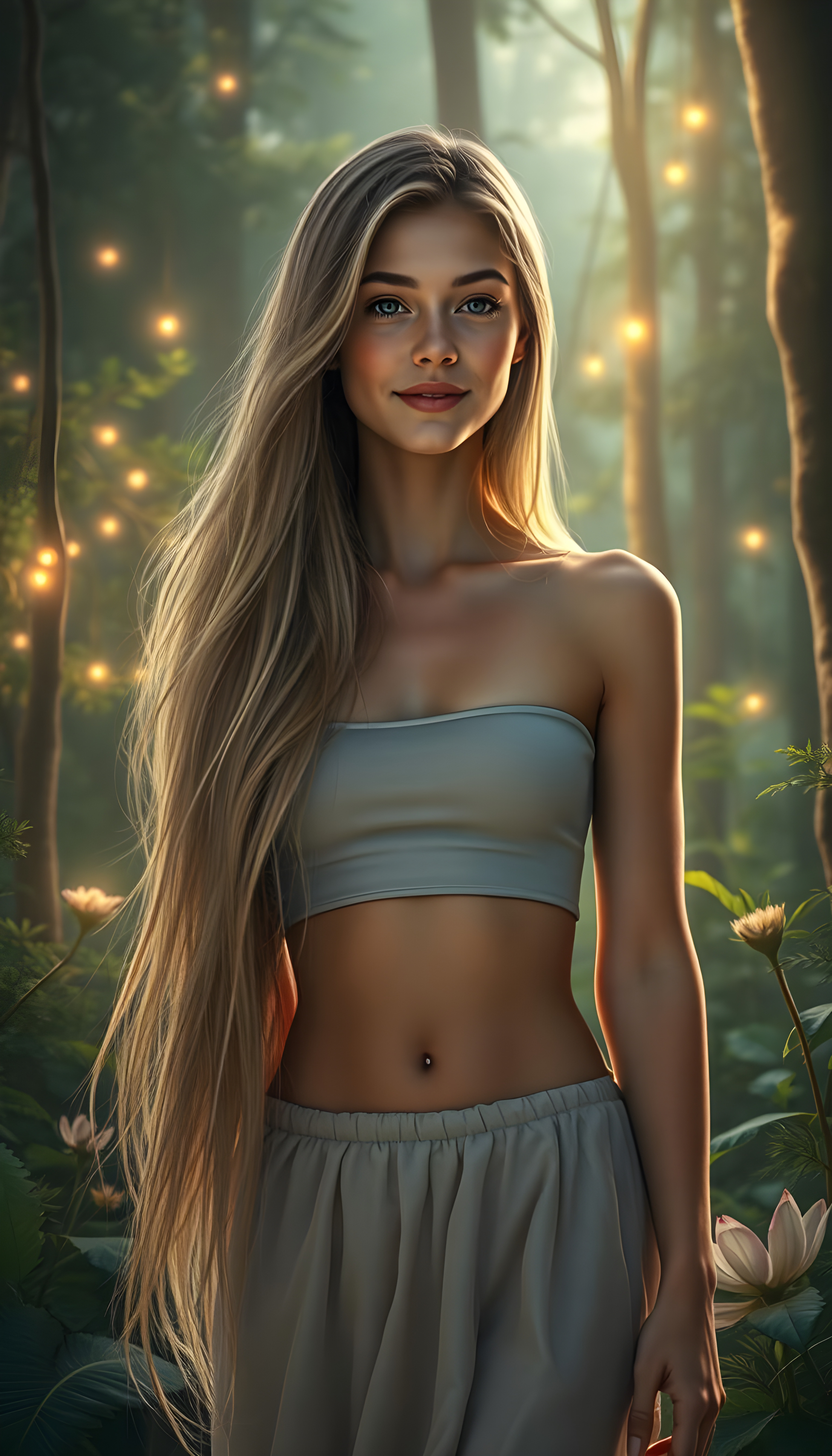 A vibrant, enchanting scene featuring a stunning teenage girl with long, flowing hair that cascades like a golden waterfall. Her figure is perfectly sculpted, exuding grace and allure. She stands in a mystical forest, where the trees are aglow with ethereal lights, casting a magical ambiance. The woman wears a short cropped tank top, round mini skirt that shimmers in the soft, moonlit light, blending harmoniously with the serene environment. Her eyes sparkle with wisdom and kindness, and her smile is warm and inviting. The background is filled with lush, vibrant flora and fauna, with a soft, dreamy color palette dominated by shades of green, gold, and pastel hues, creating a whimsical and enchanting atmosphere. The overall composition is both dynamic and tranquil, capturing the essence of beauty and serenity.