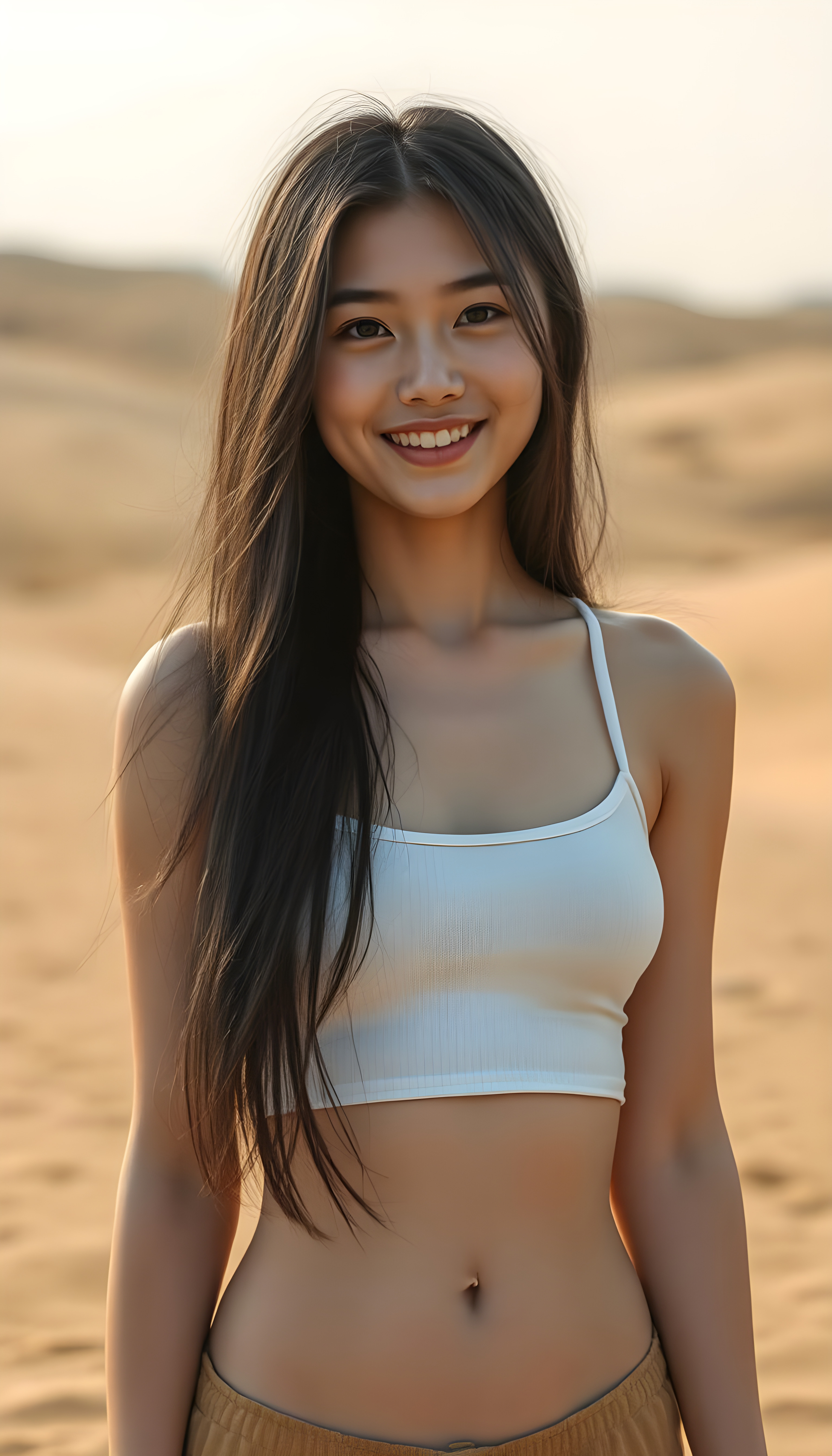 a beautifully (((super realistic young Korean girl))), she stands alone in a sandy yellow desert, with a curvy figure and intricate details, dressed in a (((super short, tight white tank top))), paired with a (((round, short mini skirt))), with long, flowing black hair with blond highlights, happy, withe teeth, stunning, realistic, detailed