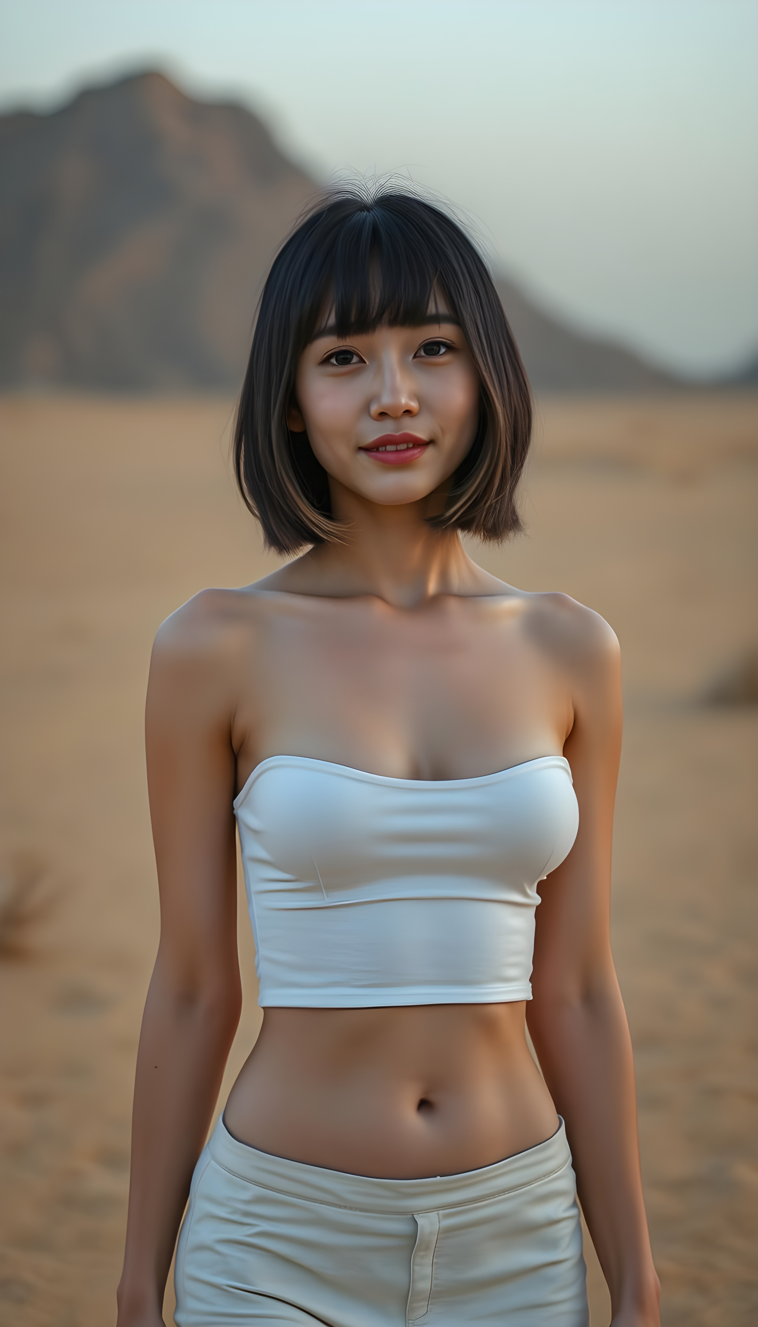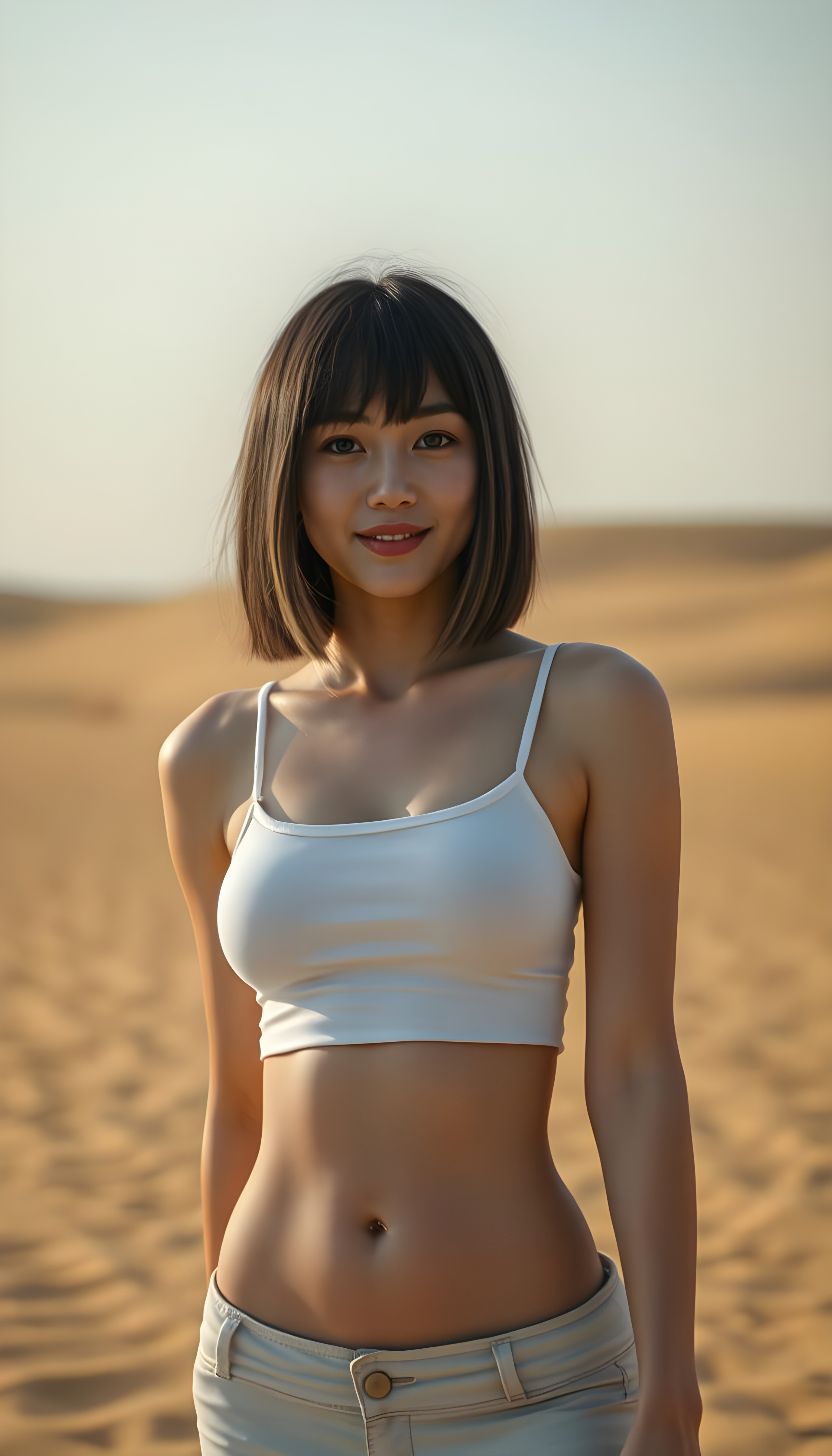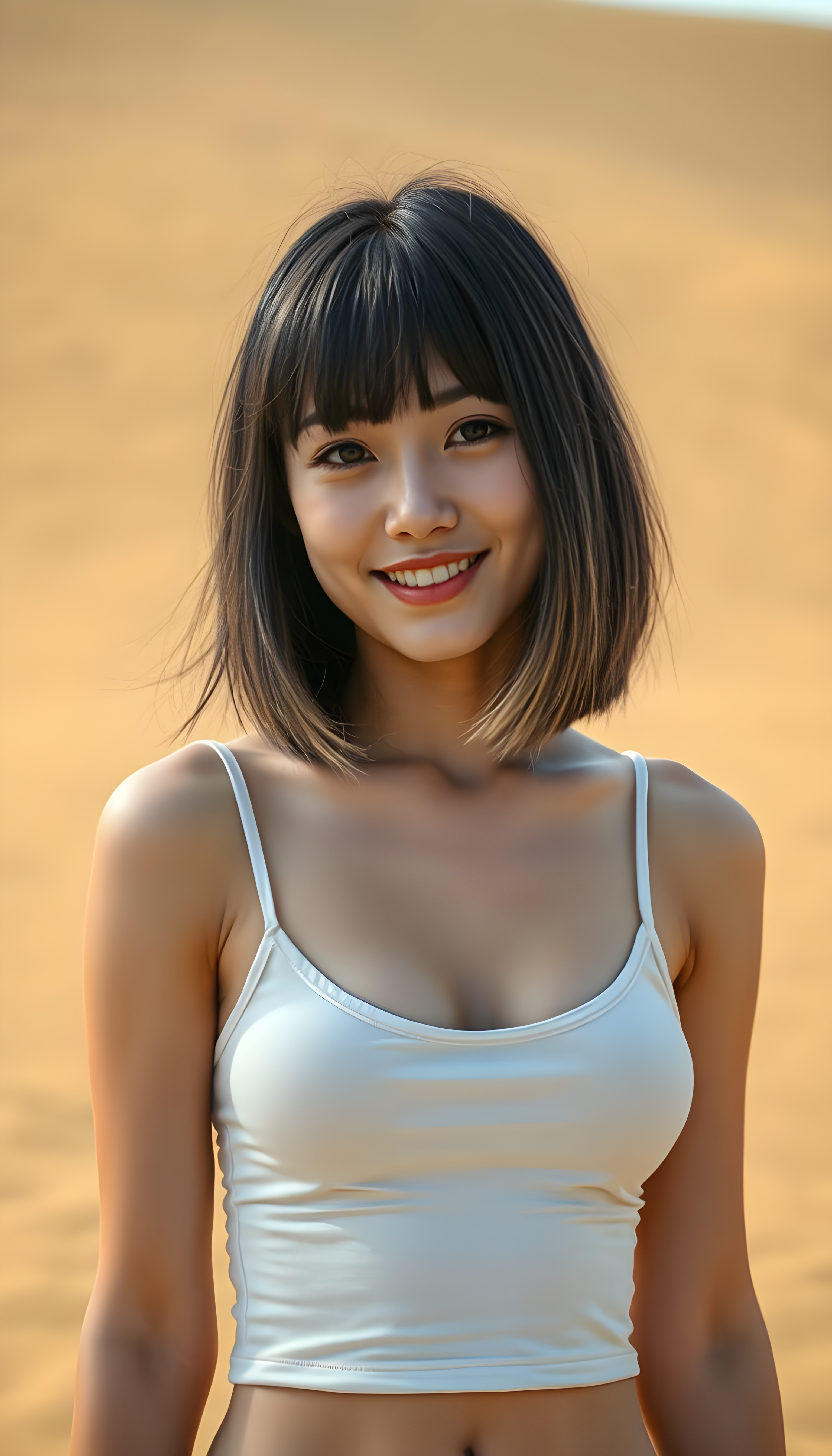 a beautifully hot (((super realistic young busty Korean girl, perfect bangs))), she stands alone in a sandy yellow desert, with a curvy figure and intricate details, dressed in a (((super short, tight white tank top))), paired with a (((round, short mini skirt))), straight shoulder long black hair with blond highlights, bob cut, happy, white teeth, stunning, realistic, detailed