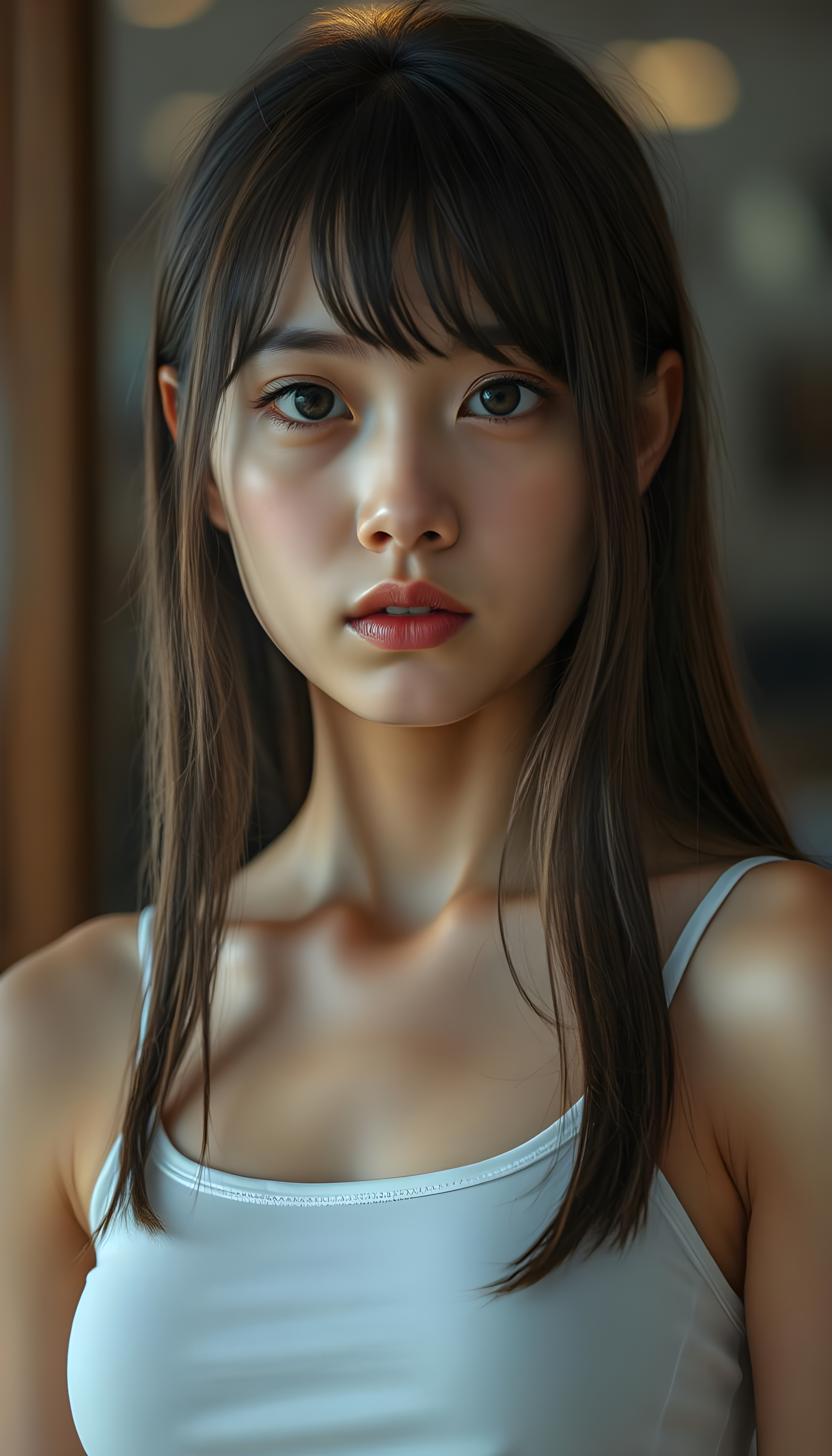 super realistic, detailed face, cute Asian girl, long straight hair, realistic detailed eyes, wear white short tight tank top, looks sadly at the camera, perfect curved body