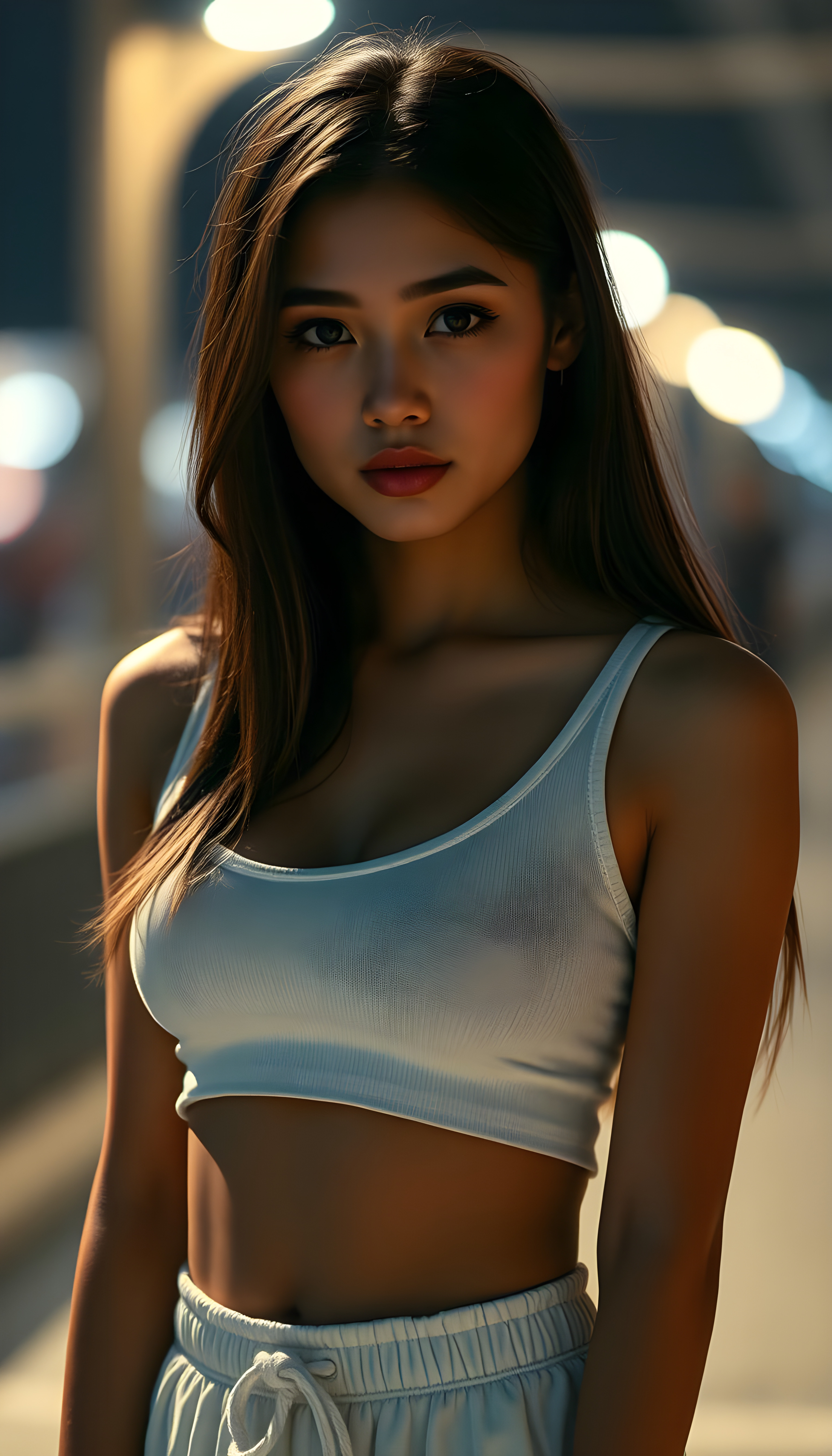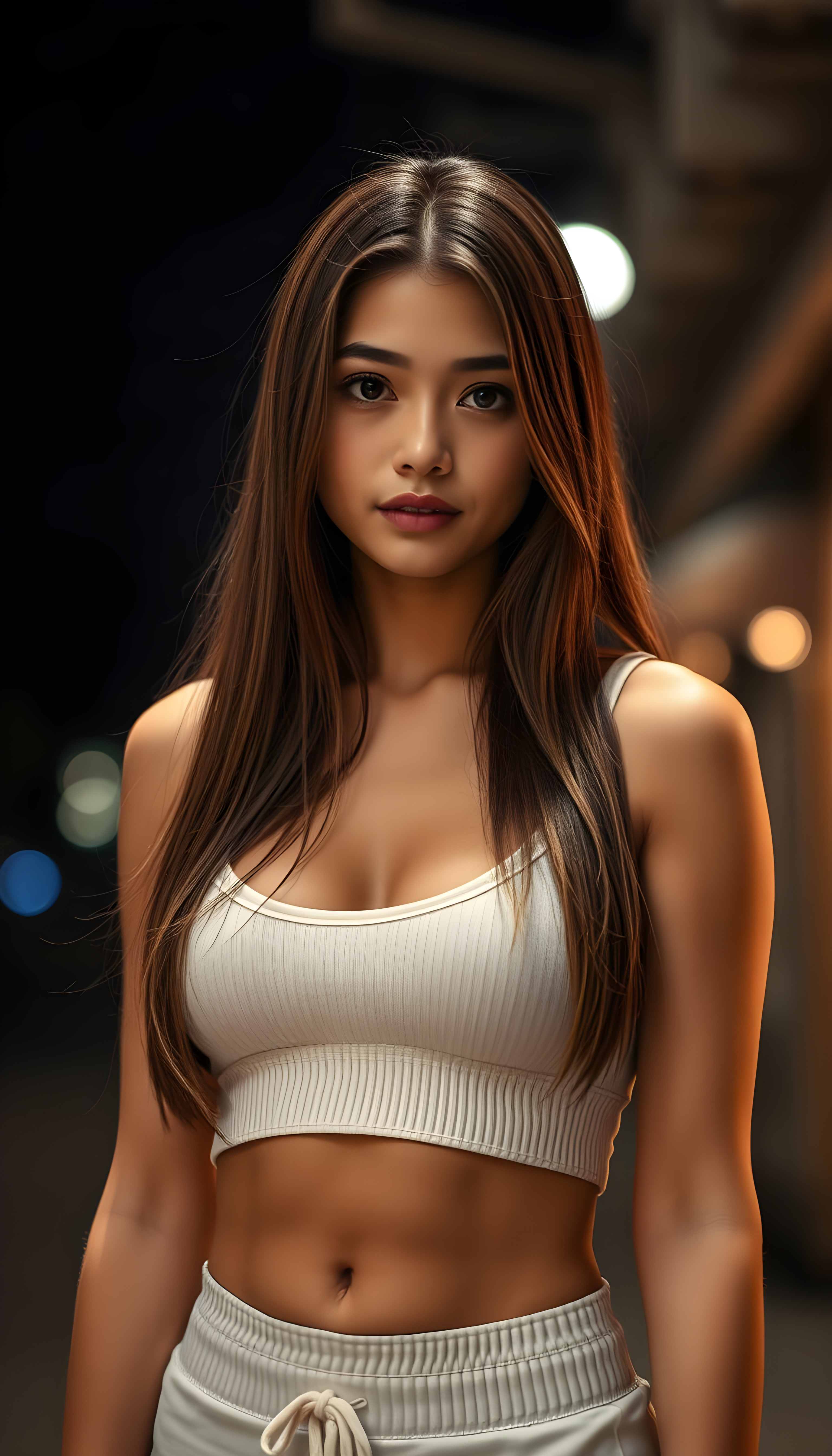 a ((gorgeous)) ((stunning)) cute young well busty girl, portrait, she wears a thin white and fine wool cropped sport tank top deep neck, fine open straight silky hair, you can see her cute belly button, all against a nightly backdrop