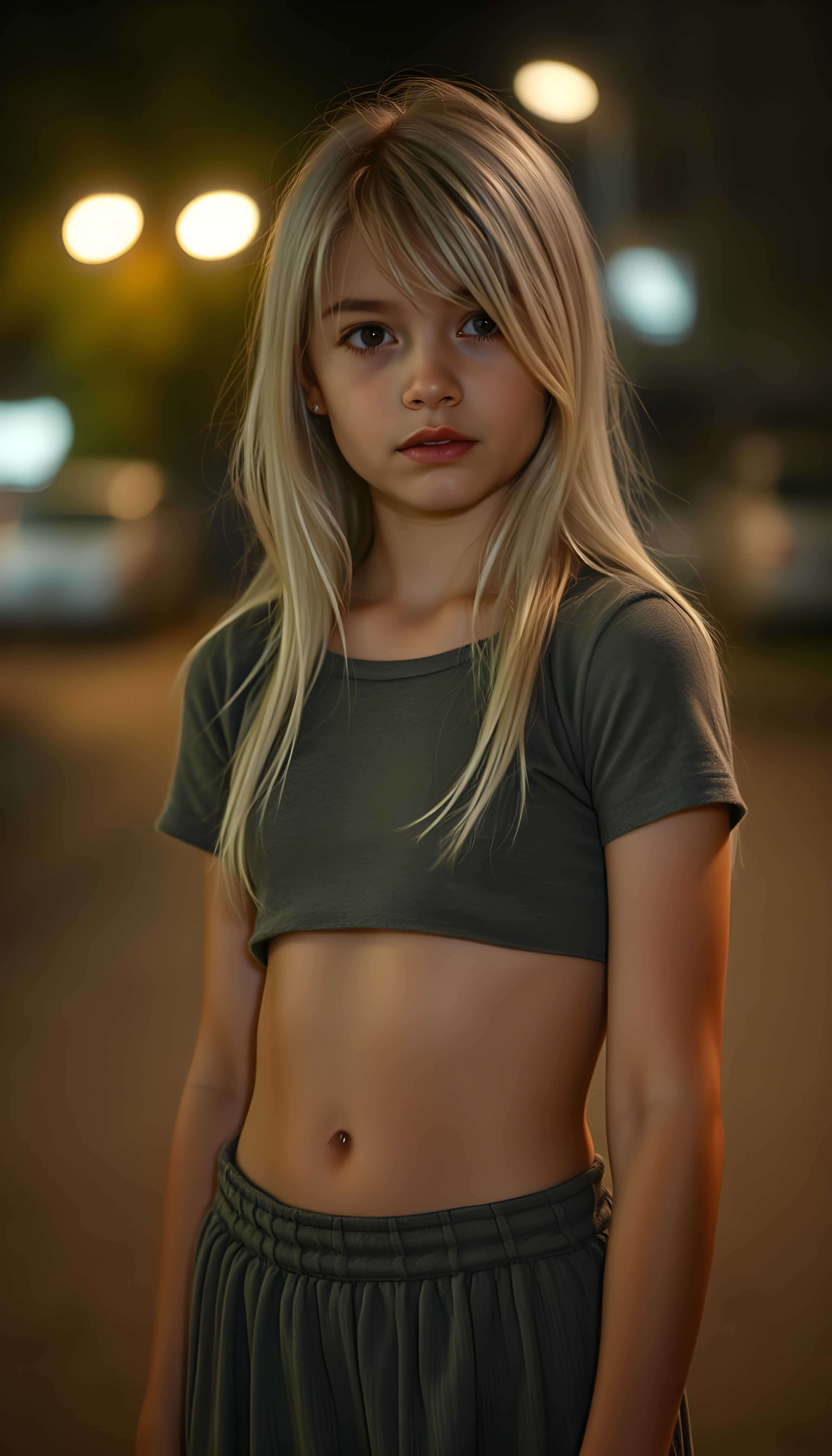 a ((gorgeous)) ((stunning)) cute young girl, full body portrait, thin and fine wool cropped t-shirt and a round short mini skirt, fine open straight snow white silky hair, you can see her cute belly button, all against a nightly backdrop
