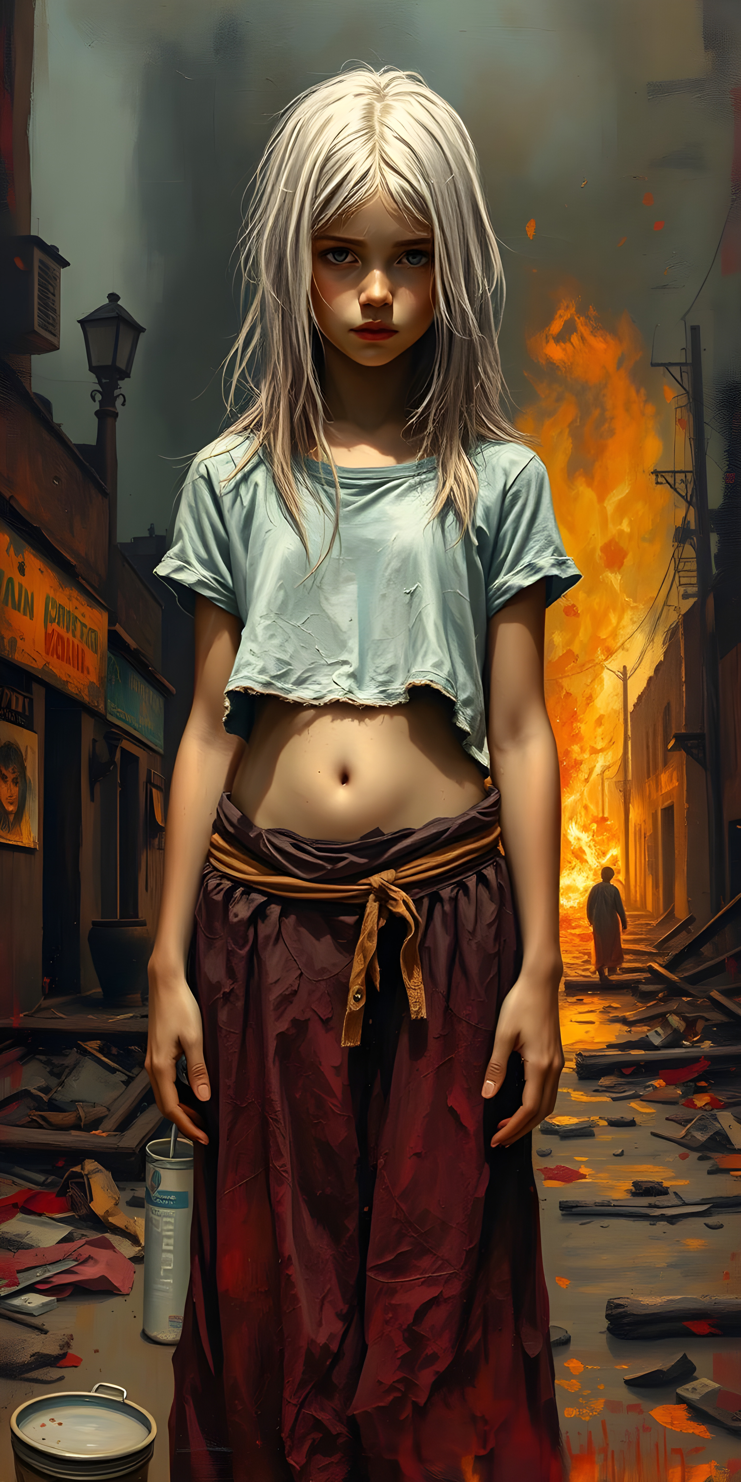 a ((gorgeous)) ((stunning)) cute young sad girl, full body realistic portrait, poor dressed in a thin and fine tattered cropped t-shirt and a round long skirt, fine open straight snow white silky hair, she stands i a destroyed street in a burning city