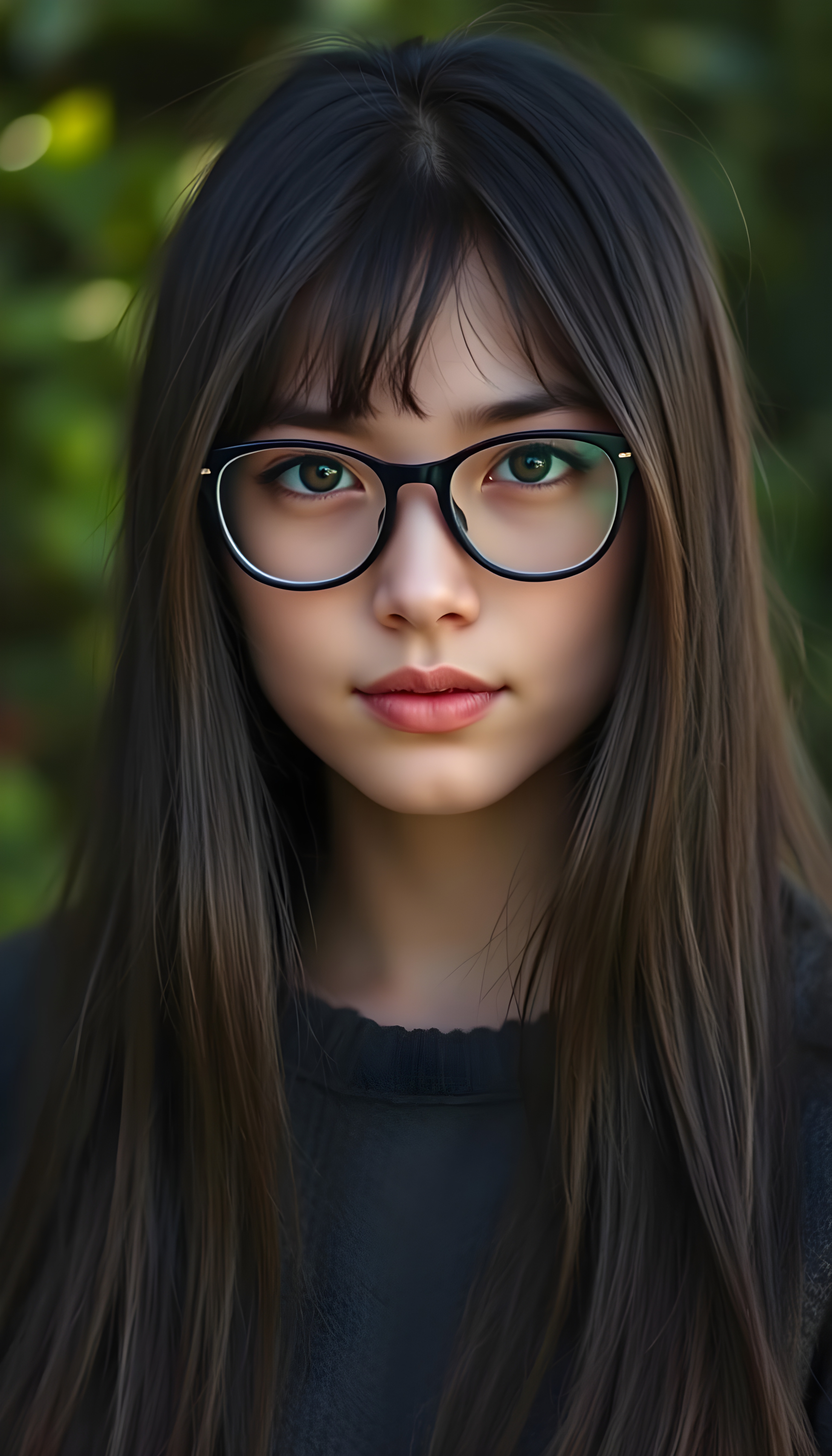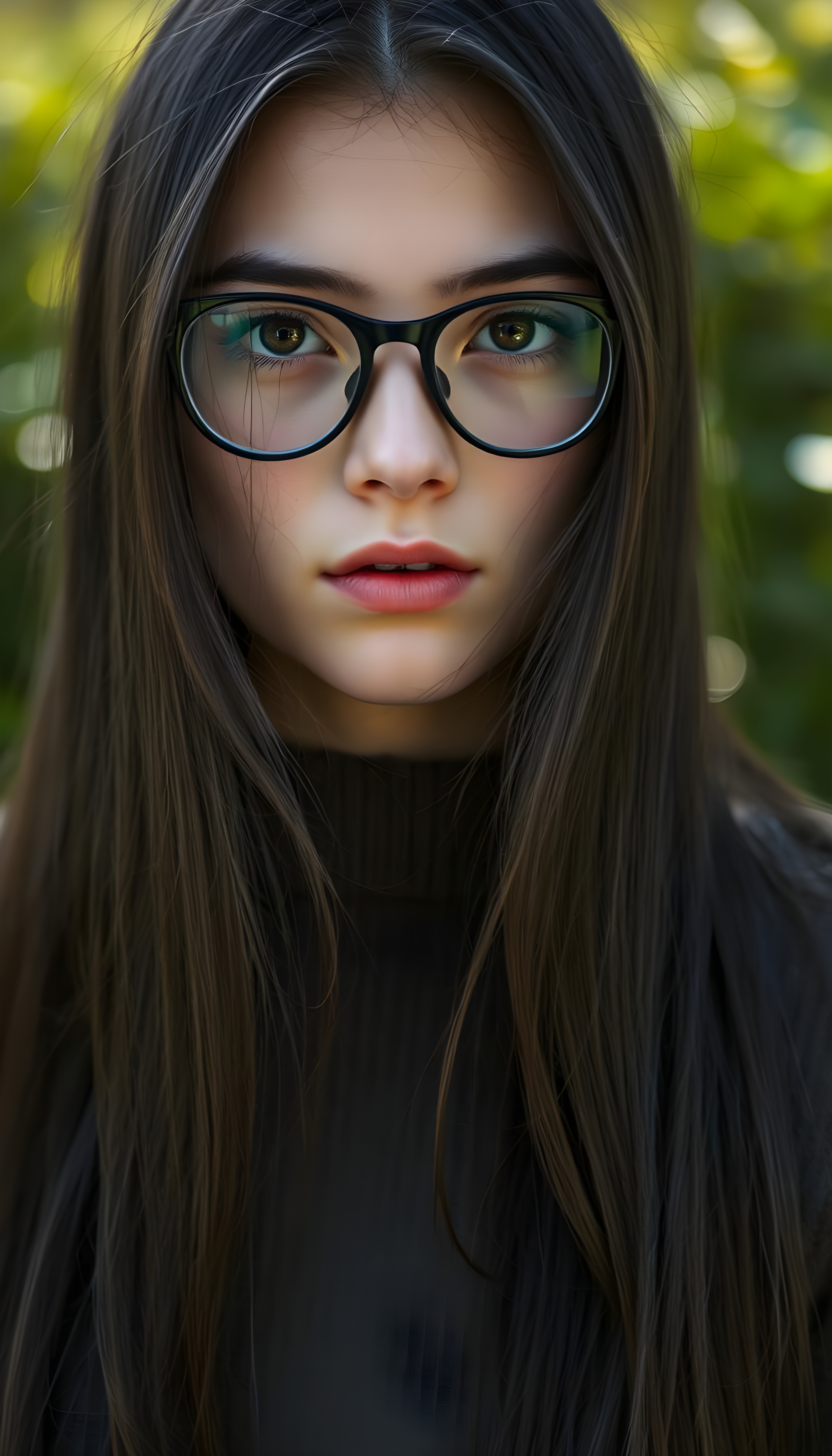 portrait from a stunningly beautiful young nerd girl, wearing a large, dark prescription glasses, age 18, with ((black long straight jet super soft hair (luminous)), flowing down to her waist, and (((bright amber eyes))), that match perfectly with her flawless complexion. She’s dressed in a tight ((wool sweater)), perfectly complemented by her (perfectly proportioned figure). Her look exudes seduction and playfulness, as she gazes directly at the viewer, all against a sunny green backdrop
