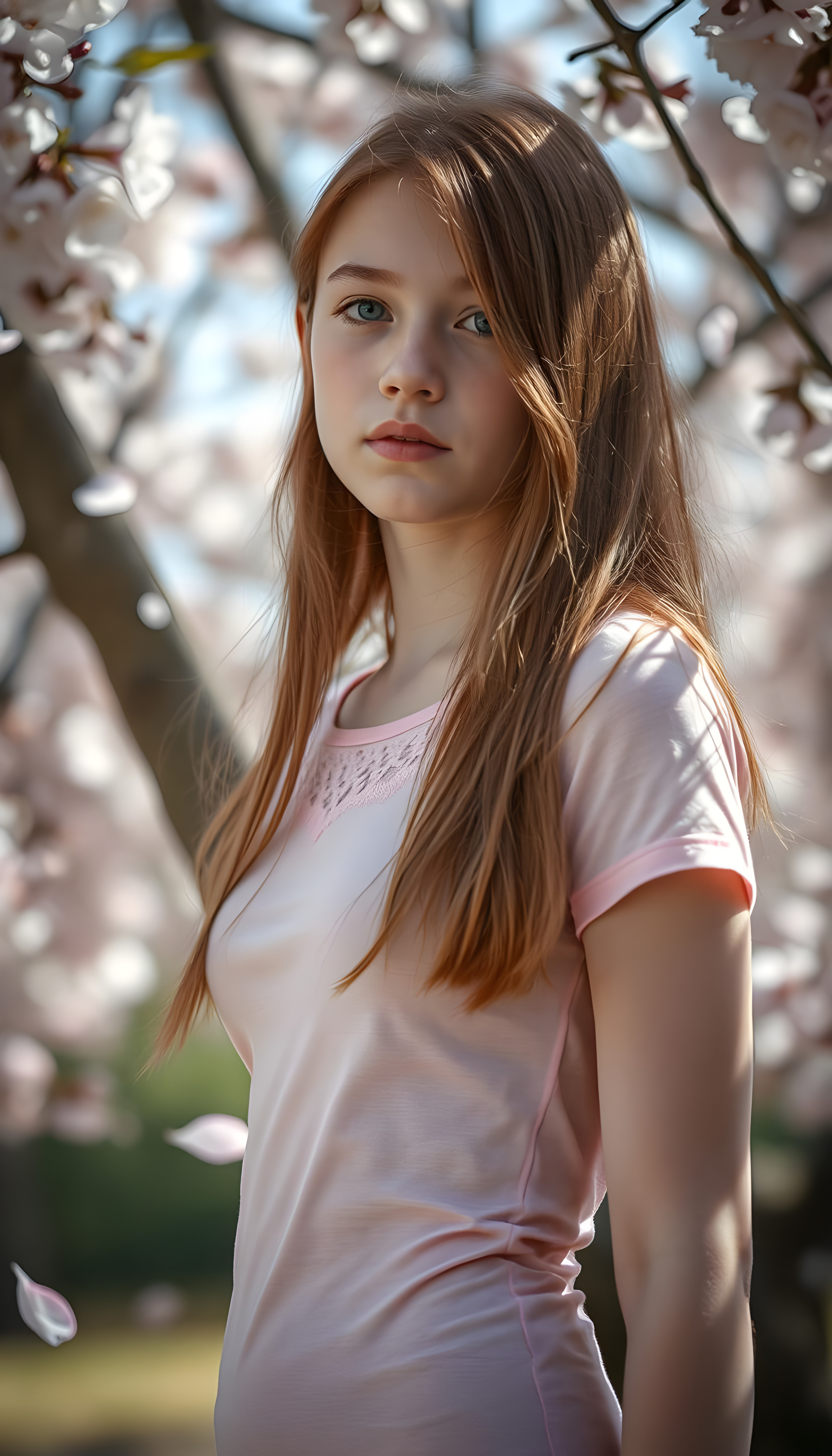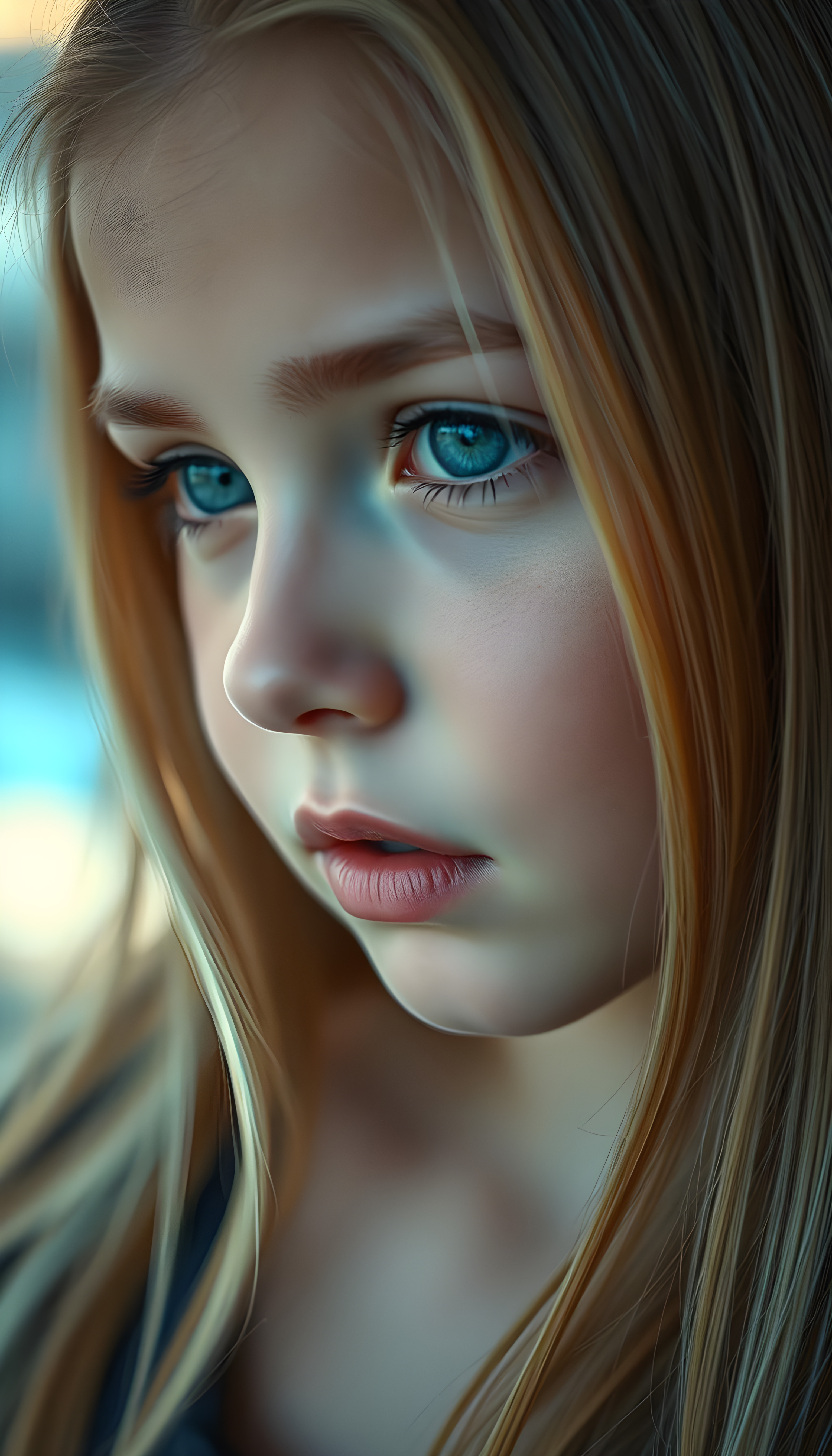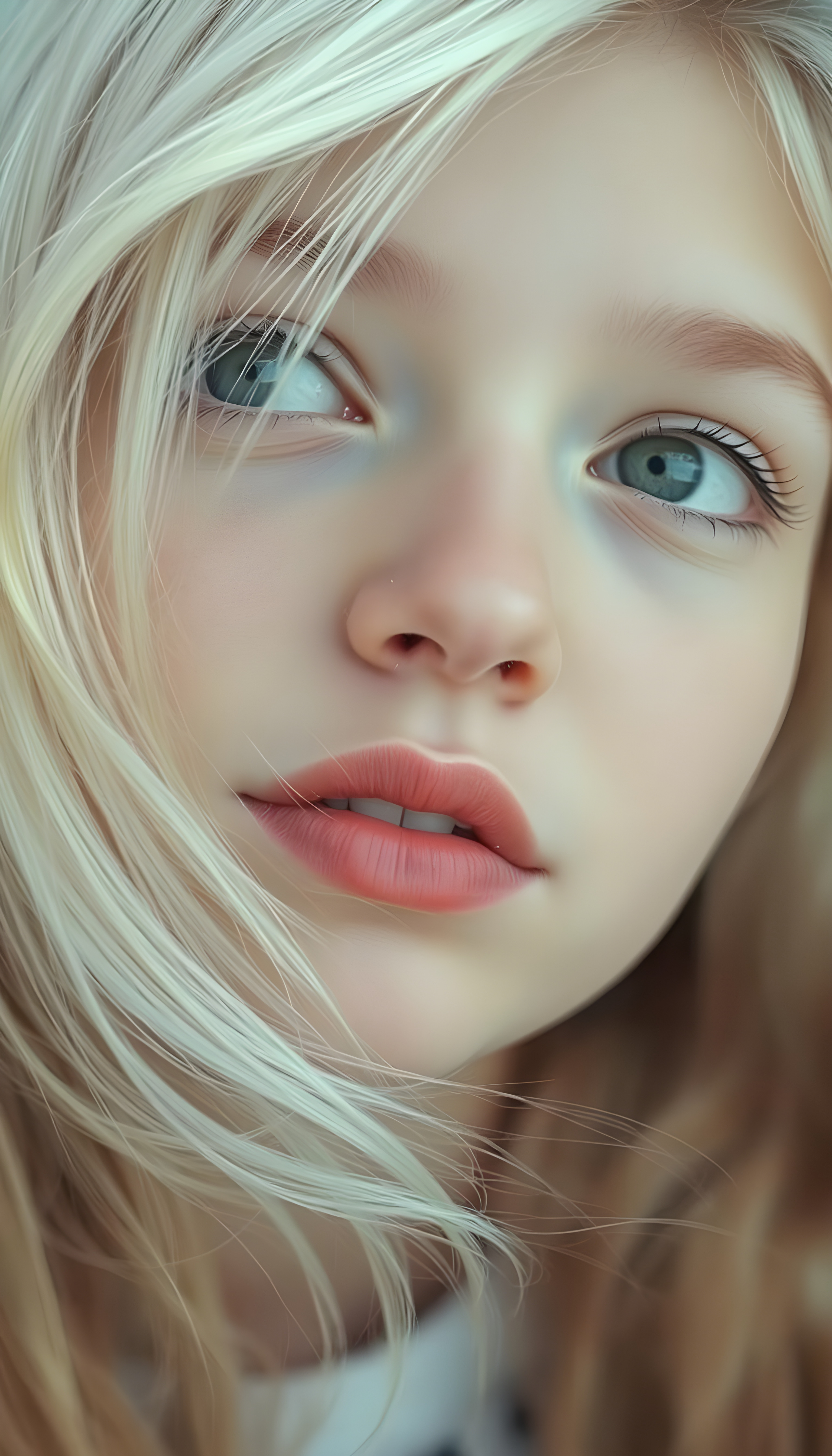 A nostalgic photo shows a young adult teen girl with white, silky smooth, soft, fine hair, looking dreamily at the viewer. She has flawless skin, delicate lips, and white teeth. A round, angelic face gently framed by her hair. Soft light falls into her deep blue, shining eyes. The image has a peaceful effect. Her mouth is slightly open and inviting a kiss with half closed eyes, she looks up to the viewer, seductive, side view
