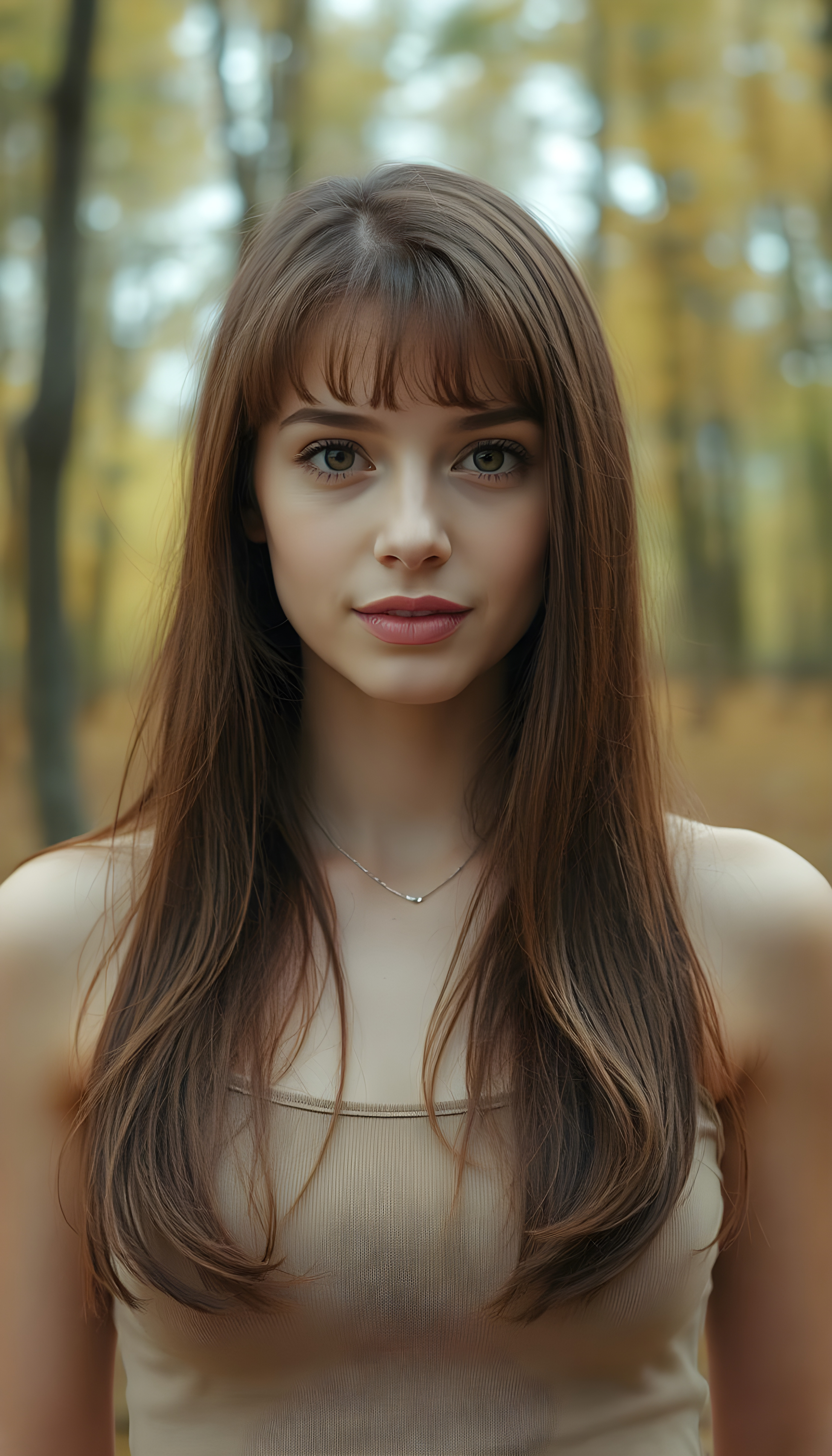 A beautiful photo of a young girl with long, straight, soft hazelnut brown hair. She is looking up with her eyes closed, her mouth slightly open, and she has soft, full lips. White teeth. The image is very peaceful. The girl has a perfectly feminine figure and is wearing a translucent crocheted tank top with a low neckline, all against a black backdrop