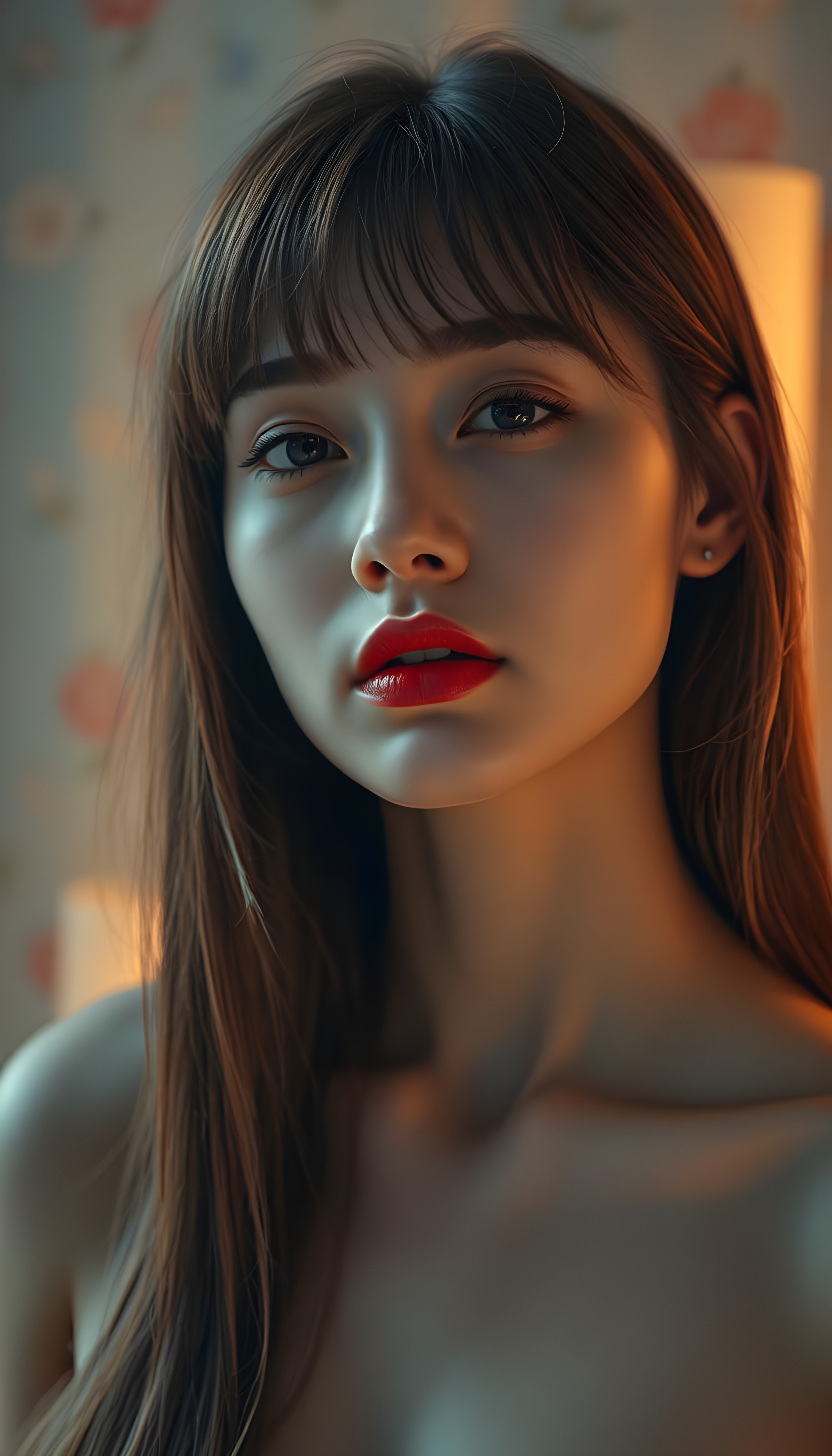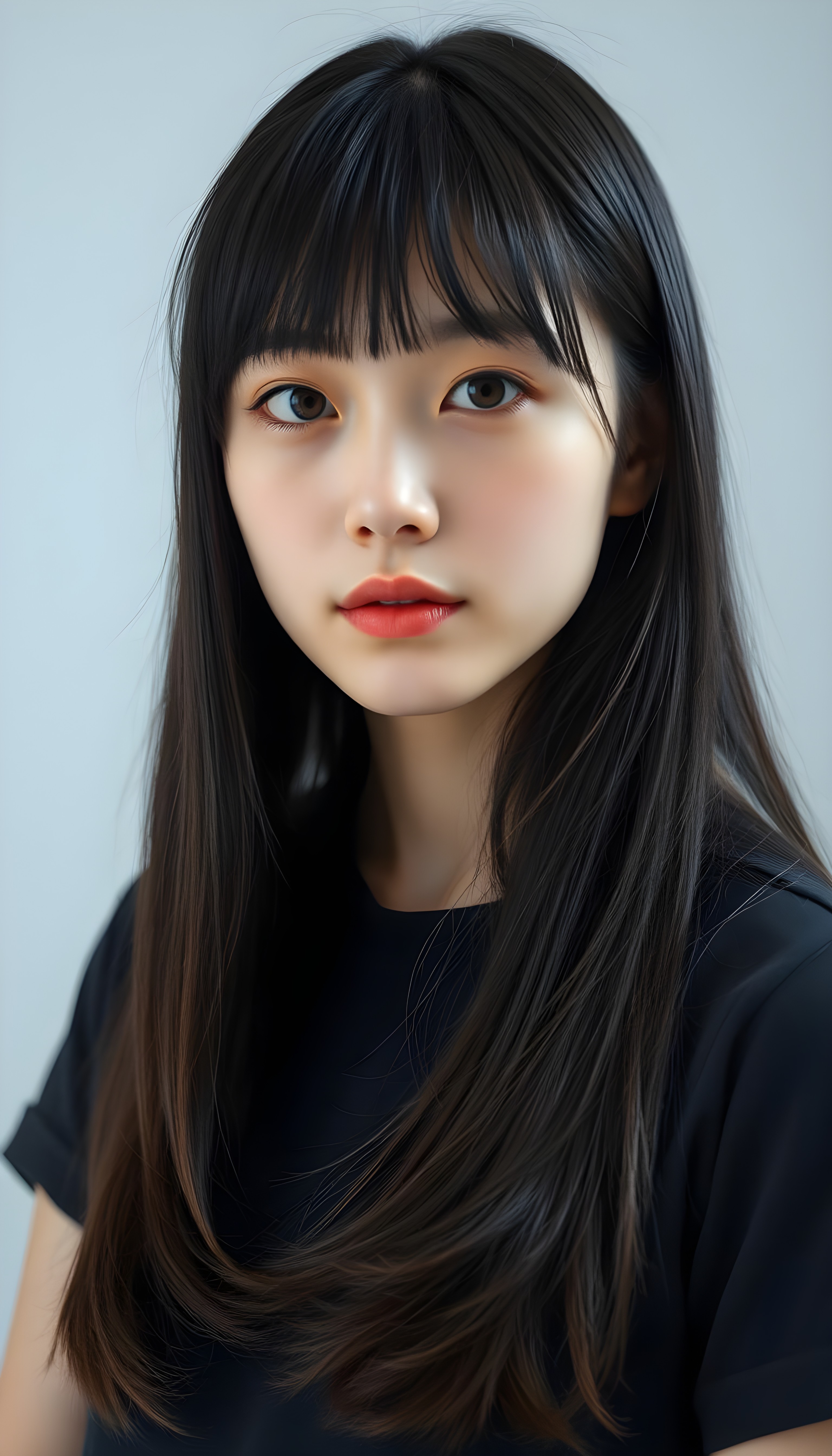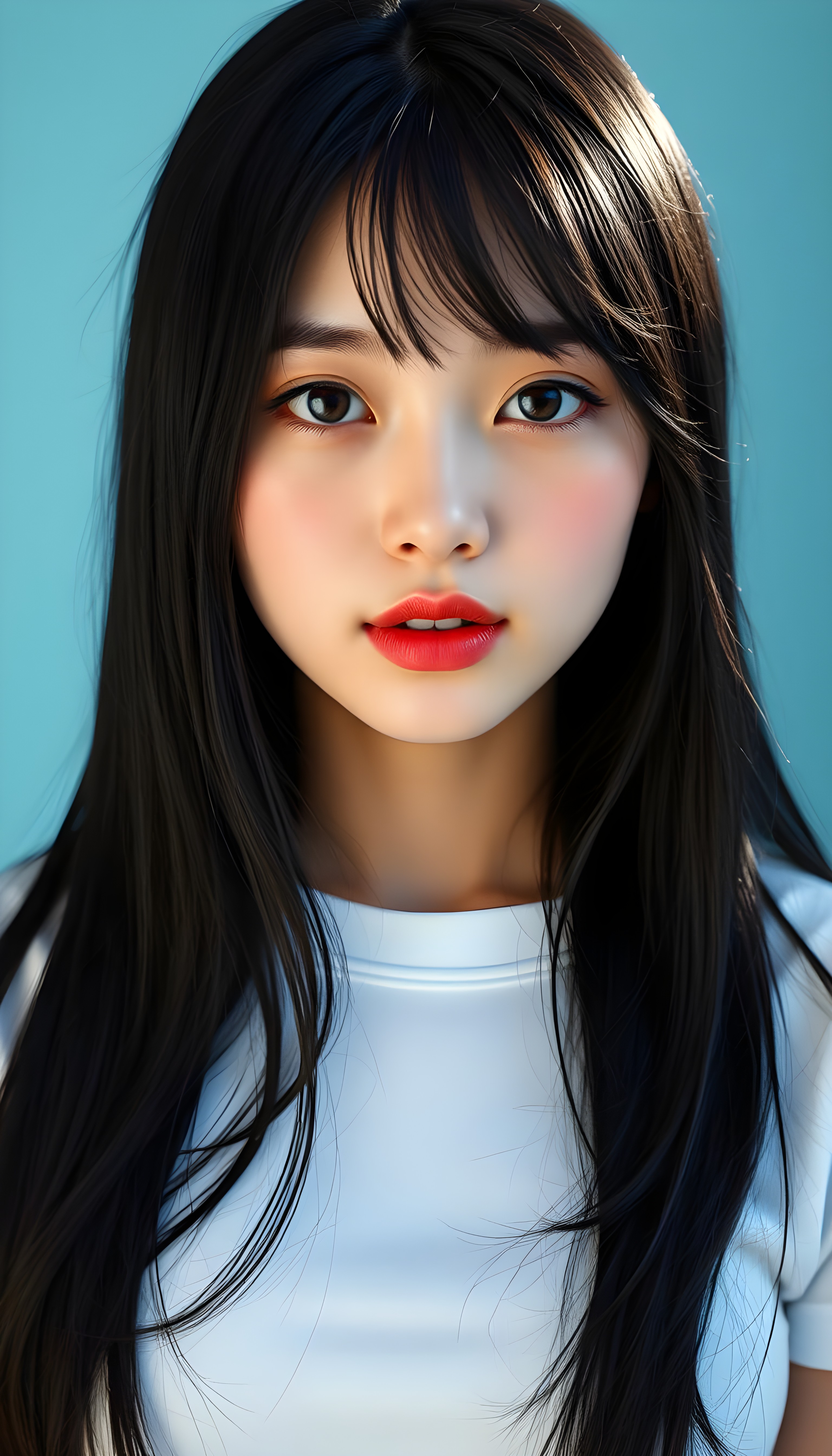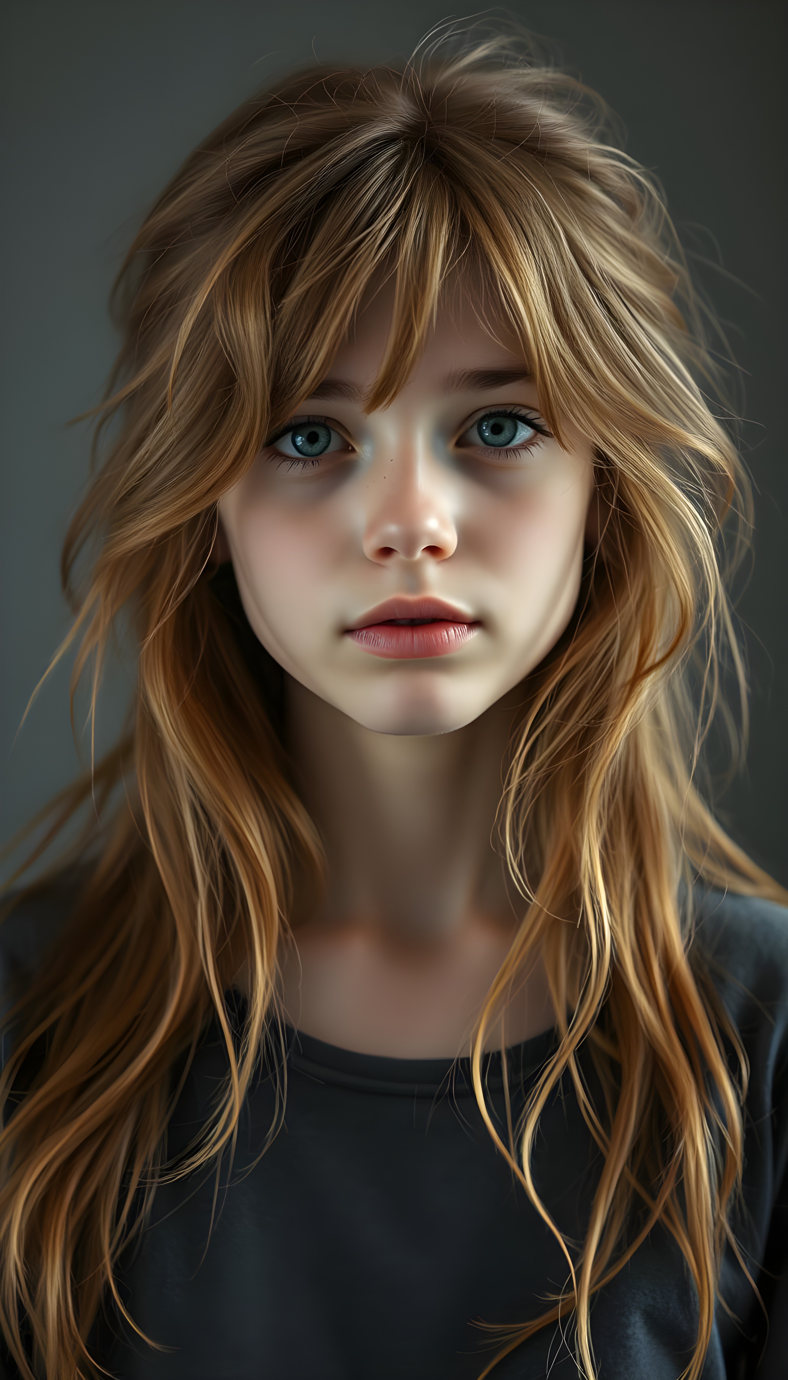 upper body portrait shot, a innocent teen girl with a round face, tousled, frizzy long copper hair, full lips and deep blue eyes, super realistic face, grey backdrop
