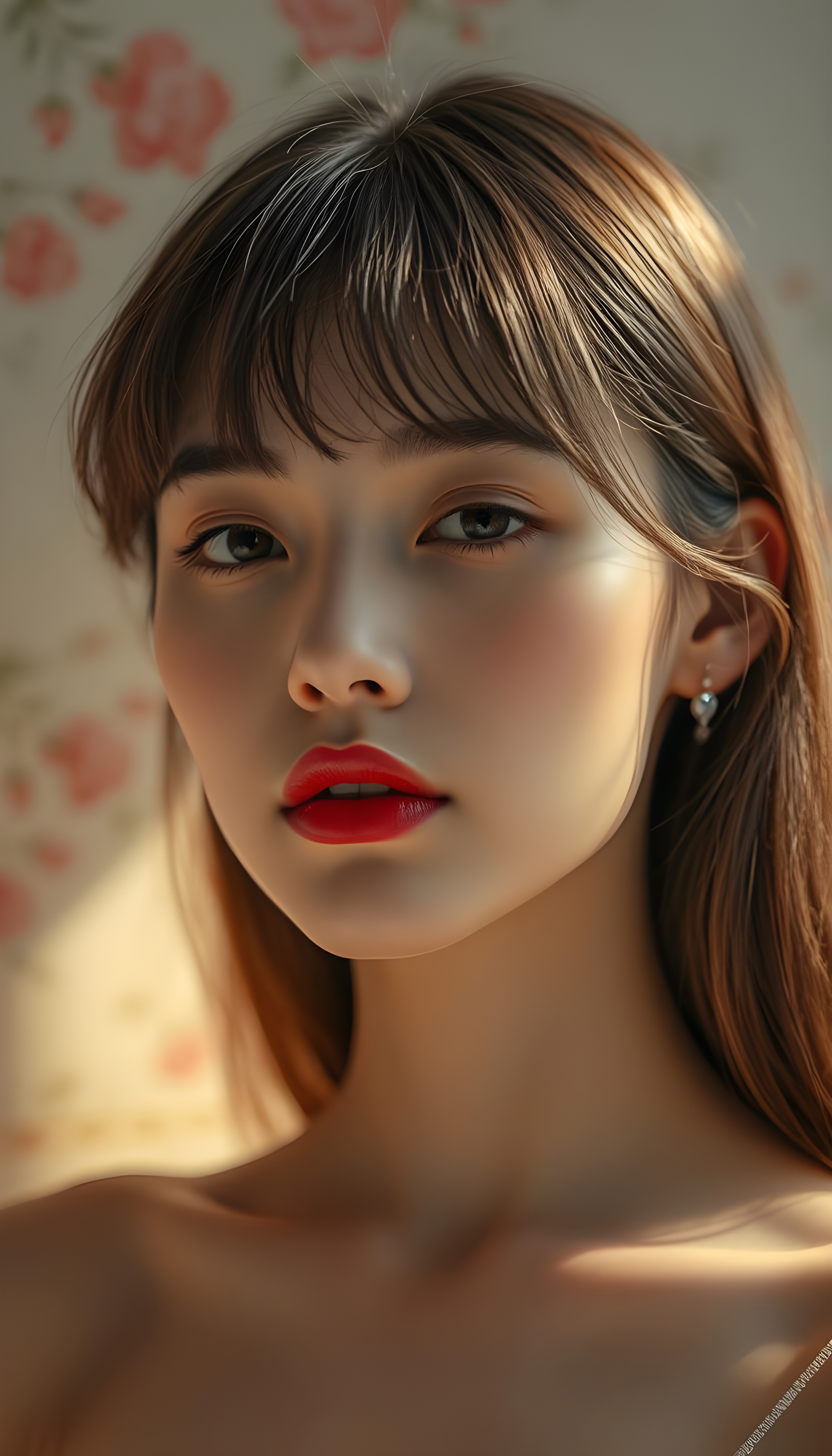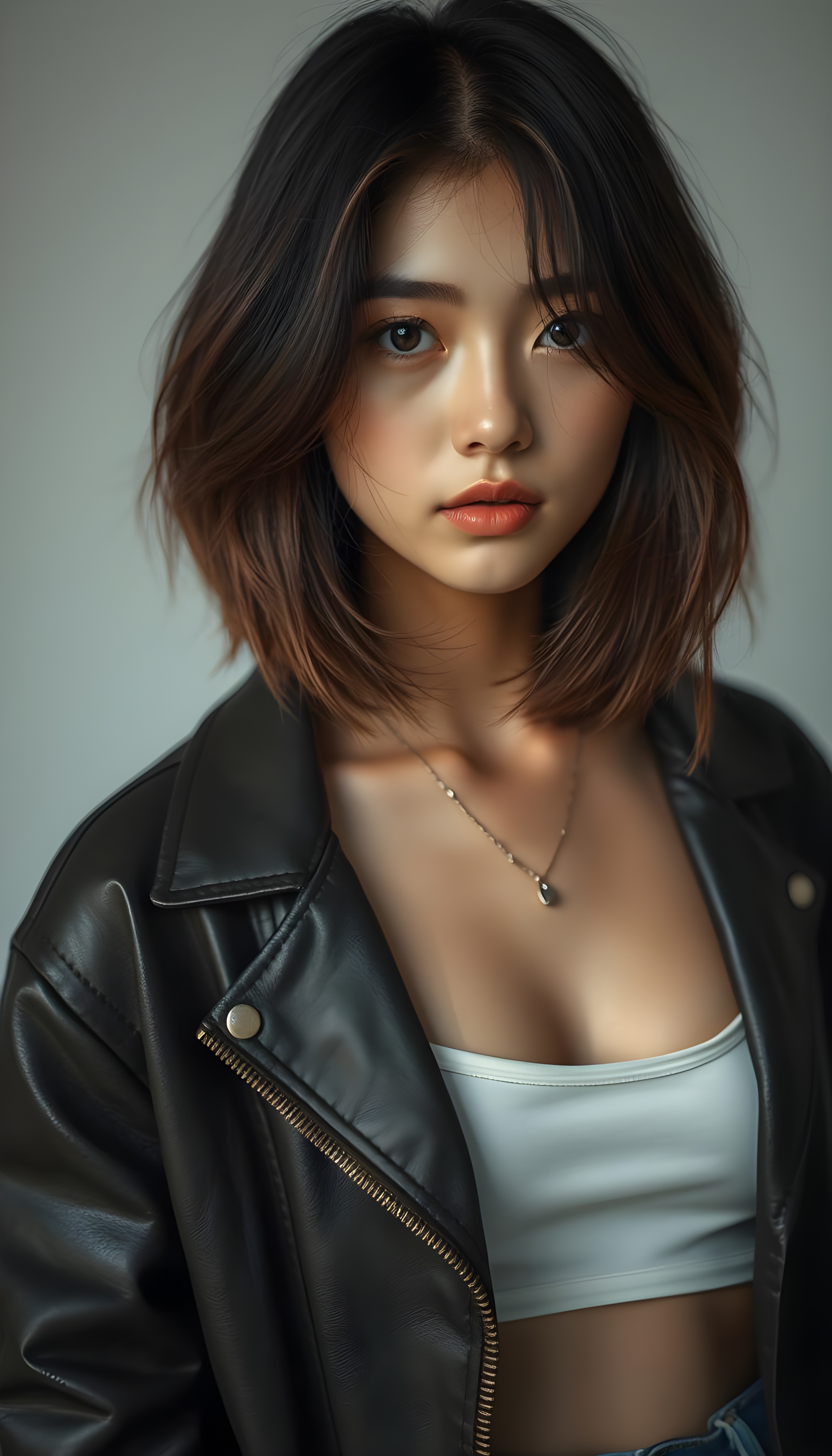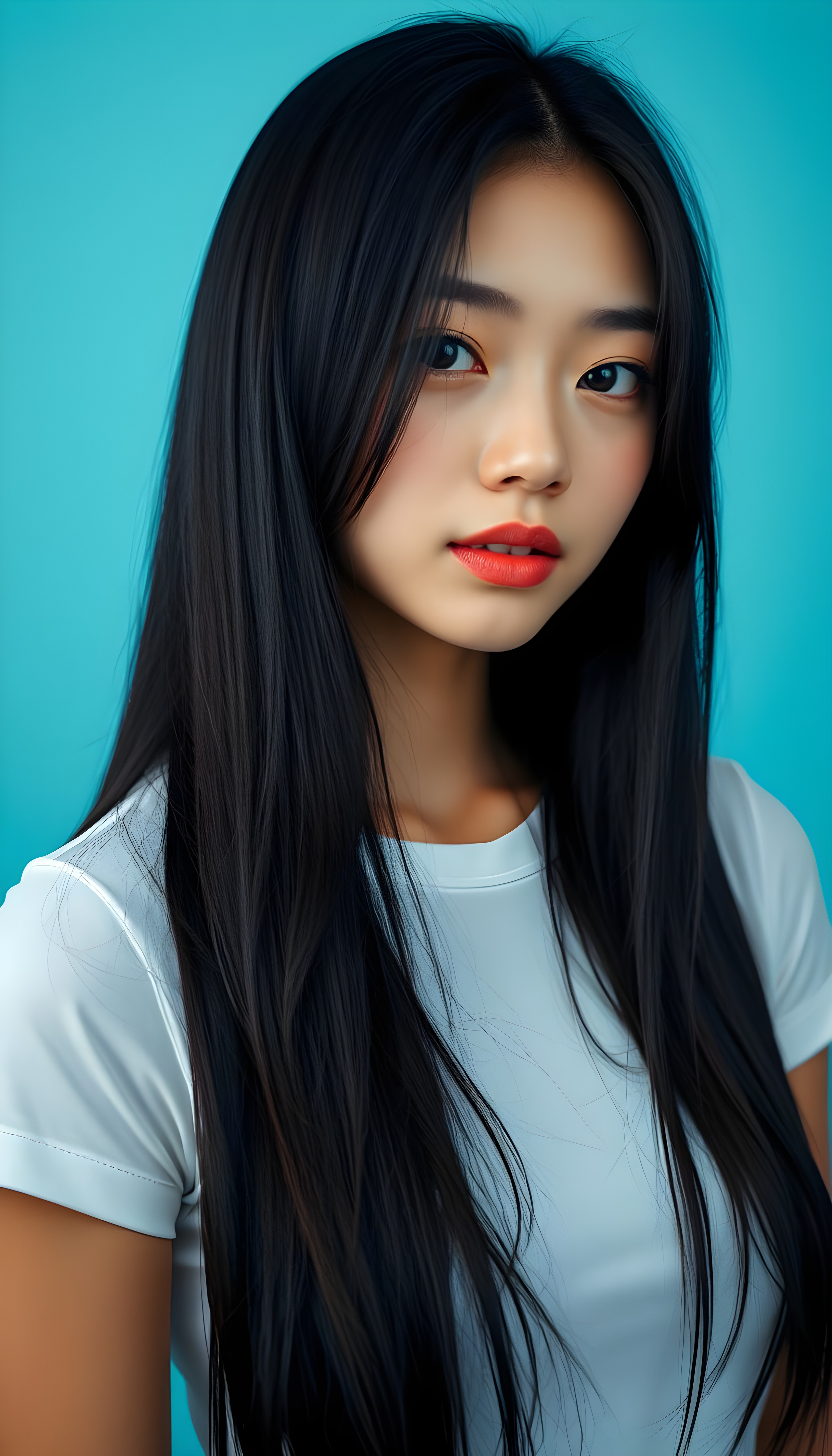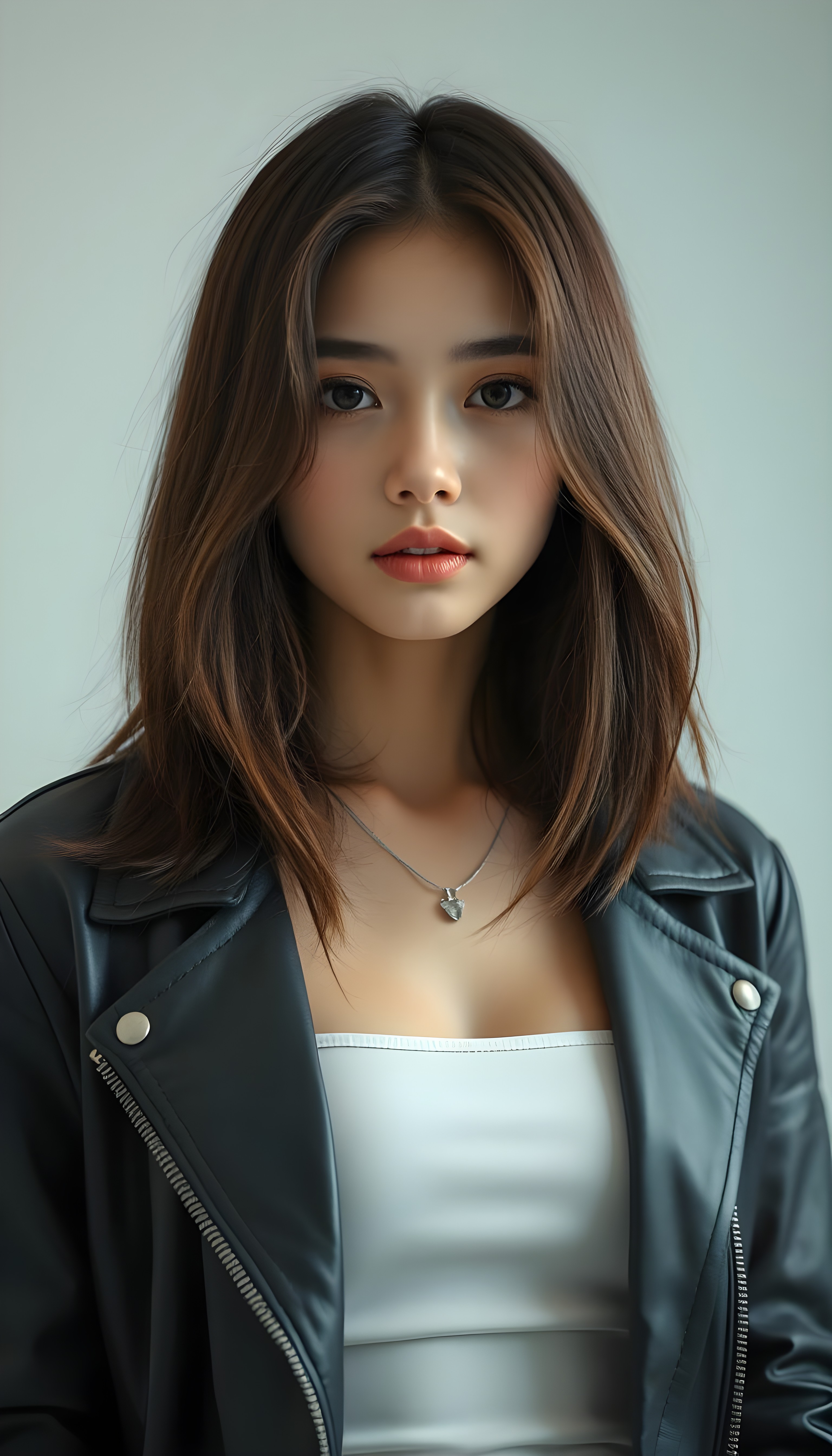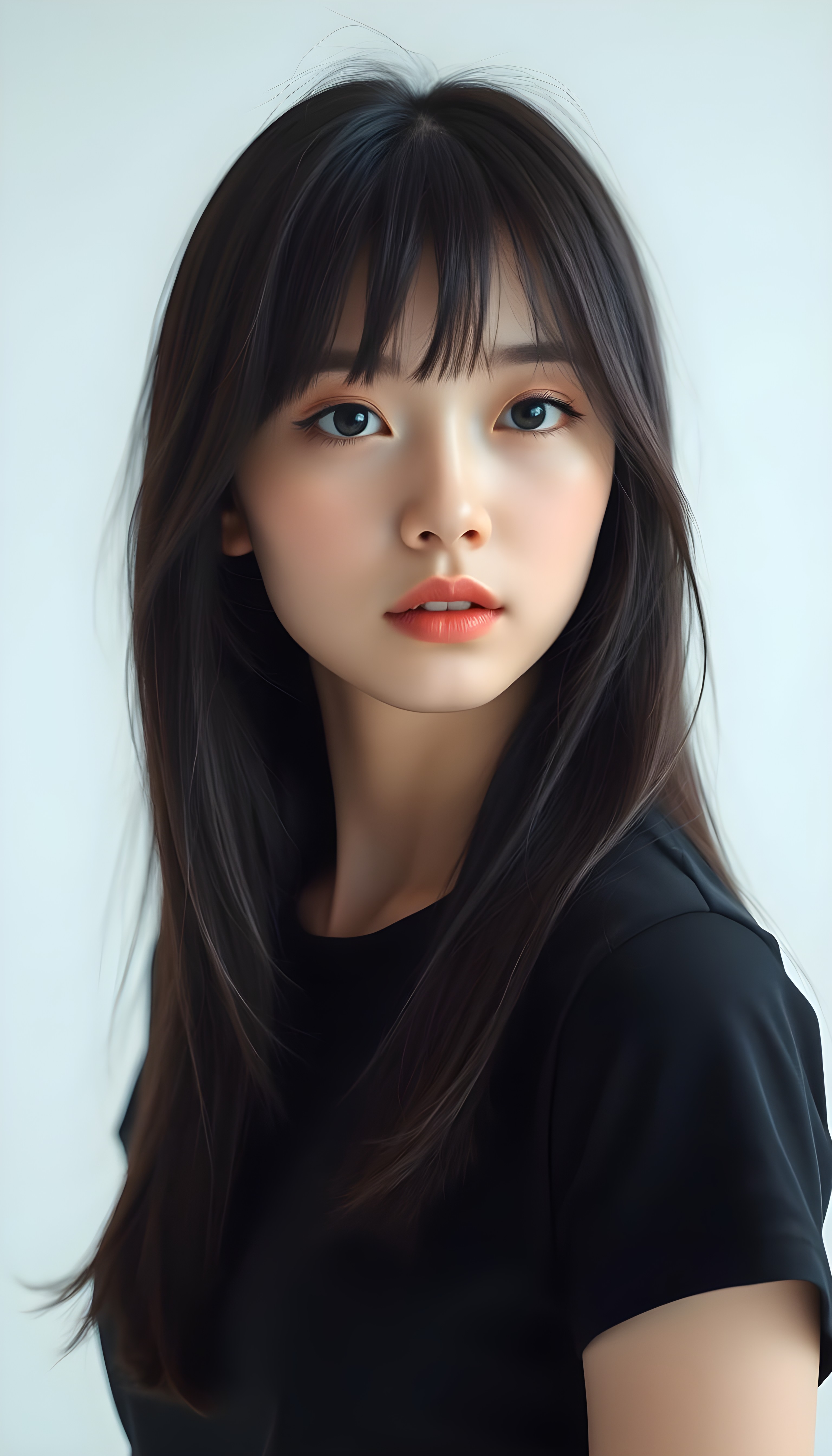 upper body portrait shot, a innocent teen girl with a round face, tousled, frizzy long copper hair, full lips and deep blue eyes, super realistic face, grey backdrop