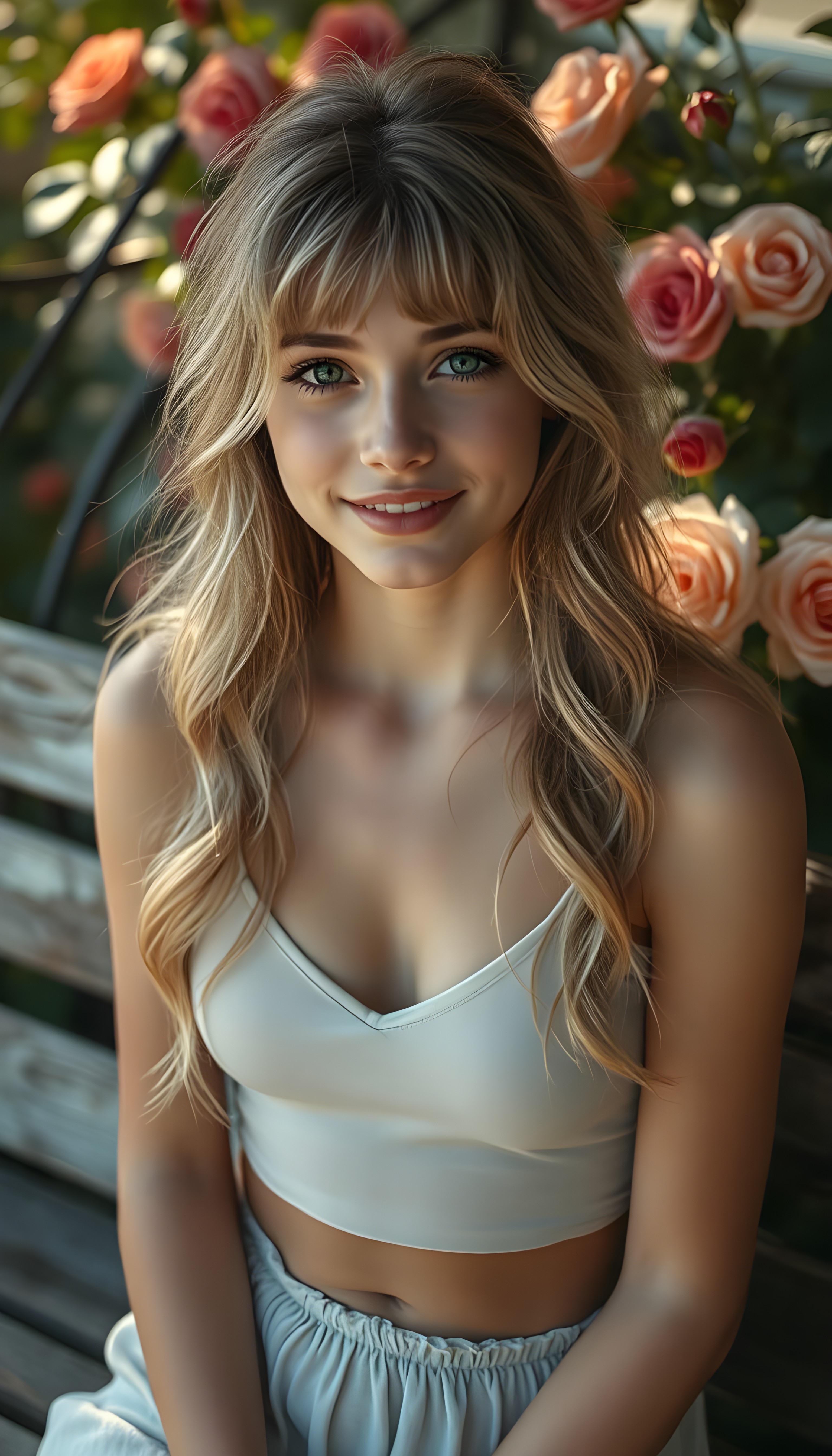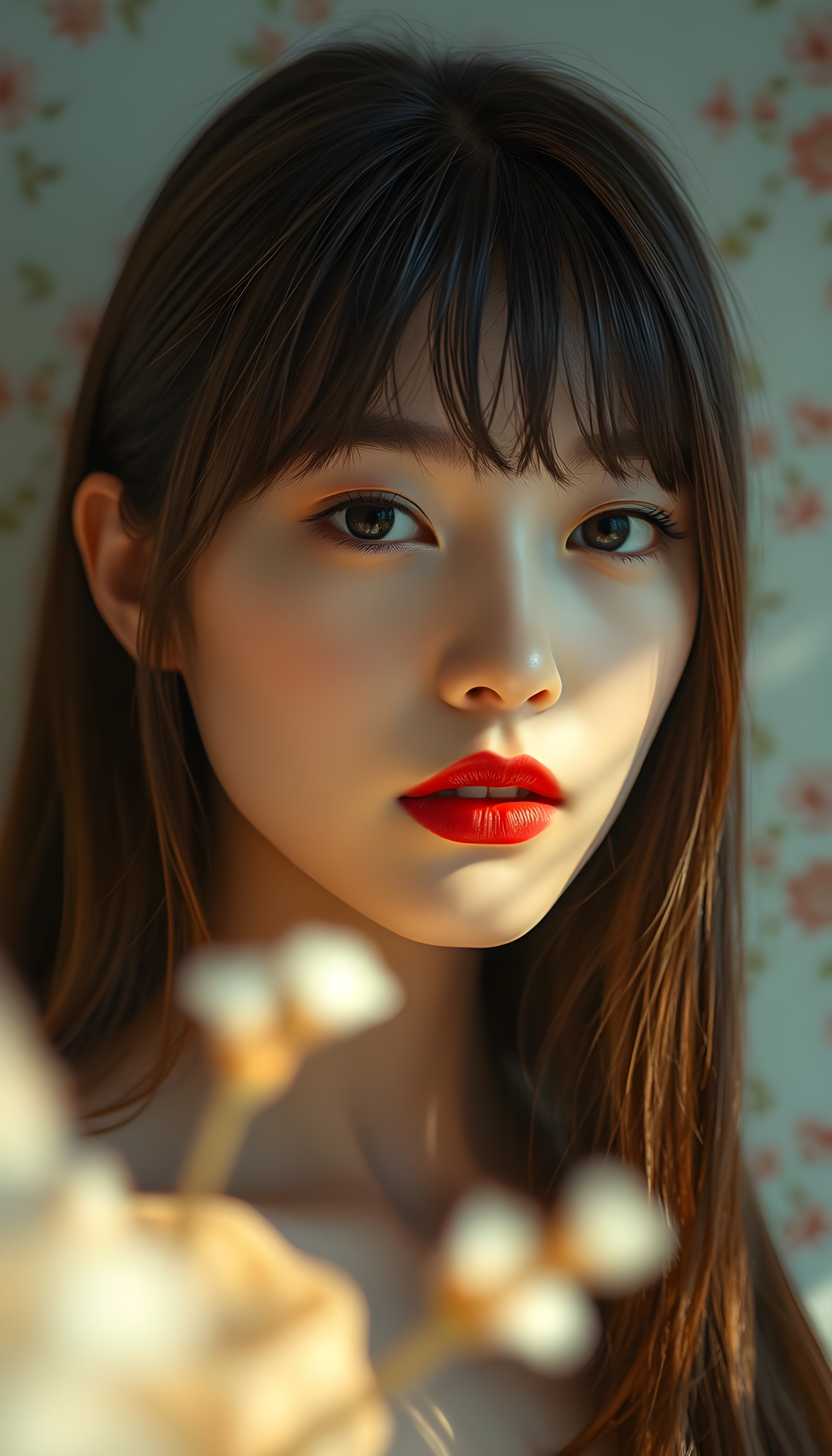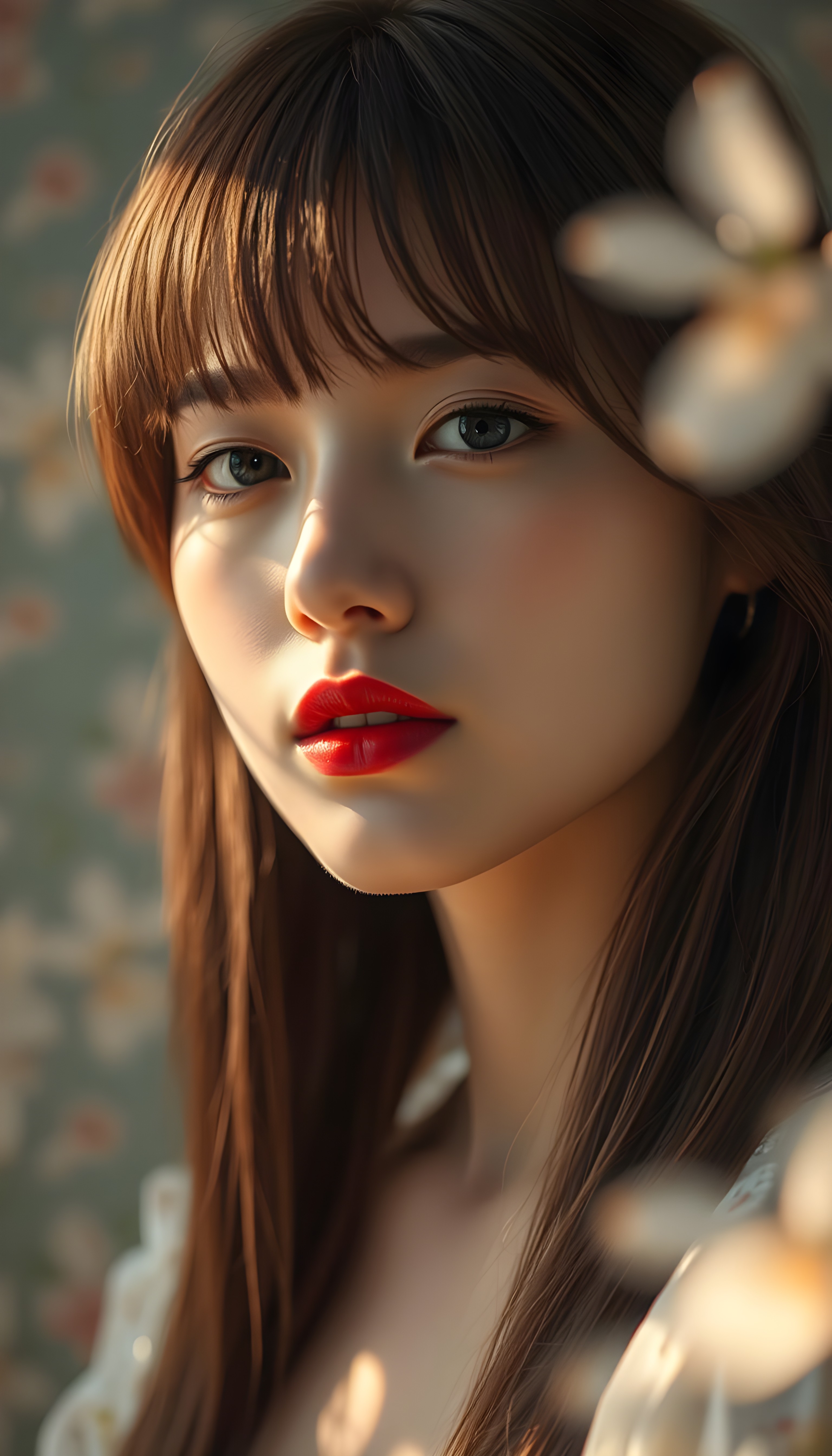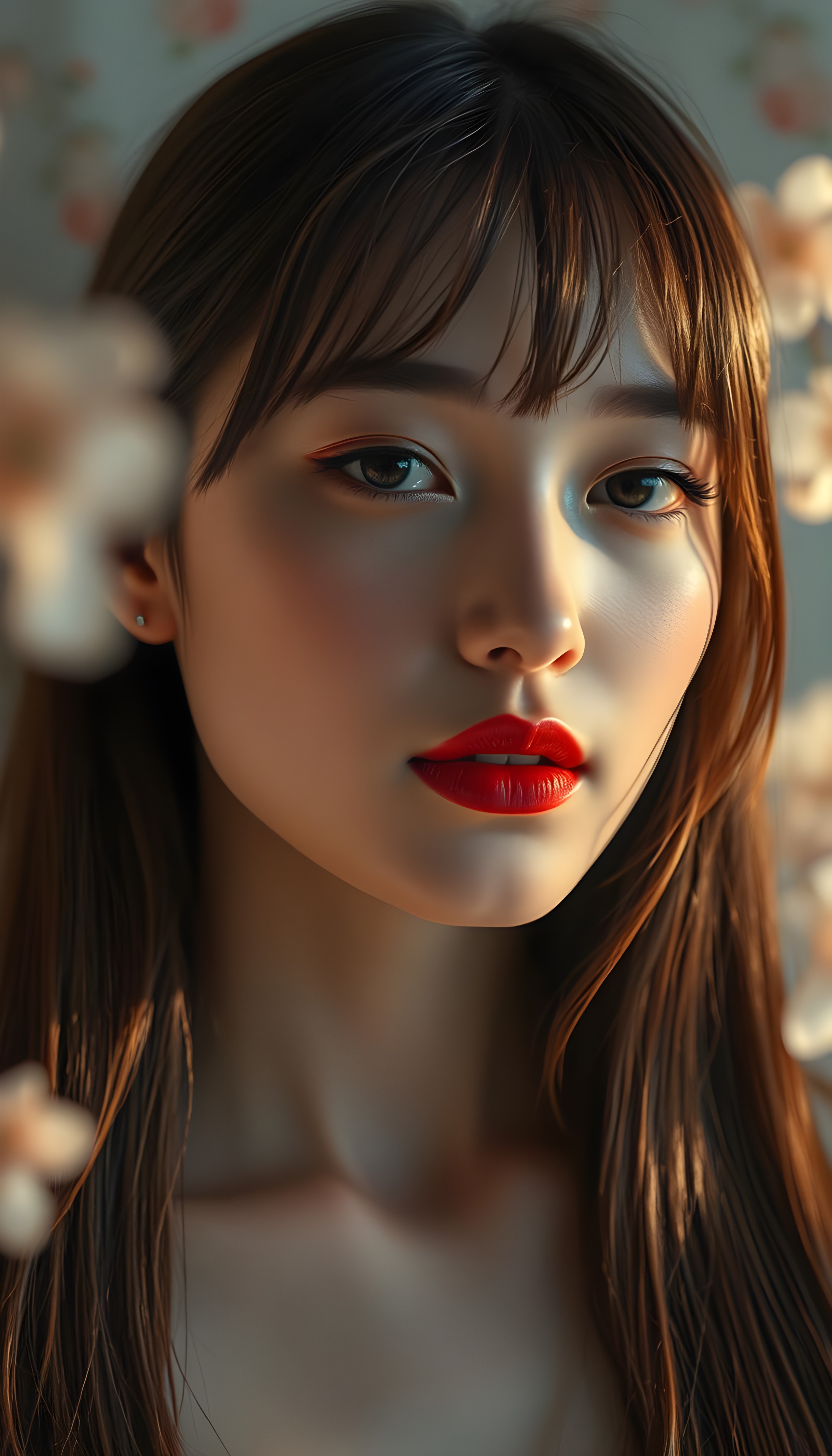 upper body portrait shot, a innocent teen girl with a round face, tousled, frizzy long copper hair, full lips and deep blue eyes, super realistic face, grey backdrop