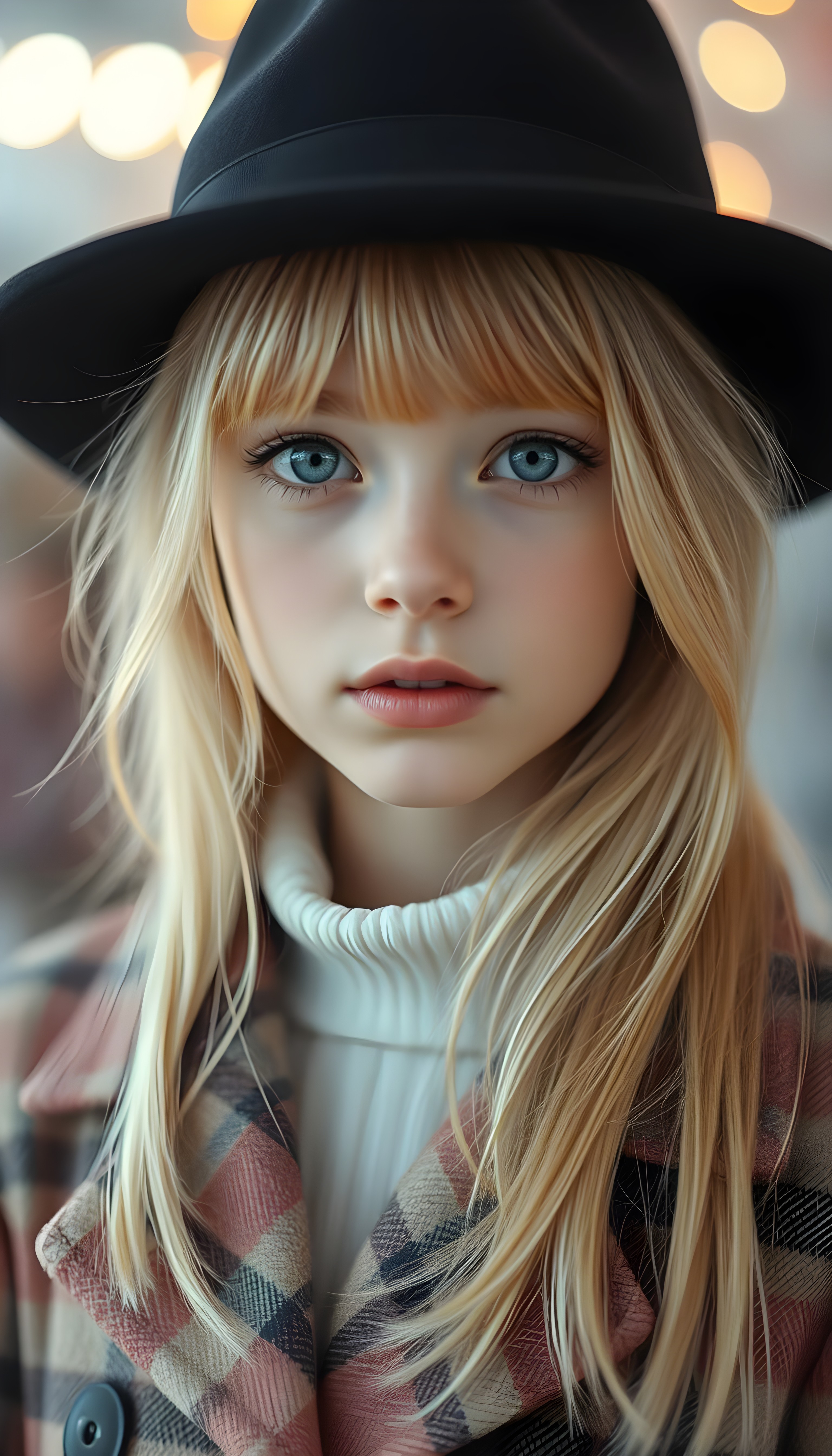 A detailed portrait of a girl with a youthful, radiant expression, looking directly at the viewer. She wears a stylish black hat and a vibrant checkered coat, contrasting with her soft, straight soft blonde hair. Her eyes are a captivating light blue, framed by delicate eyelashes, and her full lips are subtly pink. The image is rendered in soft, pastel colors, with a gentle glow enhancing her features. The background is a dreamy blend of pastel hues, creating a serene and enchanting atmosphere.