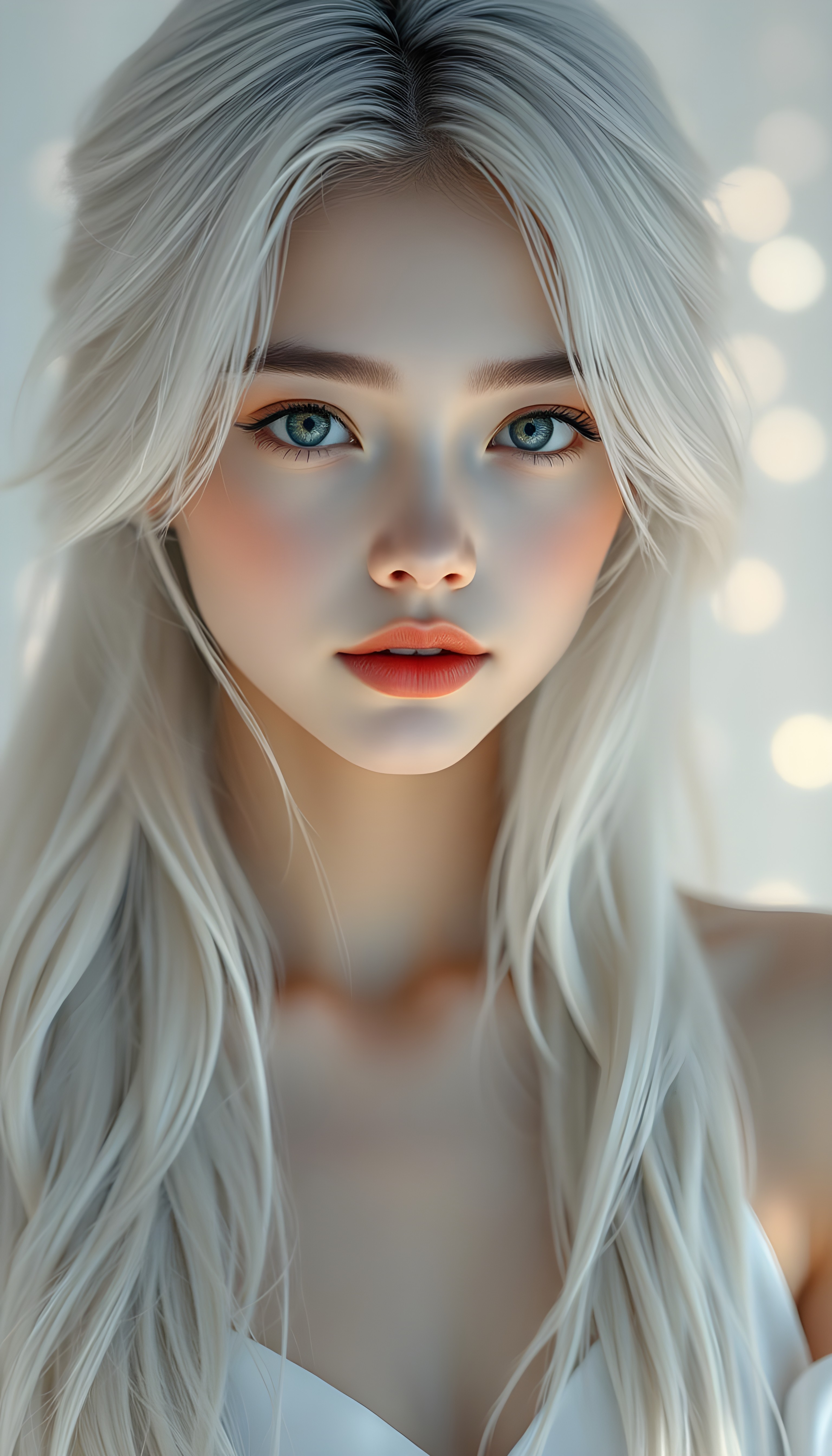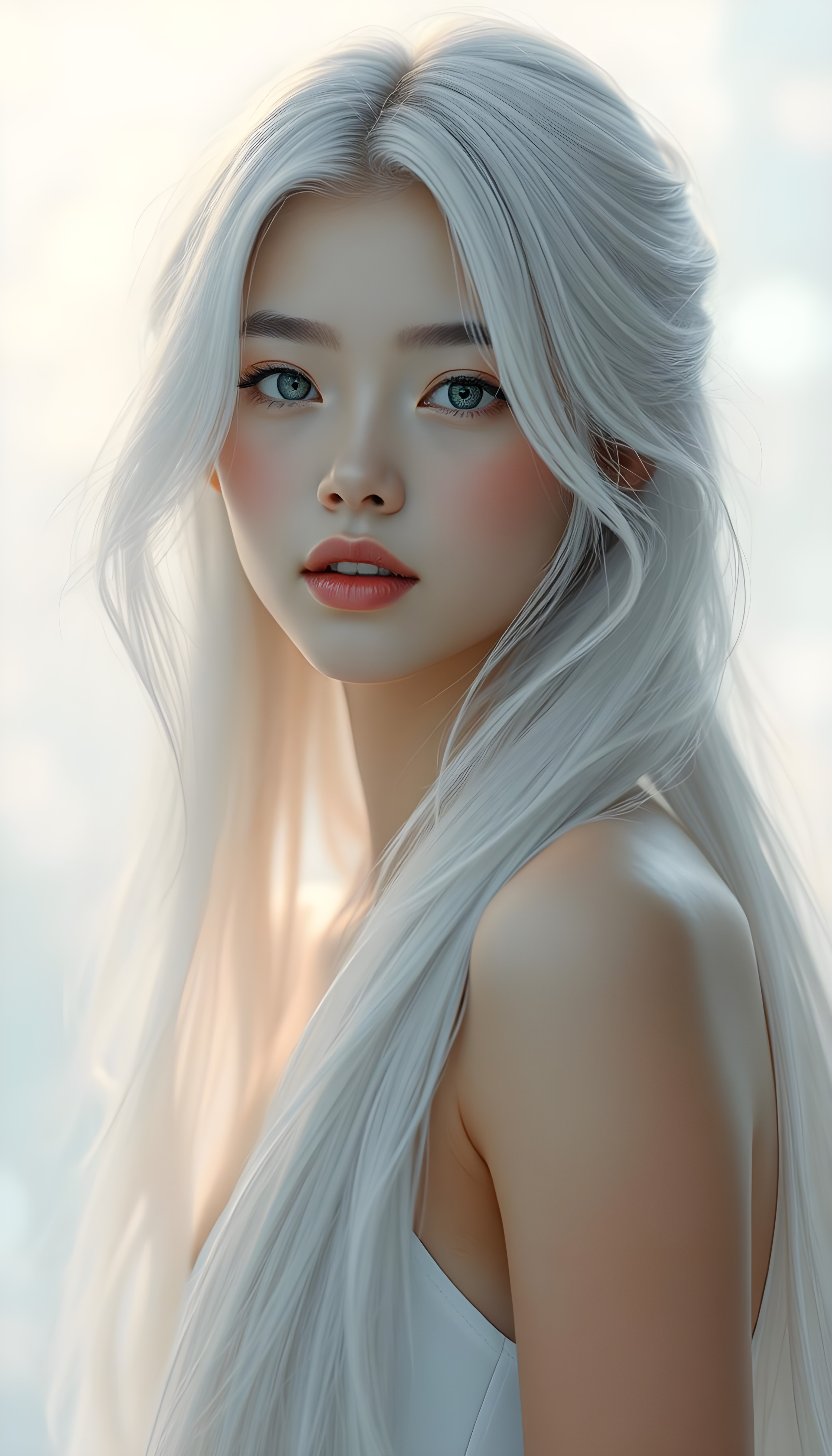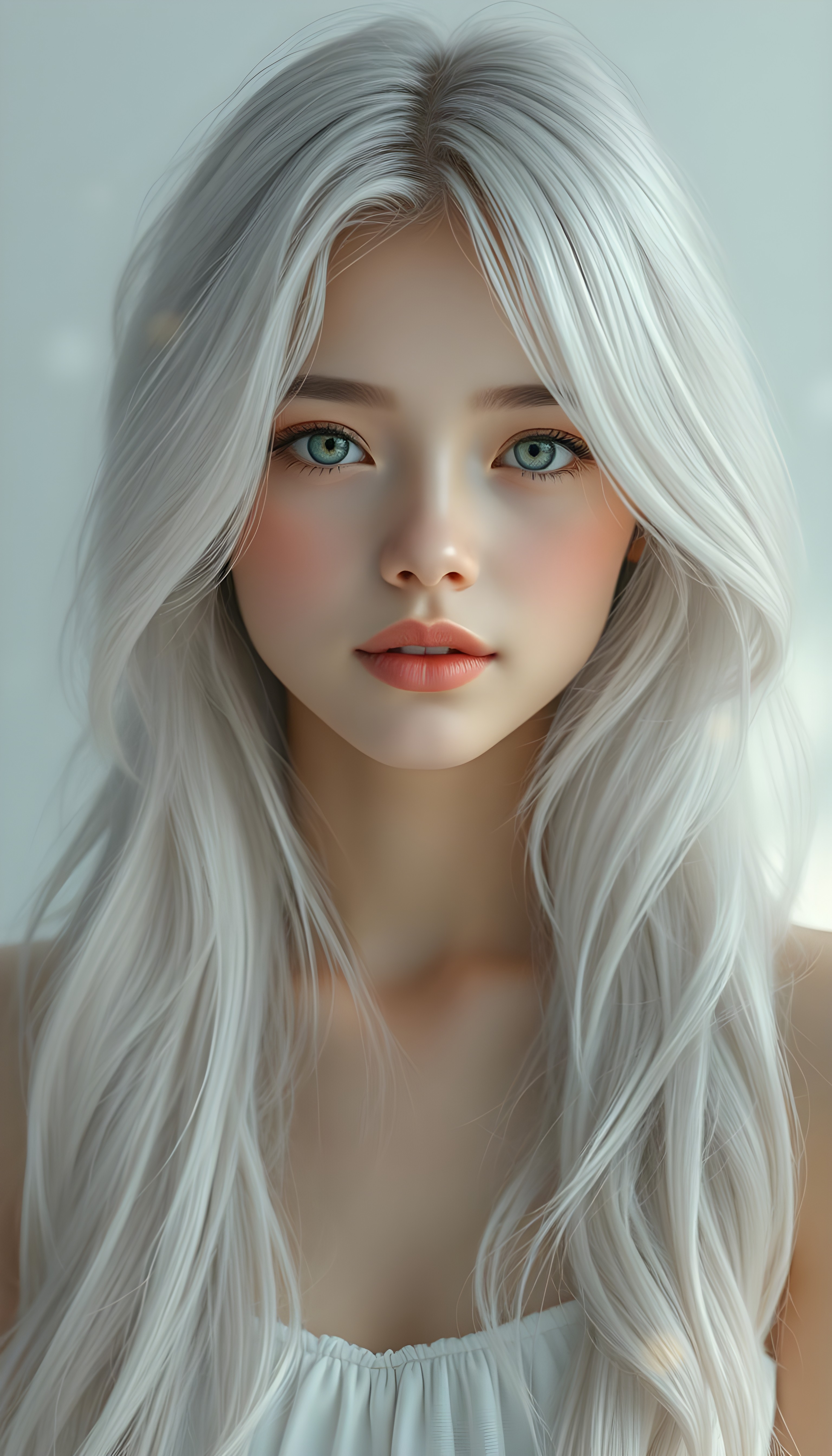 A stunning, high-resolution digital painting of a beautiful young girl with flawless, soft silver skin and long, perfect jet white hair that cascades down her back. Her eyes are large and sparkling, framed by delicate lashes, and her lips are full and pink. She gazes directly into the camera with a warm, inviting smile. The background is a soft gradient of white and pastel colors, creating a dreamy, ethereal atmosphere. The lighting is soft and diffused, highlighting her features and giving her skin a luminous glow. She is dressed in a simple, elegant white dress that complements her ethereal beauty. The composition is balanced, with her face centered and her hair artfully arranged to add depth and texture to the image. The overall style is a blend of realism and fantasy, making her appear both realistic and otherworldly.