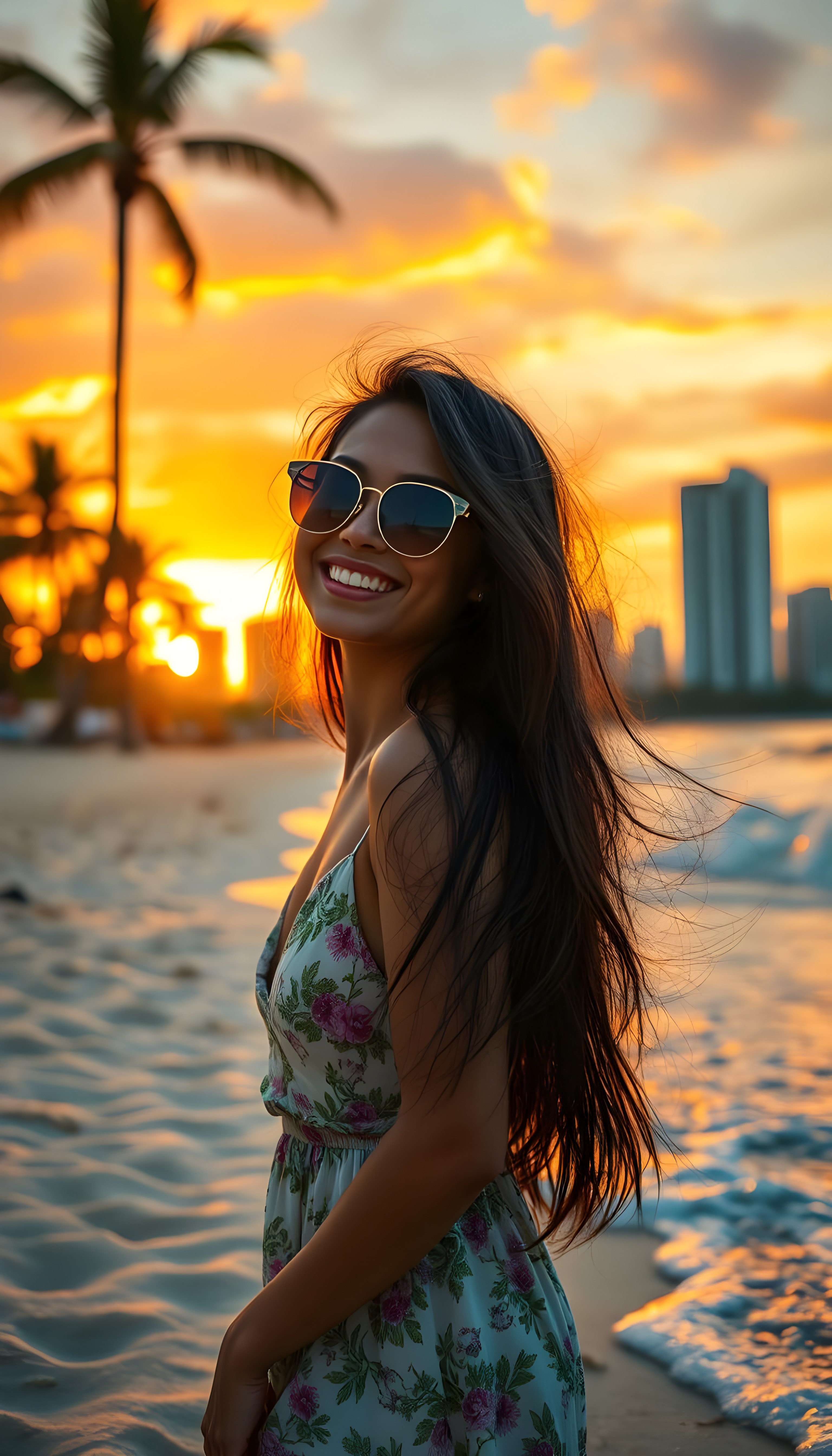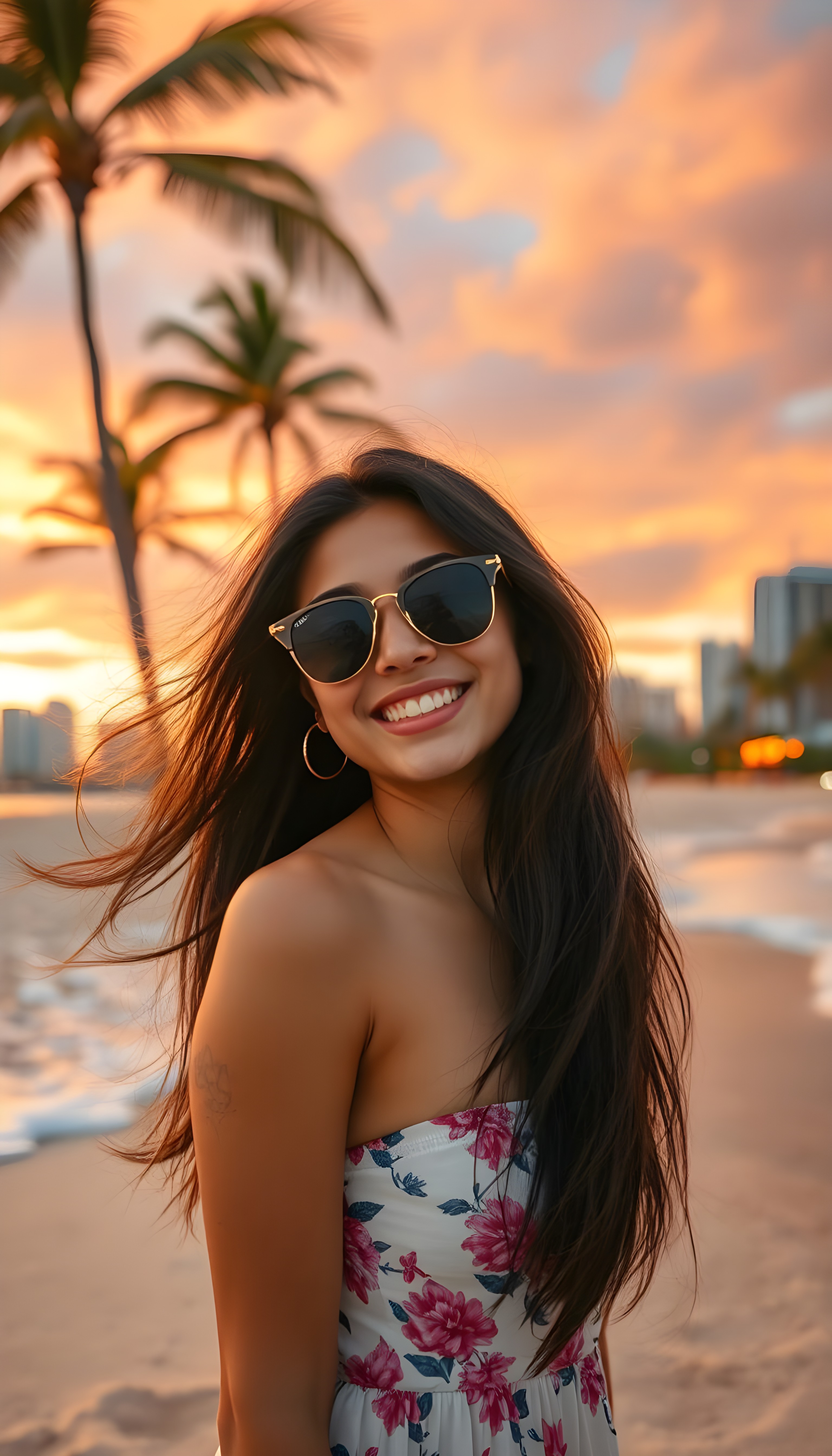 A vibrant scene at a tropical beach, featuring a young Latina girl with flowing dark hair and a radiant smile. She wears a floral sundress and sunglasses, posing playfully. The backdrop includes palm trees, a colorful sunset, and a distant city skyline with modern skyscrapers. The sand sparkles under the warm golden light, with waves gently crashing nearby. The sky is painted in hues of orange, pink, and purple, creating a serene and joyful atmosphere.