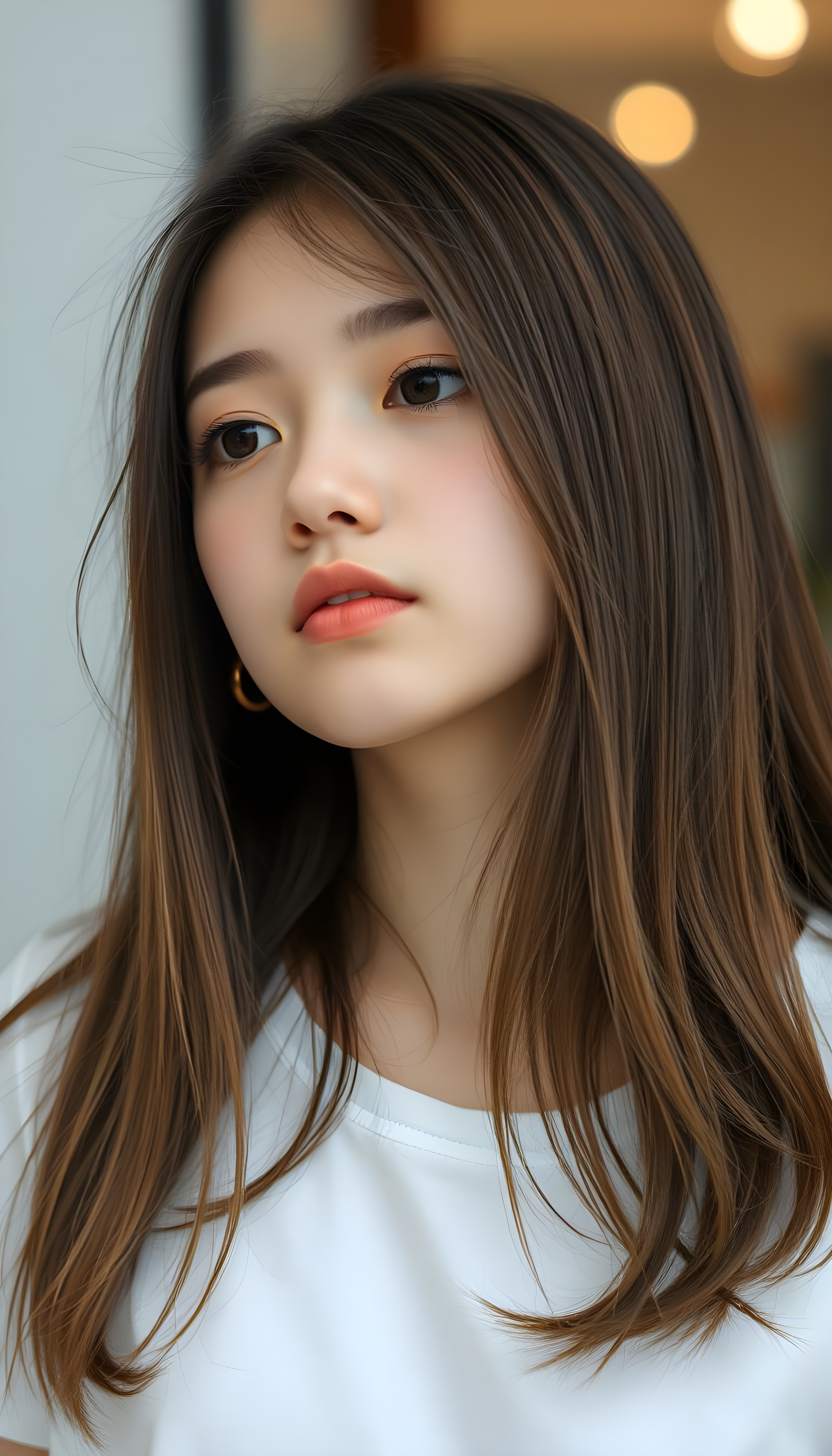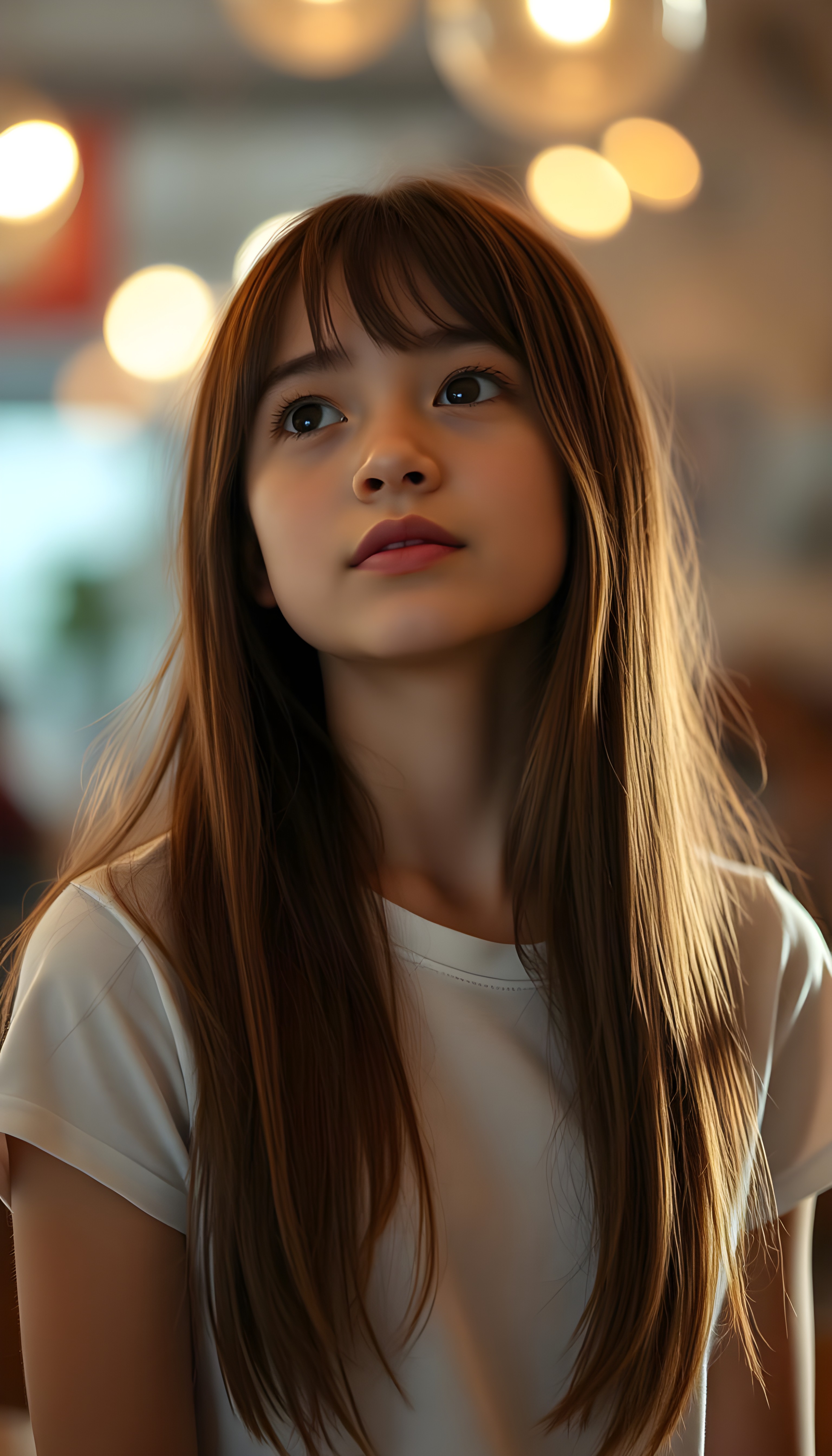 A young girl with long, straight hazelnut brown hair. She is waiting for a kiss. Cute. White t-shirt.