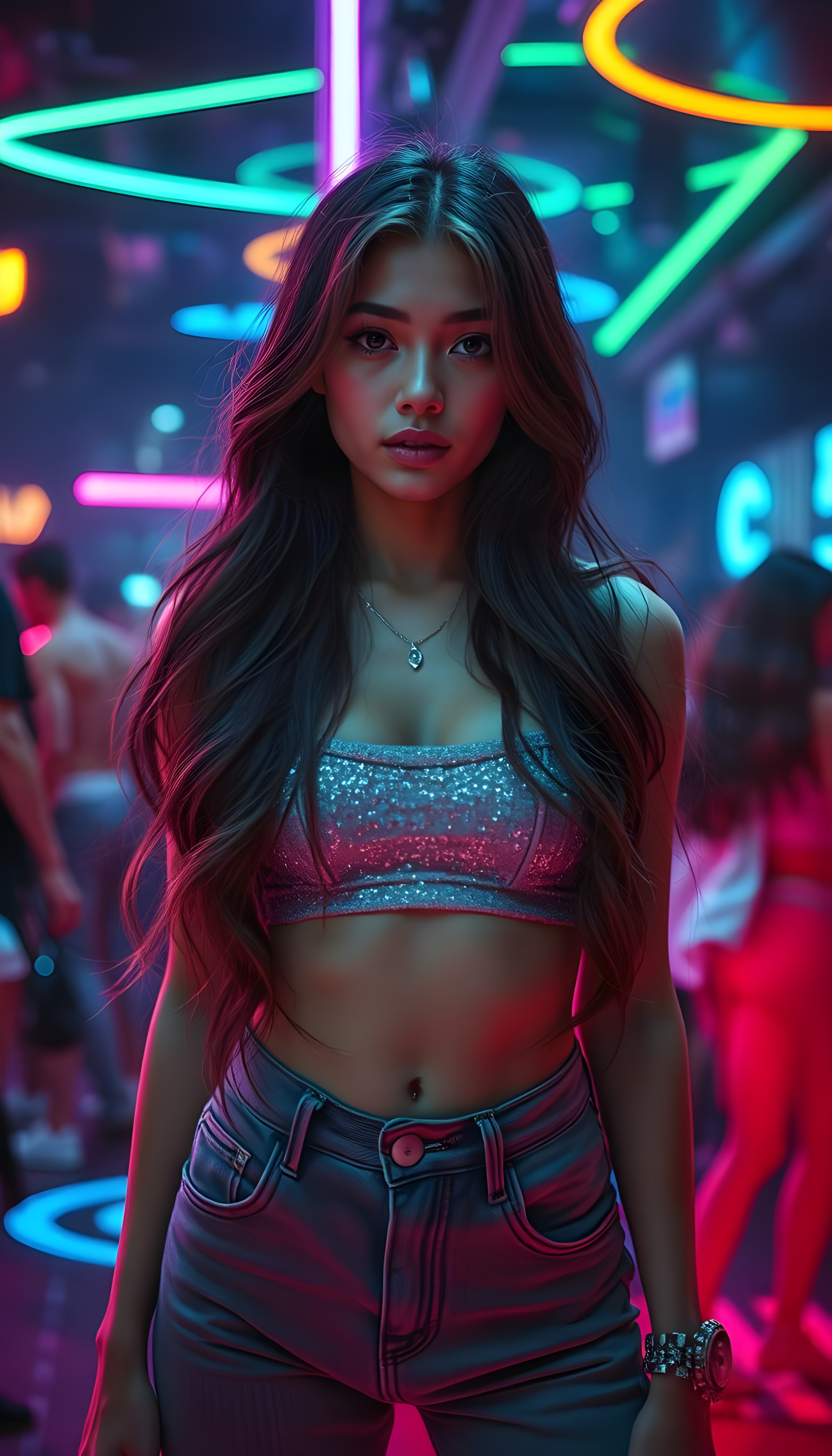 In a neon-lit, futuristic club, a young girl with long, flowing silky hair cascades down her shoulders, her face a perfect oval, framed by soft waves. She wears a shimmering crop top and high-waisted denim jeans, her midriff adorned with a delicate, glowing accessory. Her pose exudes confidence and elegance, her eyes sparkling with allure. The club’s vibrant atmosphere reflects off her flawless skin, with holographic lights casting dynamic patterns around her, while other patrons dance in the background.