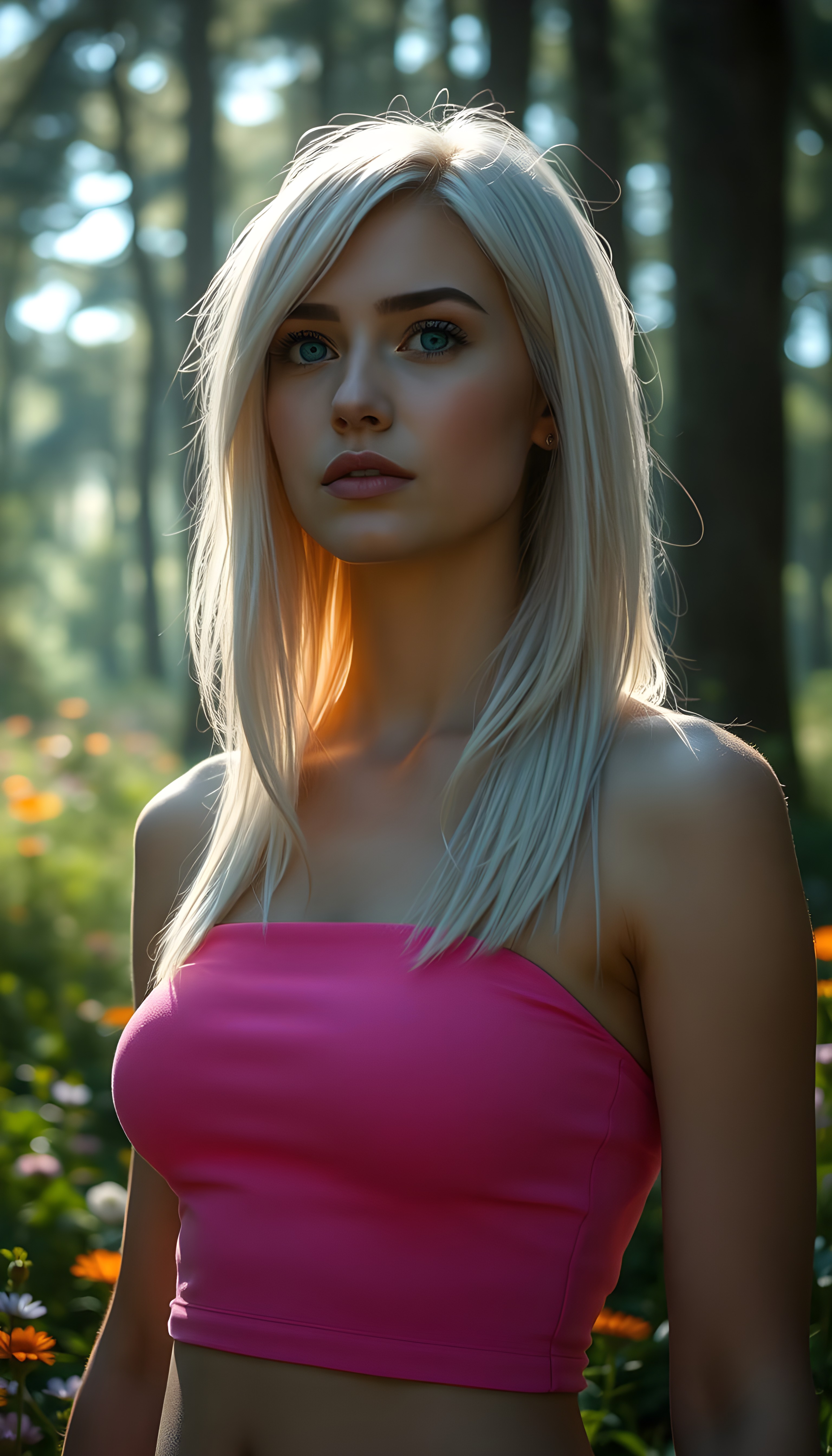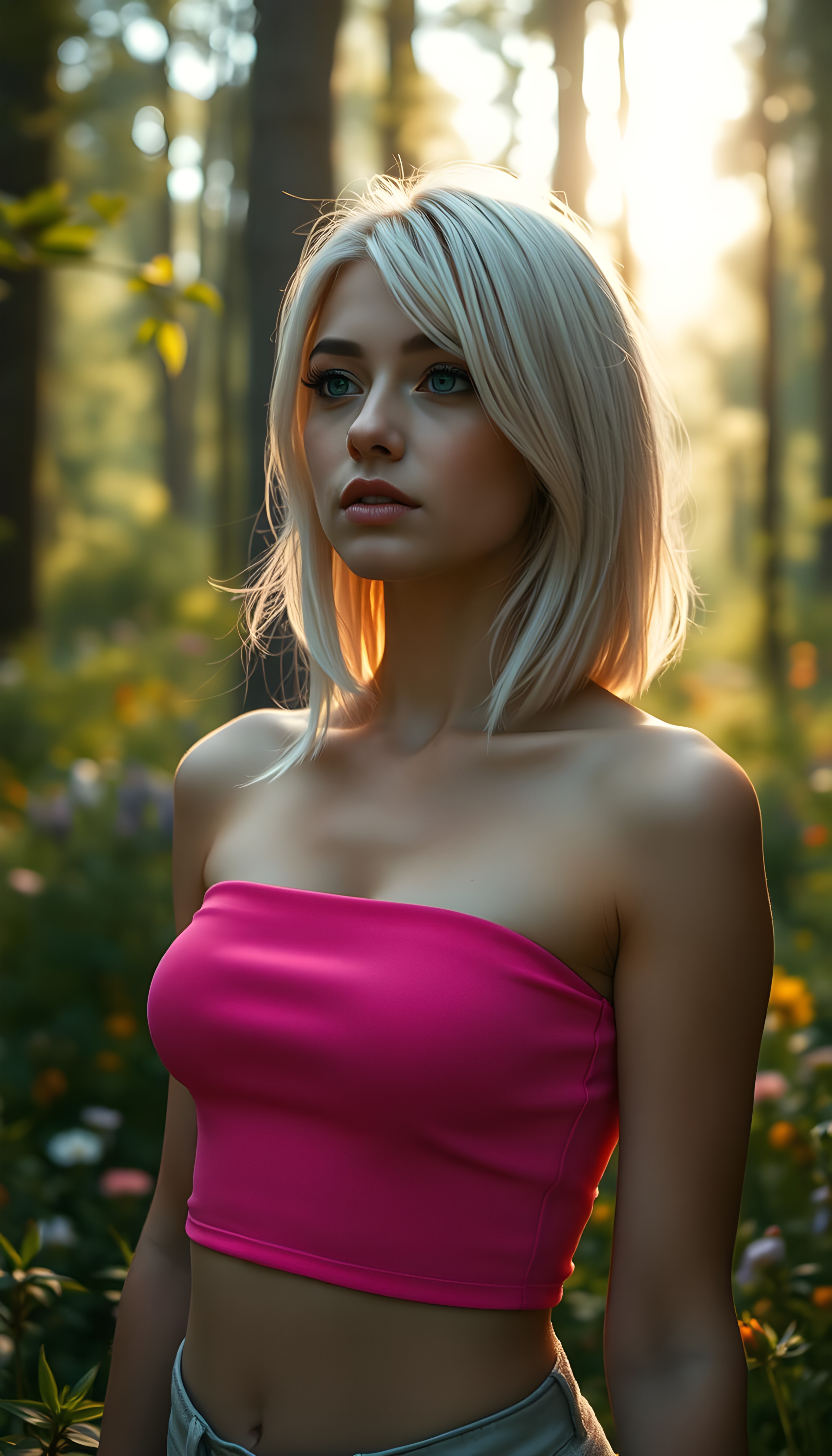 In a sunlit forest, a young woman with ethereal long white hair and golden highlights, styled in a sleek bob cut, stands with her deep blue eyes shimmering in the soft light. She wears a vibrant pink crop top that elegantly accentuates her graceful figure, her full lips slightly parted as she gazes into the distance. The forest is alive with lush greenery, tall trees, and colorful wildflowers, creating a dreamy and enchanting atmosphere that wraps around her like a protective embrace. The background features a subtle pink gradient, enhancing the magical and serene ambiance of the scene.