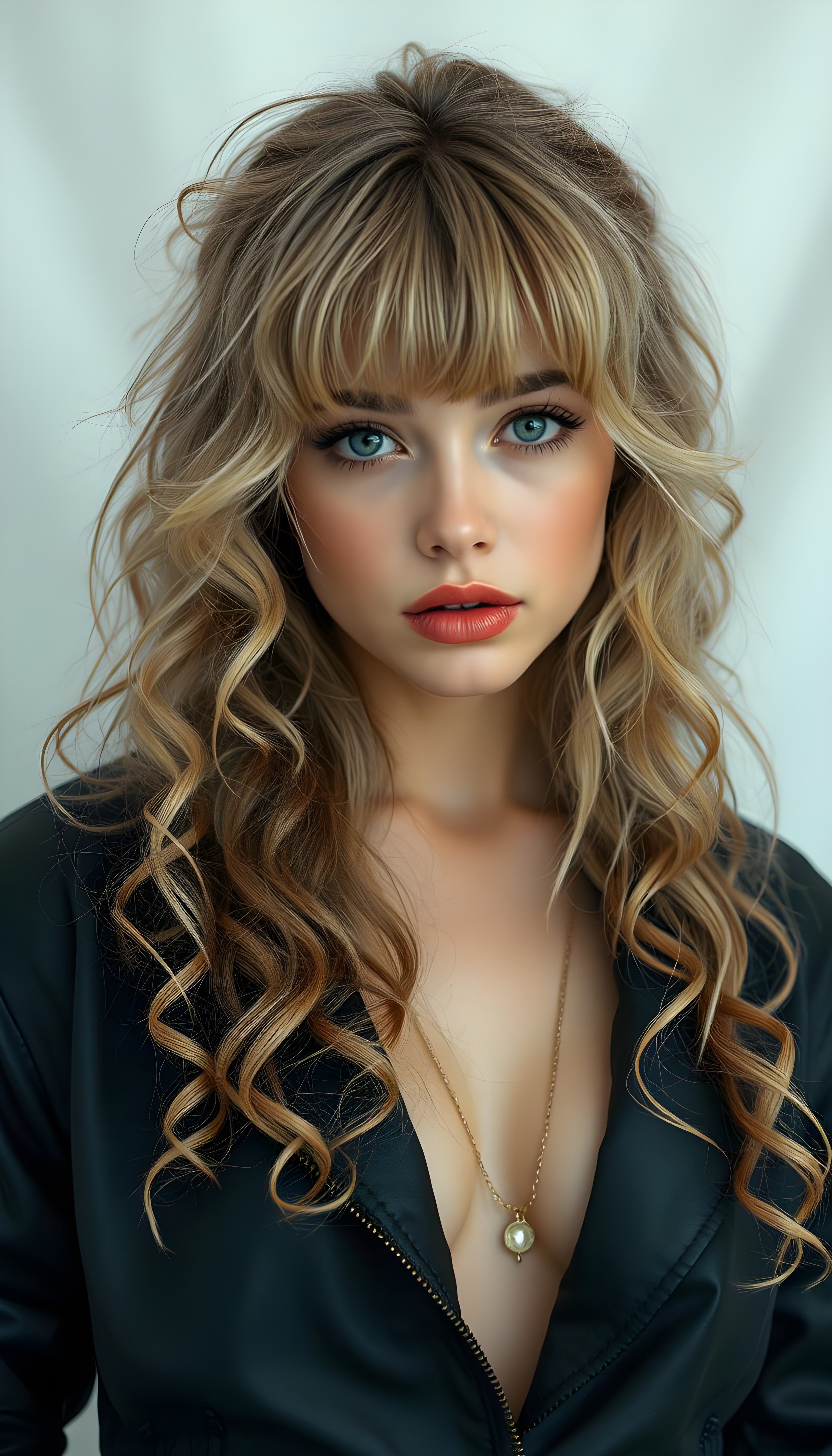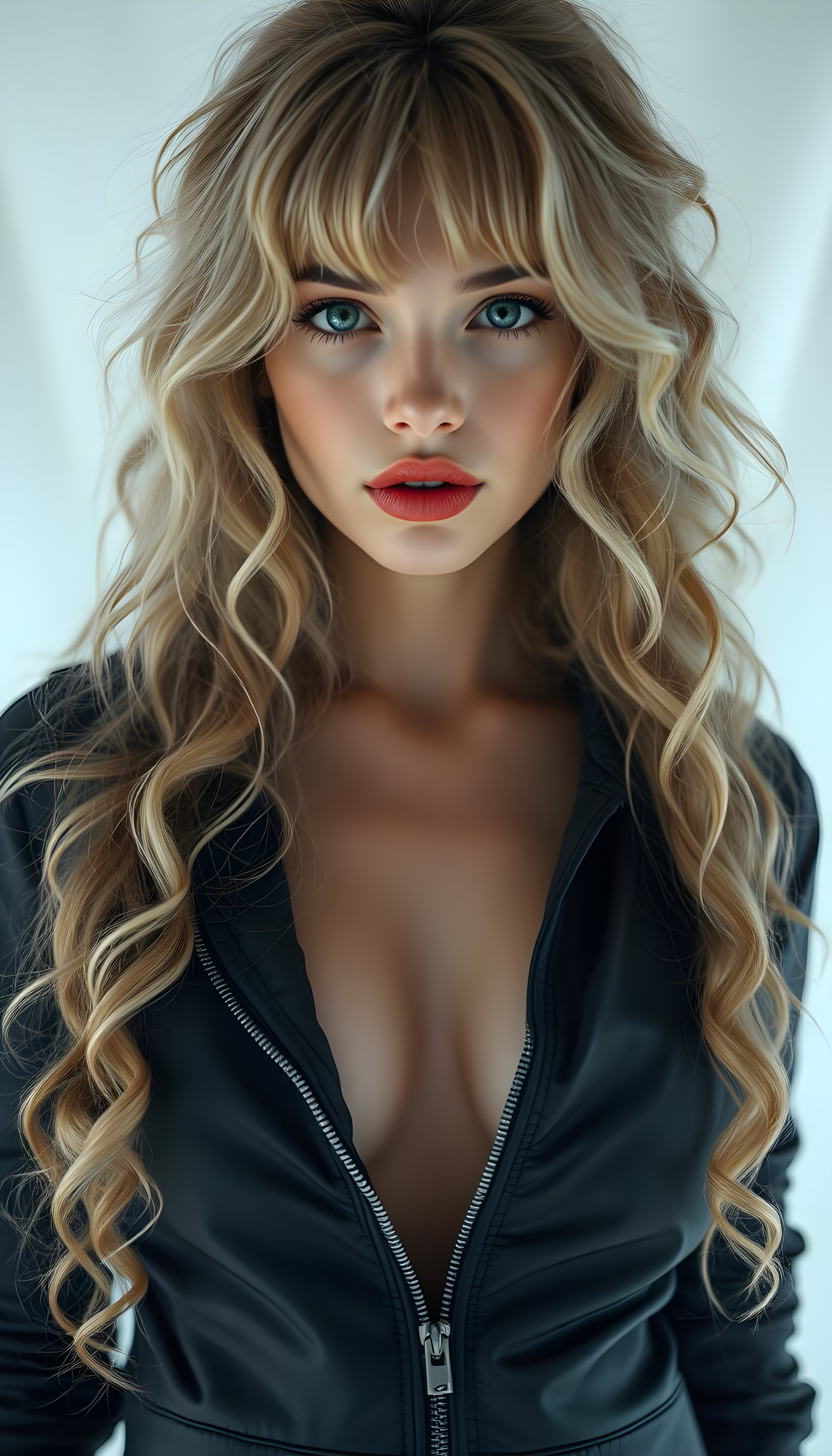detailed and realistic photo from a young cute busty babe with long blond curly soft hair, with bangs, ((open black aviator jacket)), hazy white backdrop, ((beautiful colors)), red full plump lips.