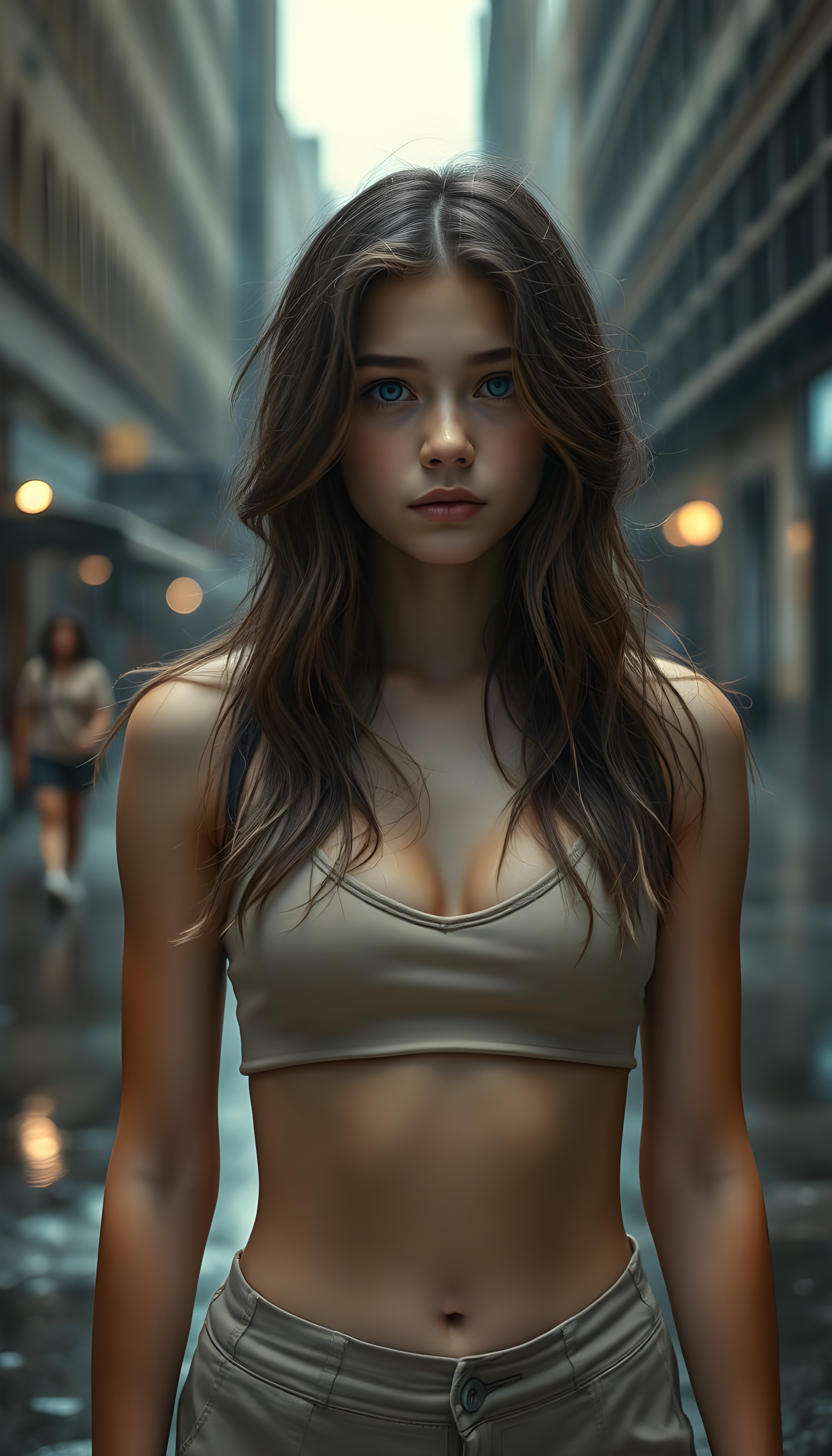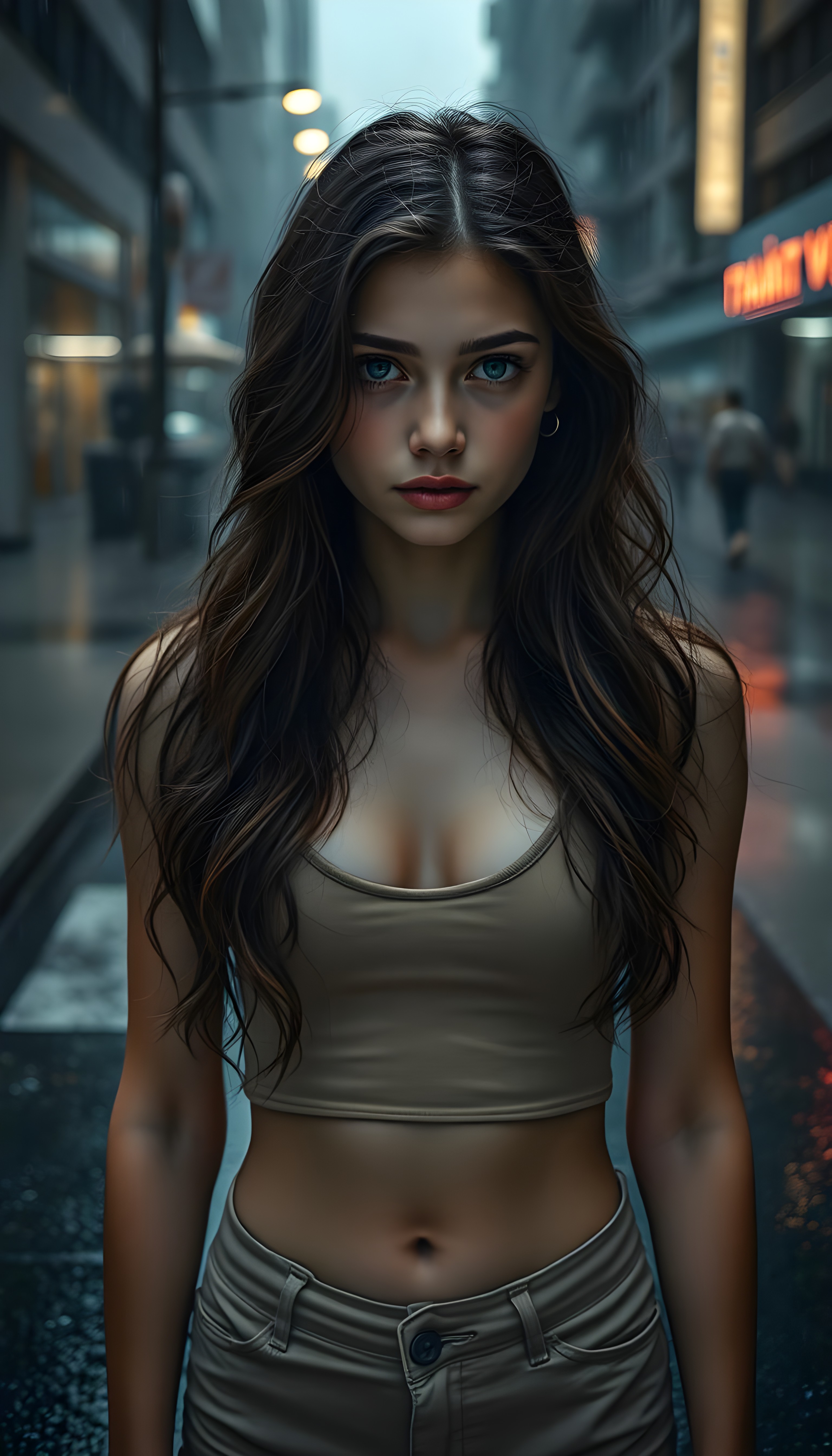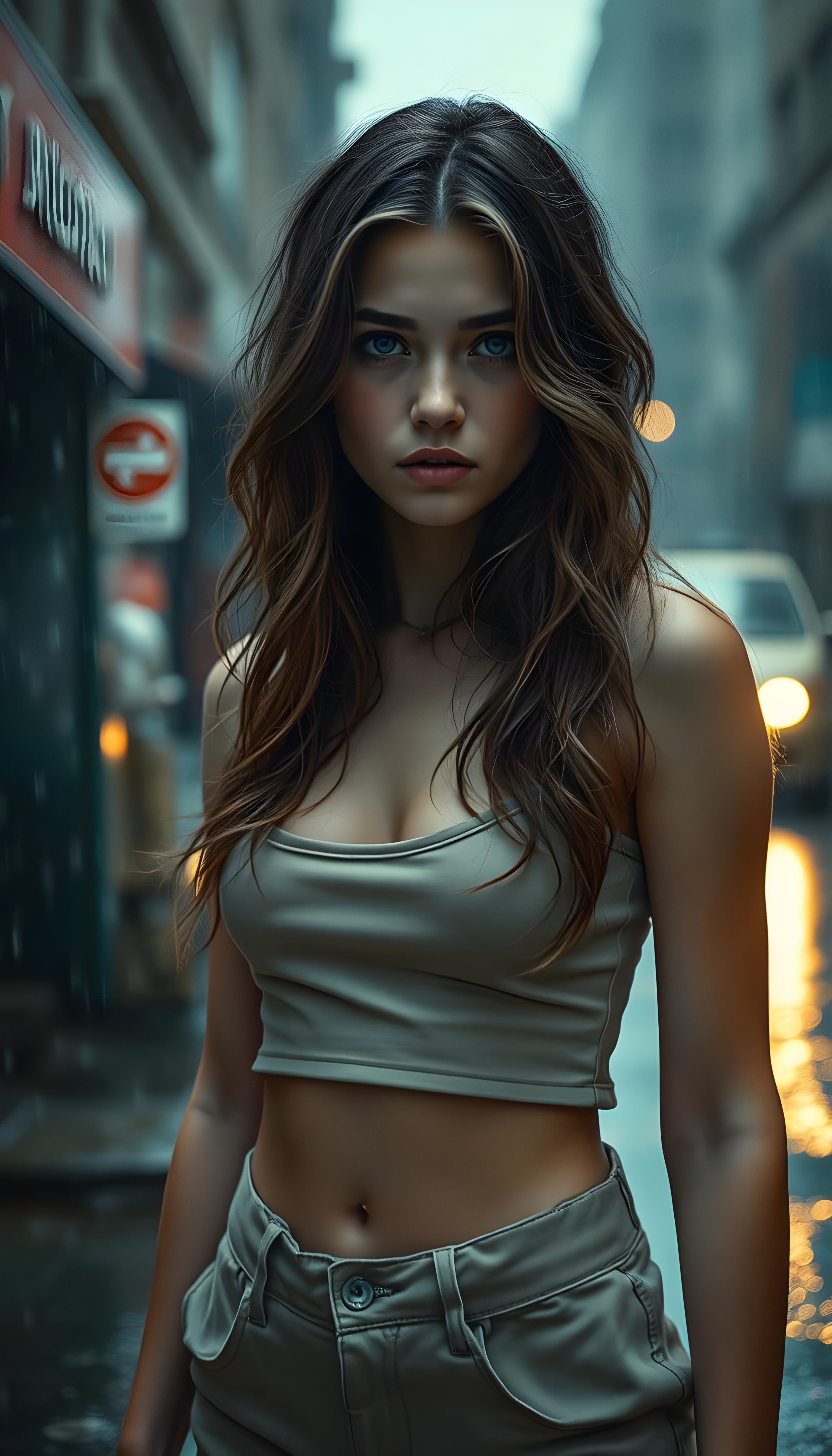A realistic portrayal of a teenage girl with long, wavy brown hair adorned with subtle highlights, silver skin, and a deep, dusty blue gaze. She wears a beige short-sleeve crop tank top with a plunging neckline and beige shorts, revealing her midriff. Her expression is somber, gazing up at the viewer. She stands amidst a heavy rainstorm on a city street, with raindrops glistening on her face and clothes, creating a moody, cinematic atmosphere with dramatic lighting and reflections on the wet pavement.