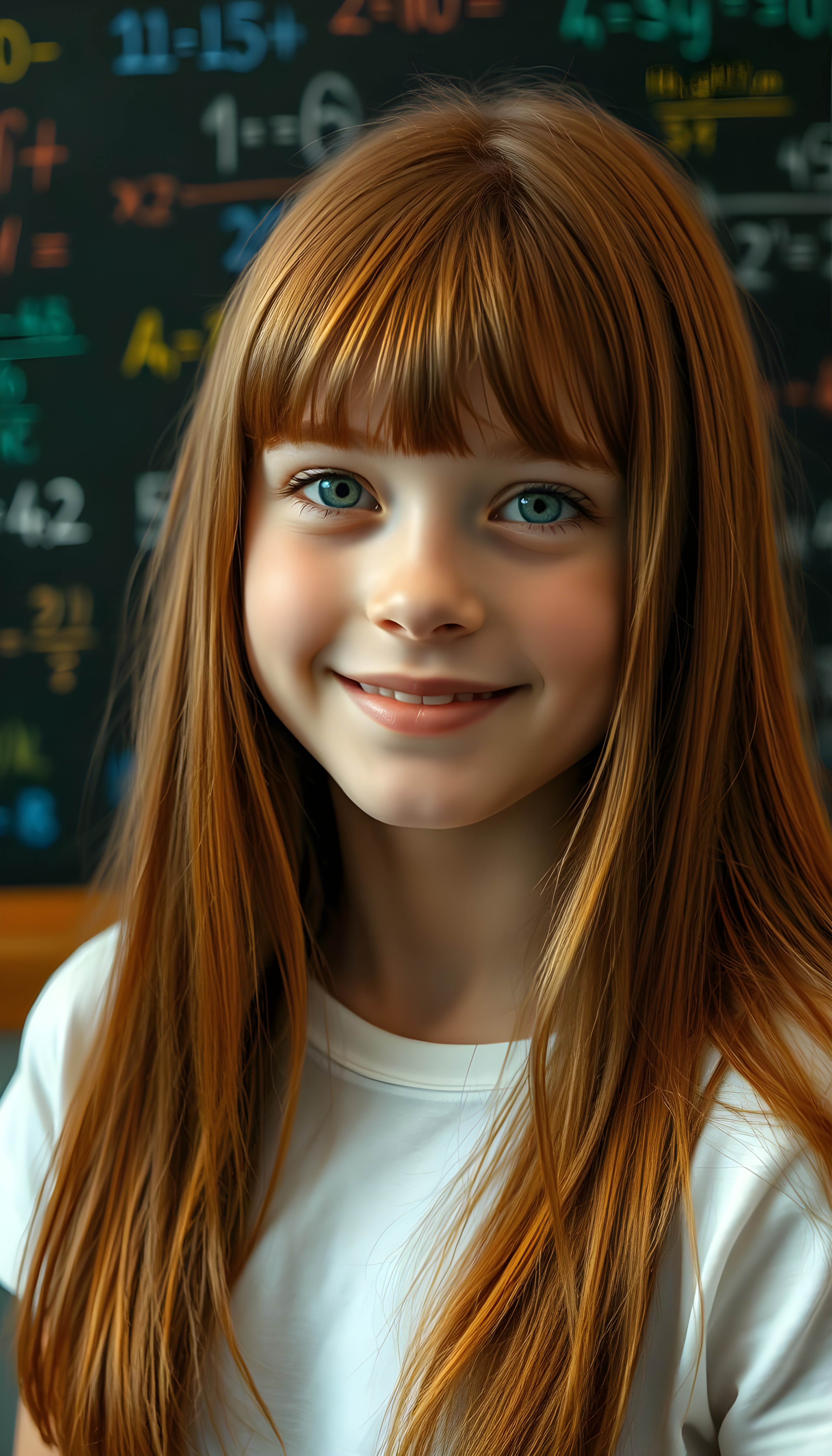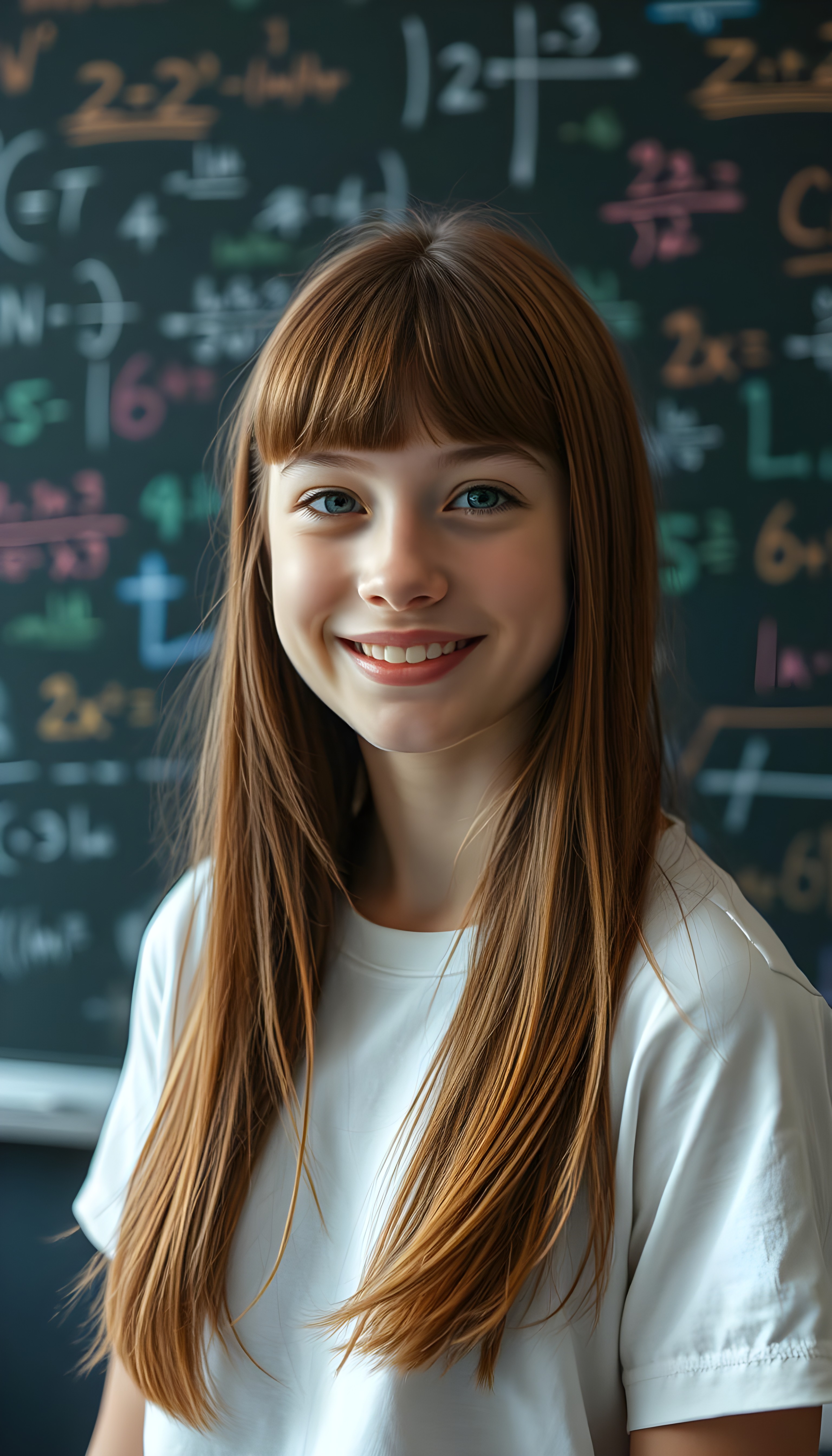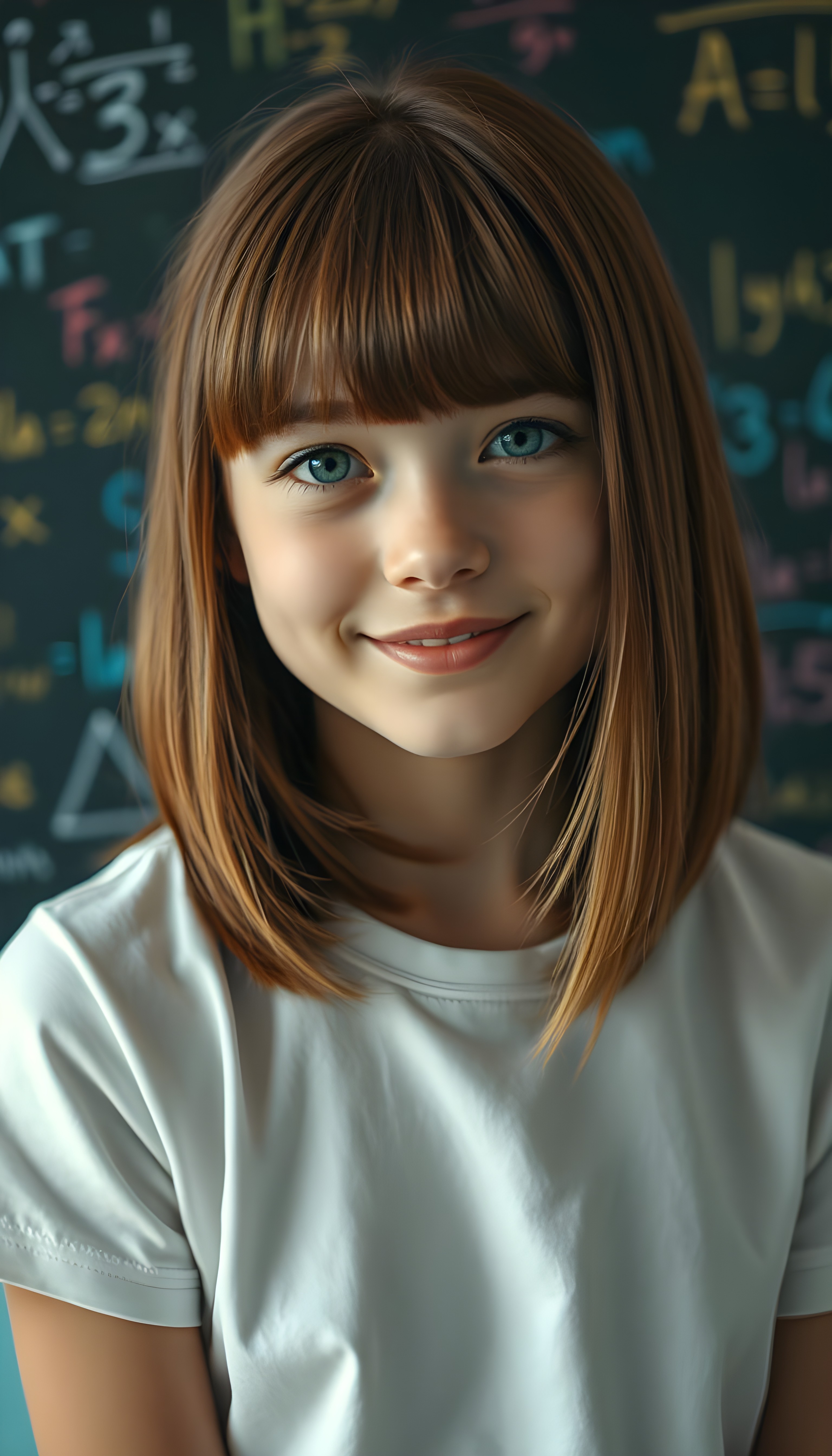 A stunning, hyper-realistic portrait of a young schoolgirl with vibrant, straight chestnut hair cascading over her shoulders in a bob cut. Her radiant, deep blue eyes sparkle with curiosity, framed by delicate bangs. Her flawless, luminous skin glows under soft, diffused lighting. She smiles warmly, wearing a simple white t-shirt that contrasts beautifully with her hair. In the background, a blackboard adorned with colorful, intricate mathematics formulas creates a dynamic, academic atmosphere. The composition combines elegance and intelligence, with a touch of whimsy and sophistication, making her appear both approachable and inspiring.