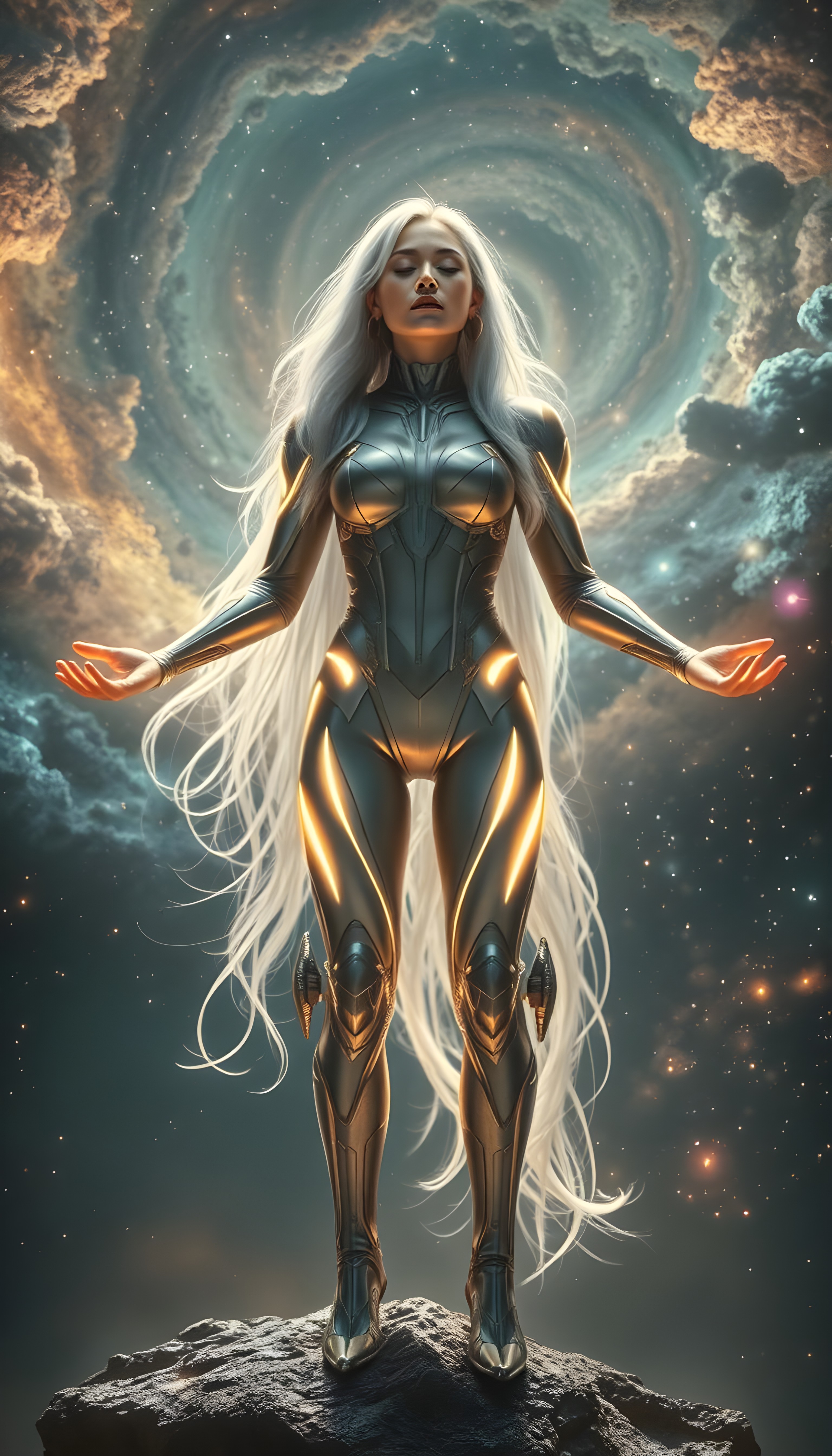 A ((superheroine)) with ((long, flowing silver hair)) that resembles a ((celestial dragon)) cascading down her back. She is wearing a ((customized, high-tech suit)) with glowing ((silver armor panels)) that shimmer under the light. Her face is lit by a ((serene, otherworldly glow)) with her eyes closed, as if ((meditating)) or ((channeling cosmic energy)). She is ((standing on a floating rock)) in the ((center of a swirling galaxy)), with ((starry nebulae)) and ((colored nebulae)) in the background, creating a ((mesmerizing and mystical atmosphere)). Her ((arms are stretched out)) in a ((powerful stance)) with her hands emitting a ((soft, radiant light)), casting a ((golden aura)) across her body. The ((entire scene)) is ((illuminated by a celestial light)), giving it a ((futuristic and fantastical)) look.