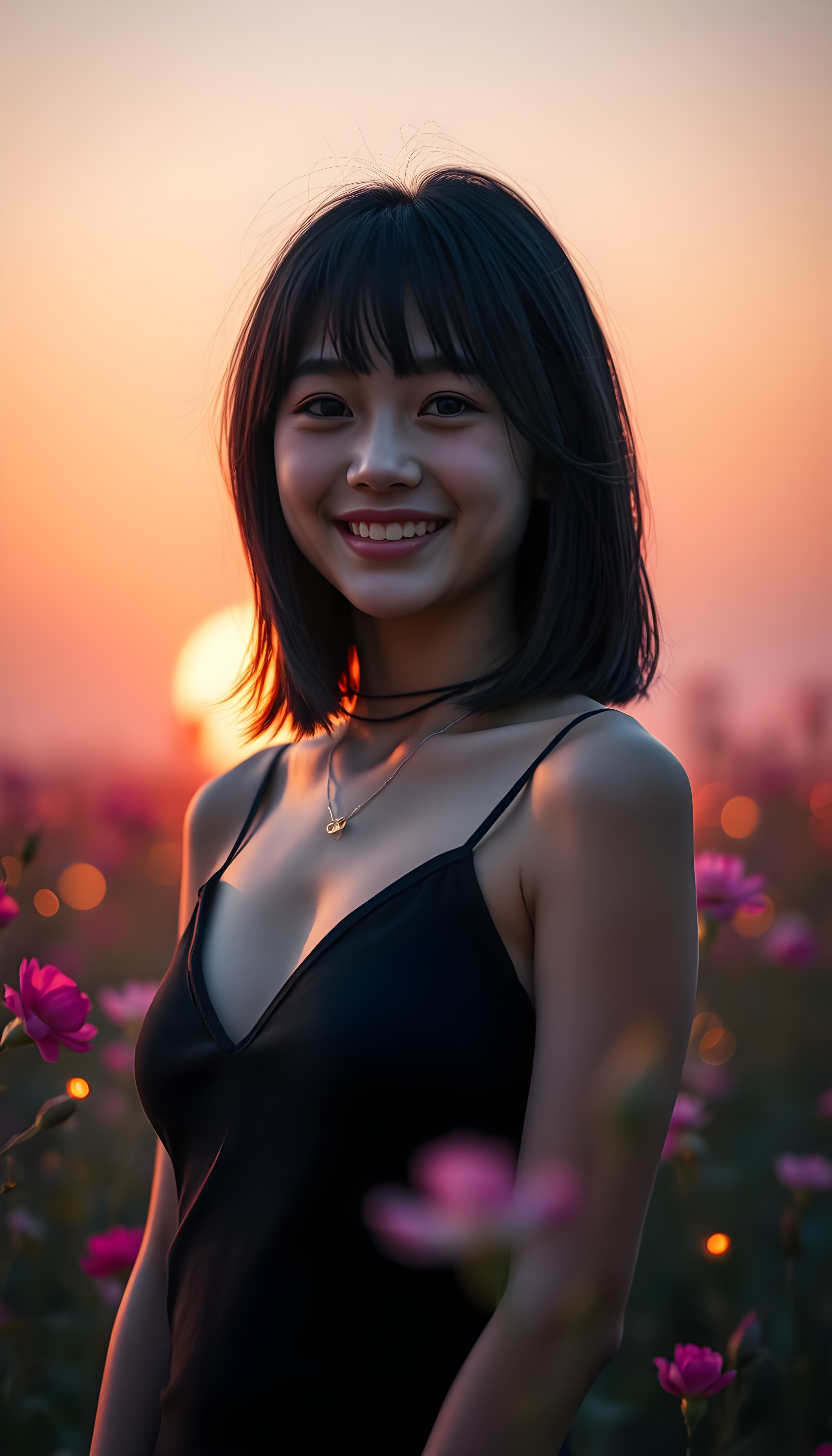 A young girl with dark, shoulder-length hair styled in a sleek bob cut, wearing a black spaghetti strap top with a deep neckline, stands confidently against a backdrop of soft, ethereal twilight. Her playful smile radiates joy, and she strikes a pose that exudes a mix of confidence and elegance. The scene is set in a surreal, dreamy landscape where vibrant, neon flowers bloom around her. The lighting is warm and golden, casting a gentle glow that highlights her features and gives the entire composition a whimsical, almost magical atmosphere. The background is a blend of soft purples and blues, with delicate, glowing particles floating around her, adding to the enchanting and ethereal feel of the image.