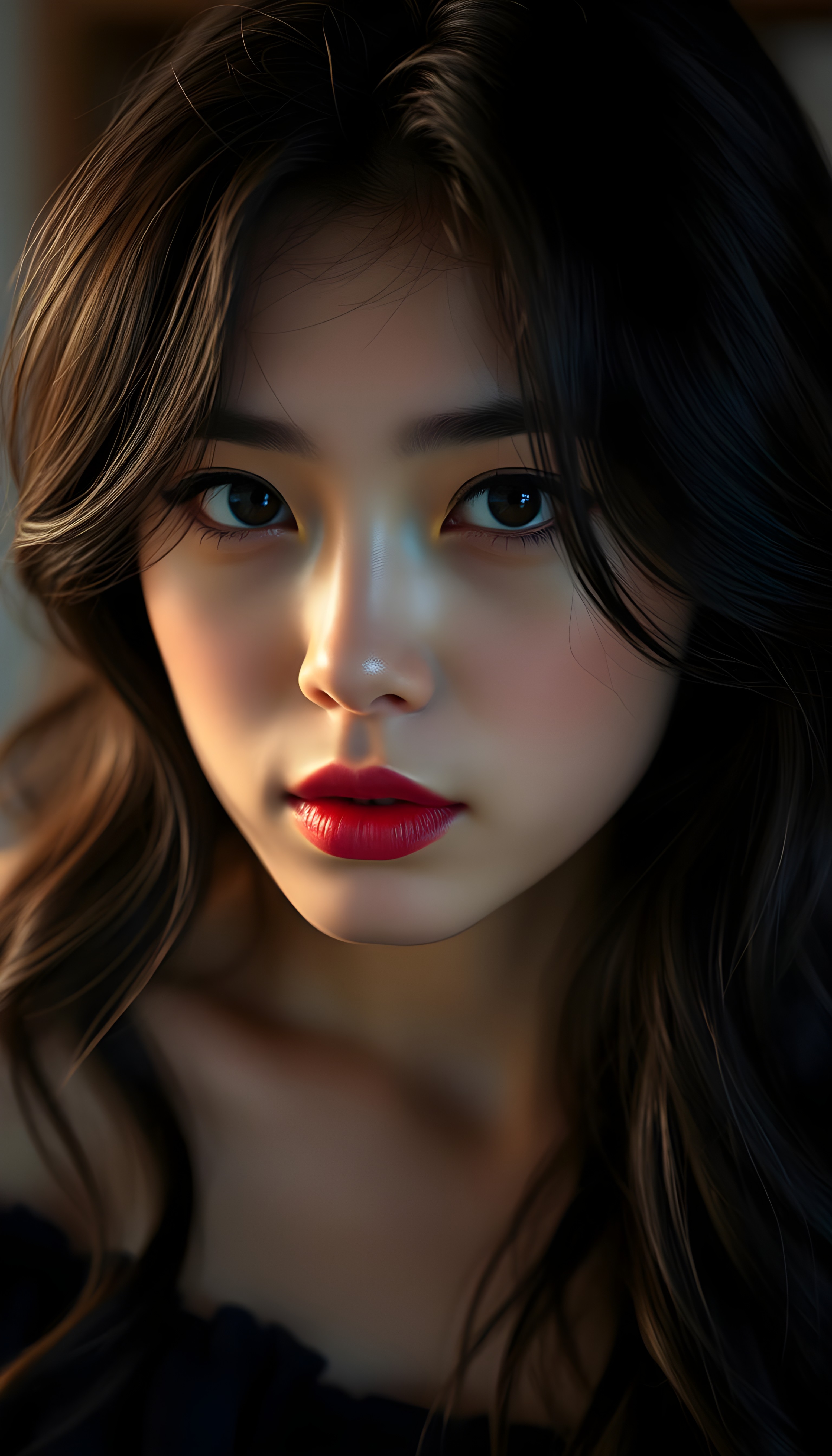 A young, pretty girl. She is stunning and gorgeous with long obsidian black wavy hair, flawless skin, red lips, dark eyes.