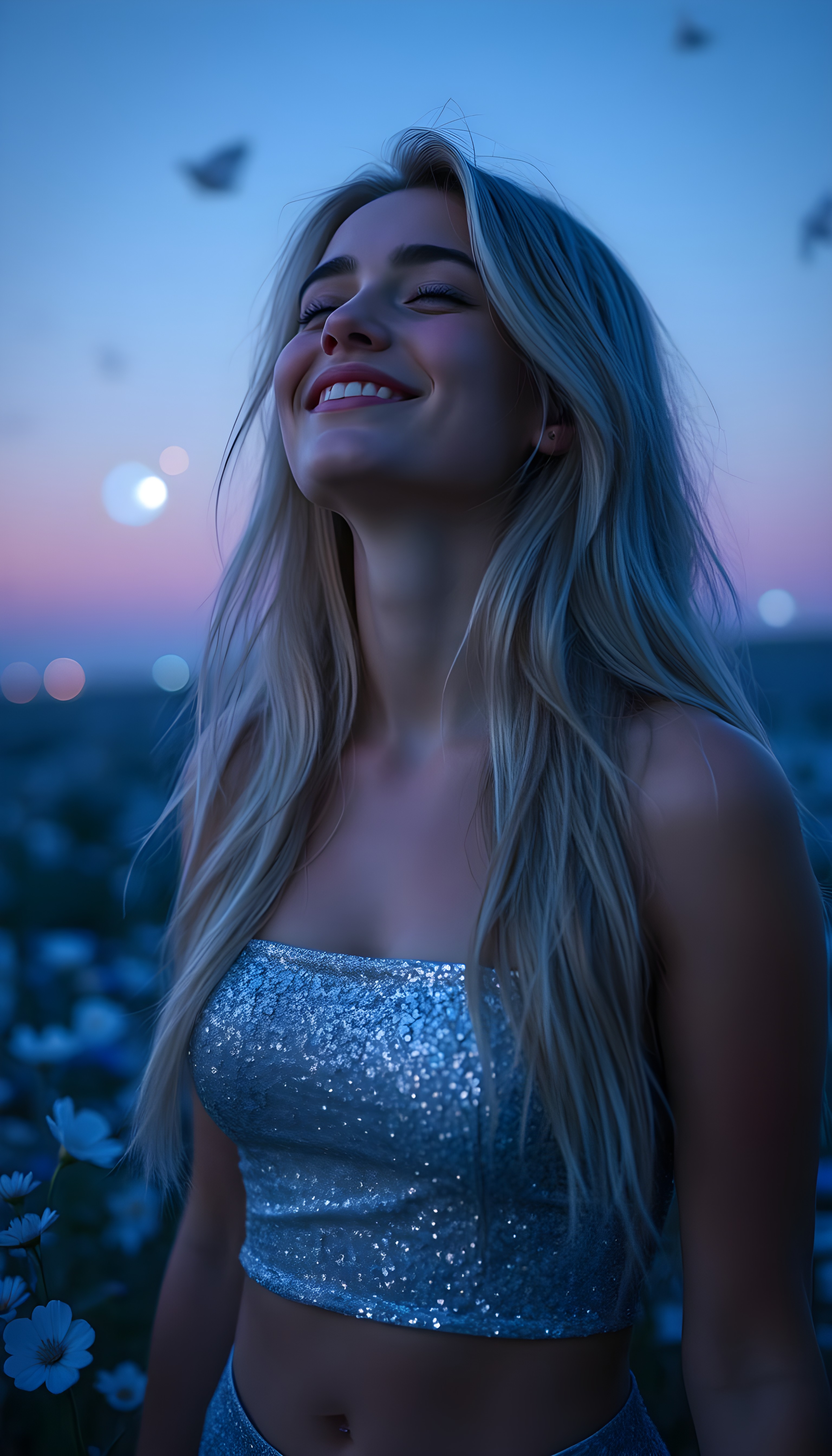 A young woman with long, flowing silver hair, wearing a shimmering silver cropped tank top, stands in a vast, ethereal field of glowing blue flowers under a starry twilight sky. Her eyes are closed in a blissful expression, with full lips slightly parted, as if in mid-laughter. The backdrop is a gradient of light blue to deep purple, with floating crystals and soft, glowing orbs adding a magical aura. The scene is bathed in a mystical, otherworldly light, creating a dreamlike and enchanting atmosphere.