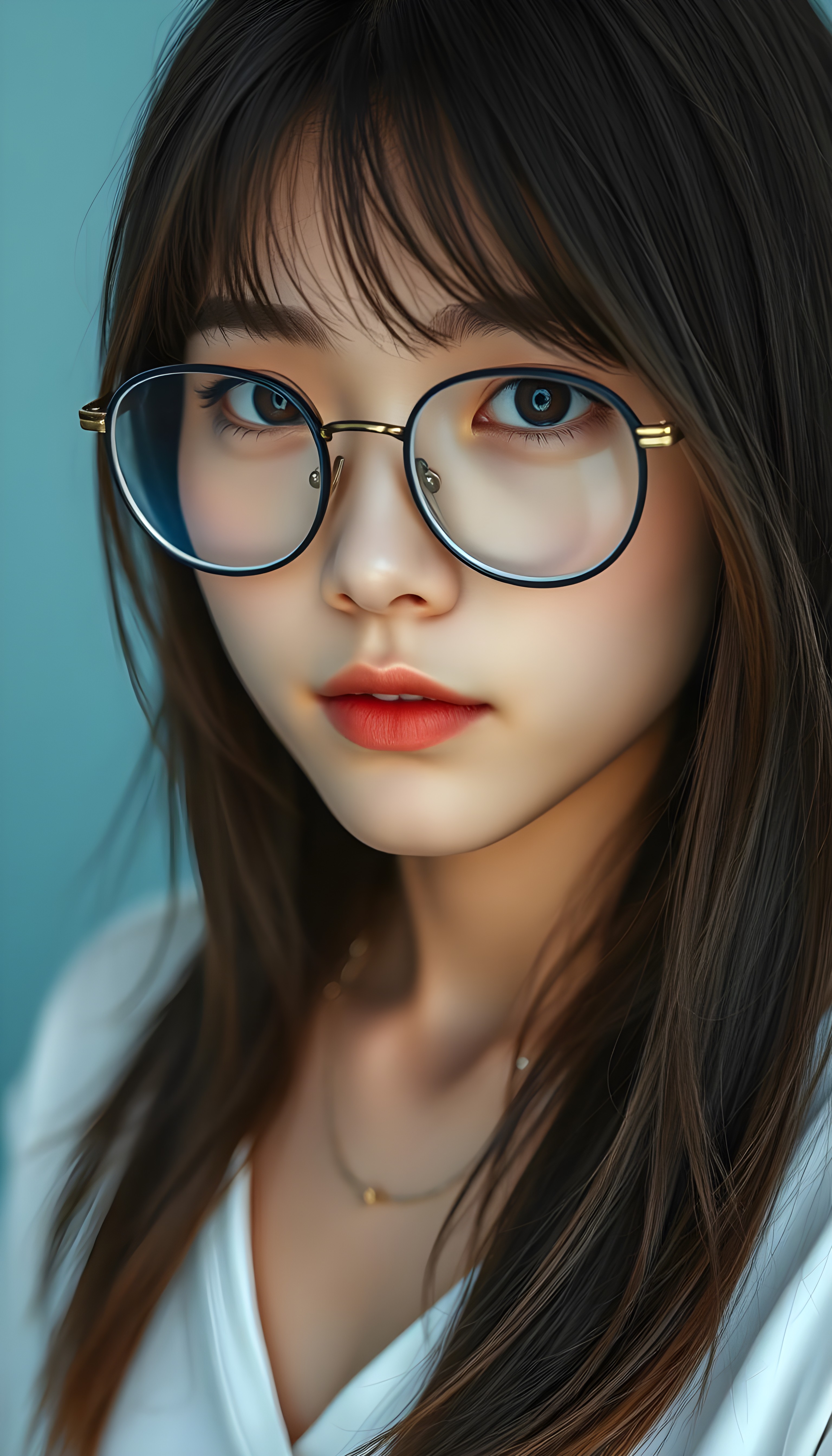 a beautiful masterpiece photo from the face, from a beautiful young pretty Japanese nerd girl, with brown shiny long straight soft hair in a perfect bob cut in the same length left and right, bangs, and round brown eyes, wearing glasses, (a white short plain t-shirt with deep v-neck), beautiful detailed full kissable plump lips, pretty face, light blue plain backdrop.